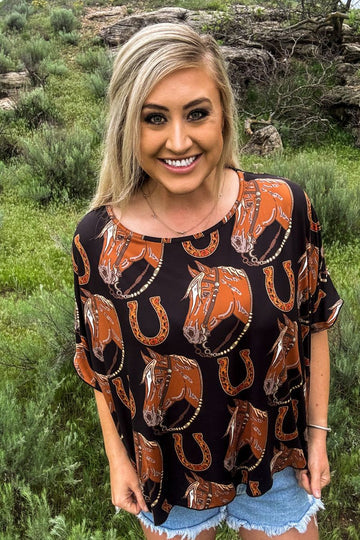 Upgrade your wardrobe with The Lucky Horse Shoe Top! Made with buttery soft, stretchy material, this cute top features an oversized fit and a playful horseshoe and horse design. Perfect for any horse lover or someone looking to add a touch of fun to their style. Don't miss out on this lucky find!