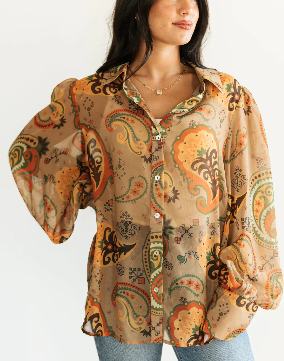 This charming blouse brings serious personality to your wardrobe with its rich brown canvas splashed with a kaleidoscope of paisley swirls in orange, green, yellow, and black. Crafted from lightweight woven polyester, it drapes beautifully with a relaxed, forgiving fit that moves with you throughout the day. The classic button-down silhouette features crisp white buttons, long sleeves with buttoned cuffs, and a gently curved hem that plays nicely whether tucked in or left loose. Perfect for layering through seasons or standing solo, this versatile piece transitions effortlessly from casual coffee runs to creative office settings. It's the kind of blouse that whispers "boho spirit" while staying practical enough for everyday adventures.