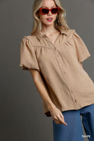 Claire Textured Woven Button Down Balloon Sleeve Top