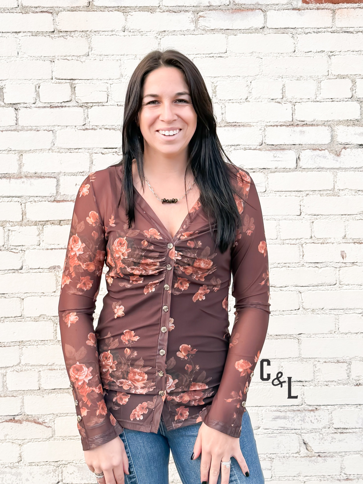 Introducing the Sonora Bloom Top—romance meets Western ease. BiBi’s long-sleeve mesh button-up showcases painterly florals on a brown backdrop—tones of rust, green, and dark peach that style beautifully with denim, leather, or satin. A V-neckline and clean button placket keep it polished, while the soft, stretchy mesh drapes smoothly for day-to-night wear. It’s semi-sheer, so layer over a nude or tonal cami for effortless coverage.