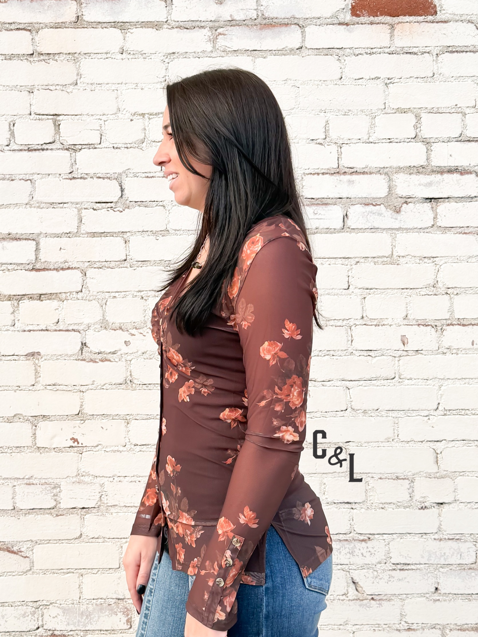 Sonora Bloom Mesh Button-Up Top by BiBi – Brown Floral | V-Neck, Long Sleeve