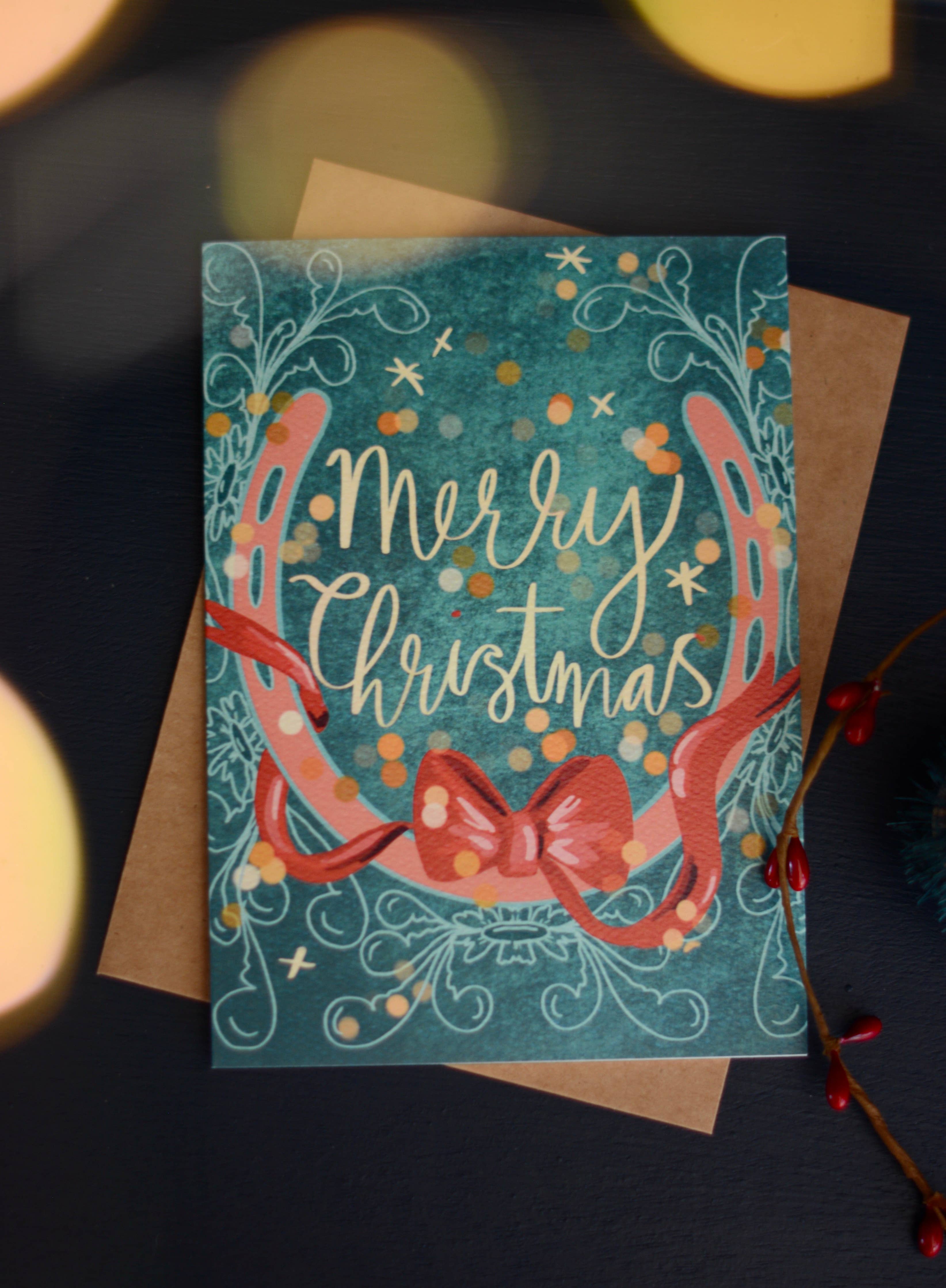 - Do you have any Christmas-themed cards? Yes. Our Christmas at Home collection includes a variety of holiday cards with beautiful Western-themed designs, such as Santa on his sleigh with reindeer, festive barns, and other unique illustrations that are perfect for sending to loved ones
