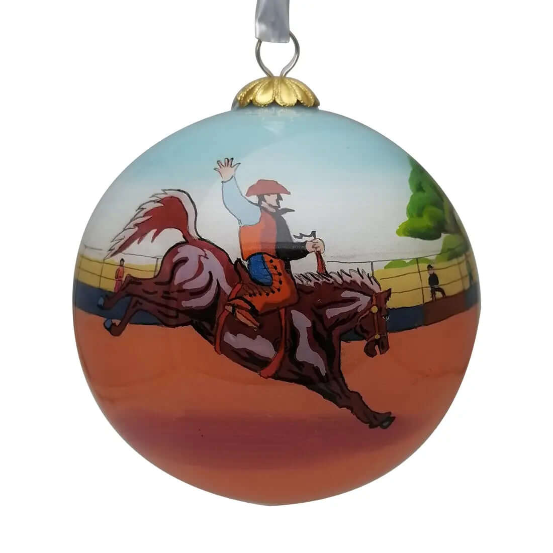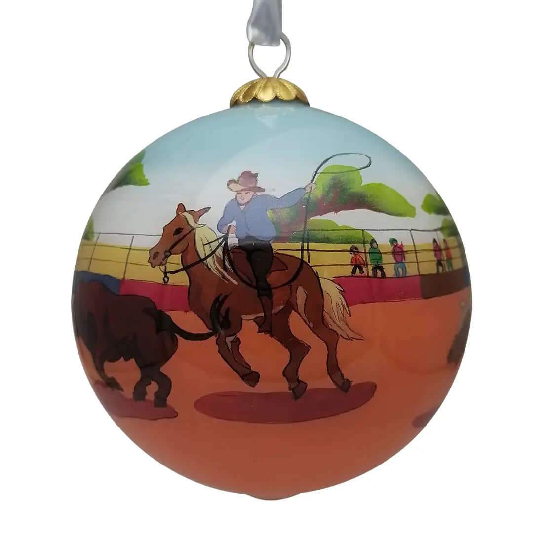 This 3" round ornament is hand-painted on the inside! No two are exactly the same. The painting process for each item takes three days to complete. Each ornament comes in a silk-covered gift box padded to cushion it inside. The color of the box is coordinated with their design.