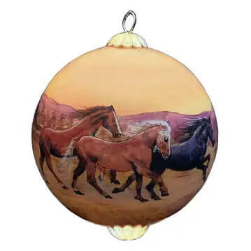 This 3" round ornament is hand-painted on the inside! No two are exactly the same. The painting process for each item takes three days to complete. Each ornament comes in a silk-covered gift box padded to cushion it inside. The color of the box is coordinated with their design.