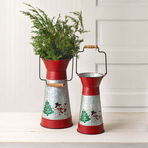 These cheerful containers have a snowman and a tree that says ''Baby it's cold outside''. The large measures 6½'' dia. x 14''H. The small measures 5¼'' dia. x 11½''H.
