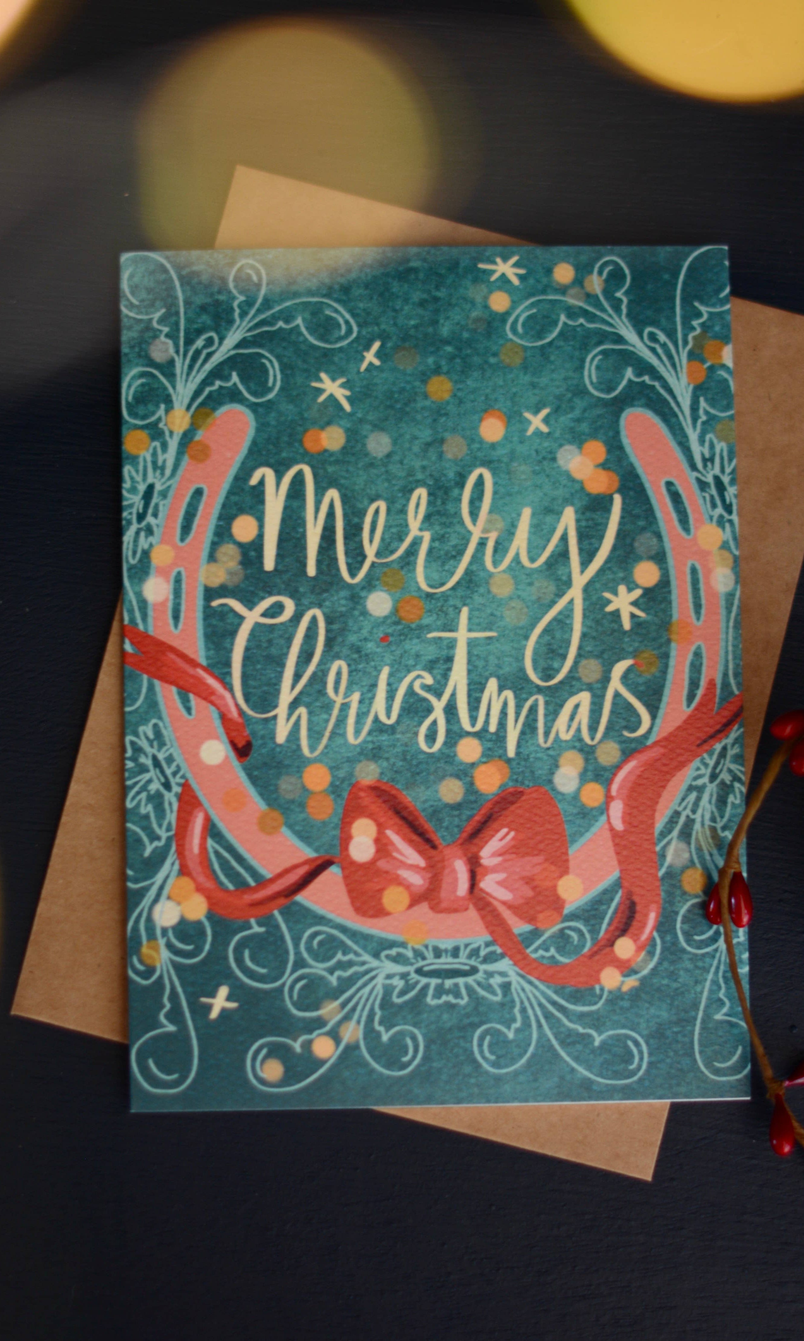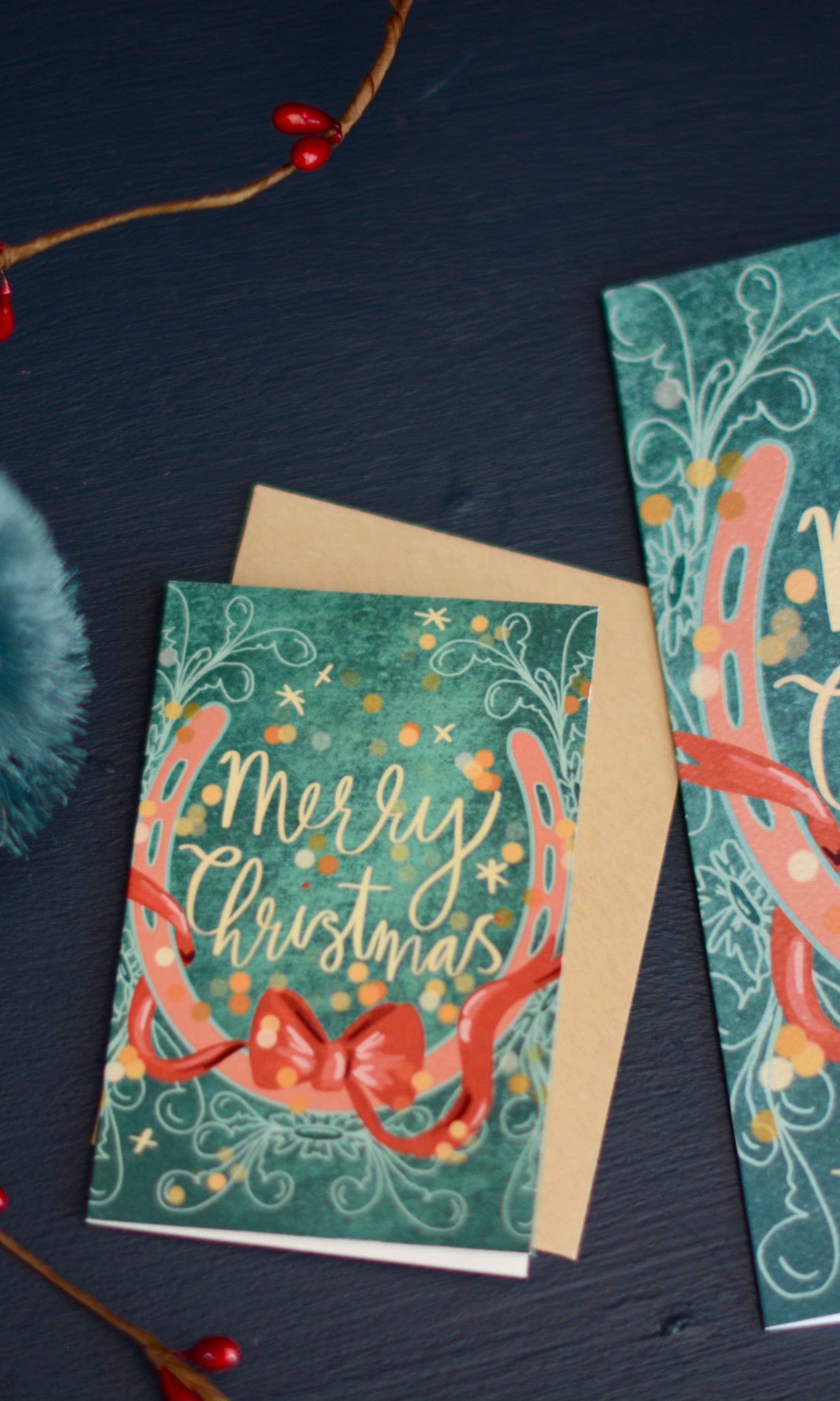 - Do you have any Christmas-themed cards? Yes. Our Christmas at Home collection includes a variety of holiday cards with beautiful Western-themed designs, such as Santa on his sleigh with reindeer, festive barns, and other unique illustrations that are perfect for sending to loved ones