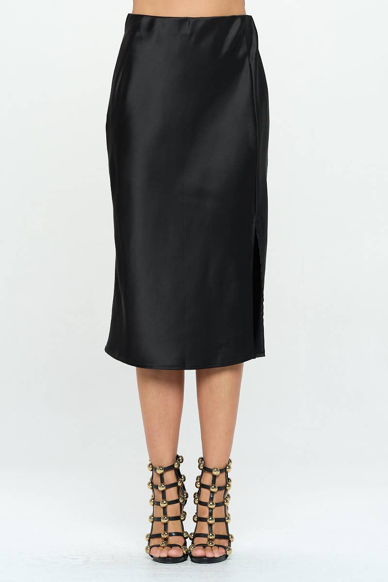 Black Made in USA Solid Satin Midi Skirt with Slit