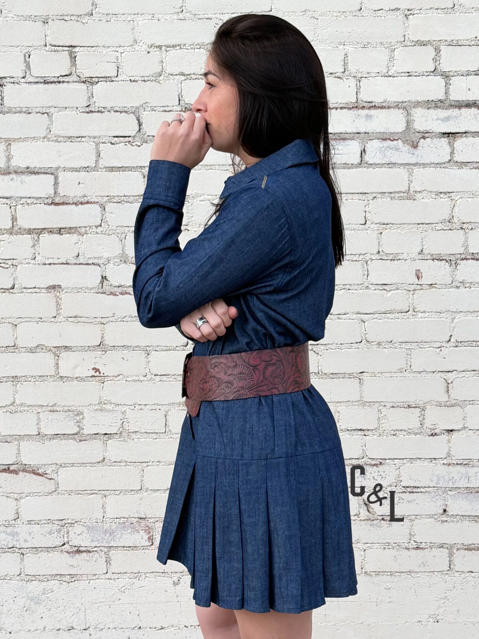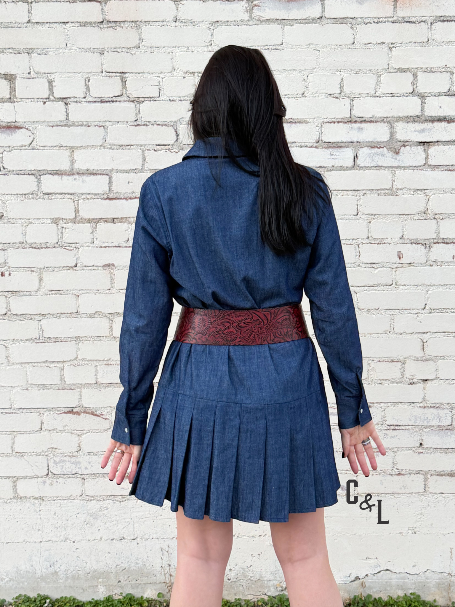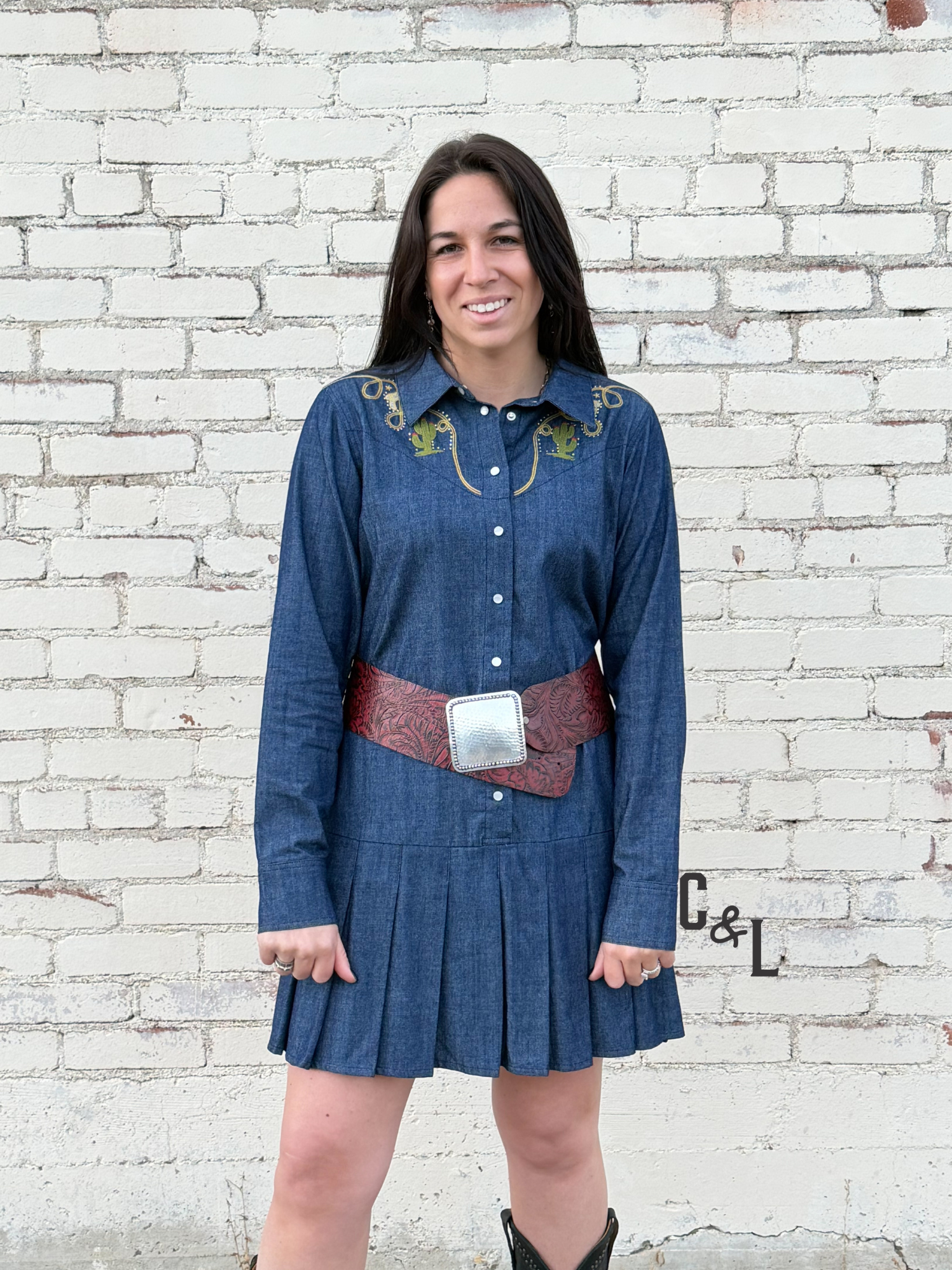 Prairie Crest Embroidered Denim Dress — Long Sleeve Pearl-Snap, Drop-Waist Pleats (Dark Denim)