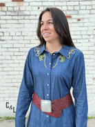 Meet your new wear-everywhere Western dress. This long-sleeve denim beauty features a classic embroidered yoke and pearly snaps, finished with a relaxed drop waist and softly pleated skirt for easy movement and timeless cowgirl charm.
