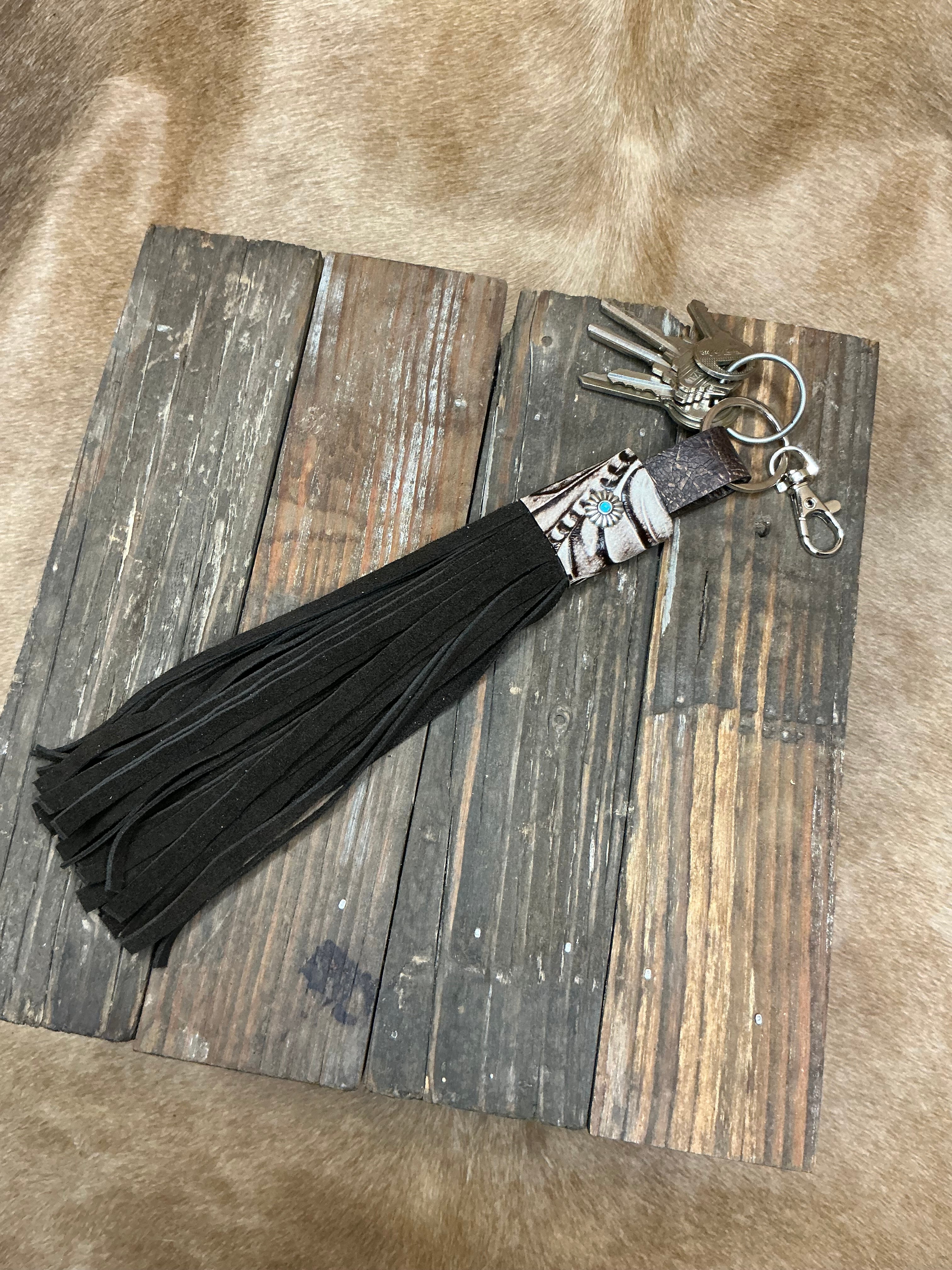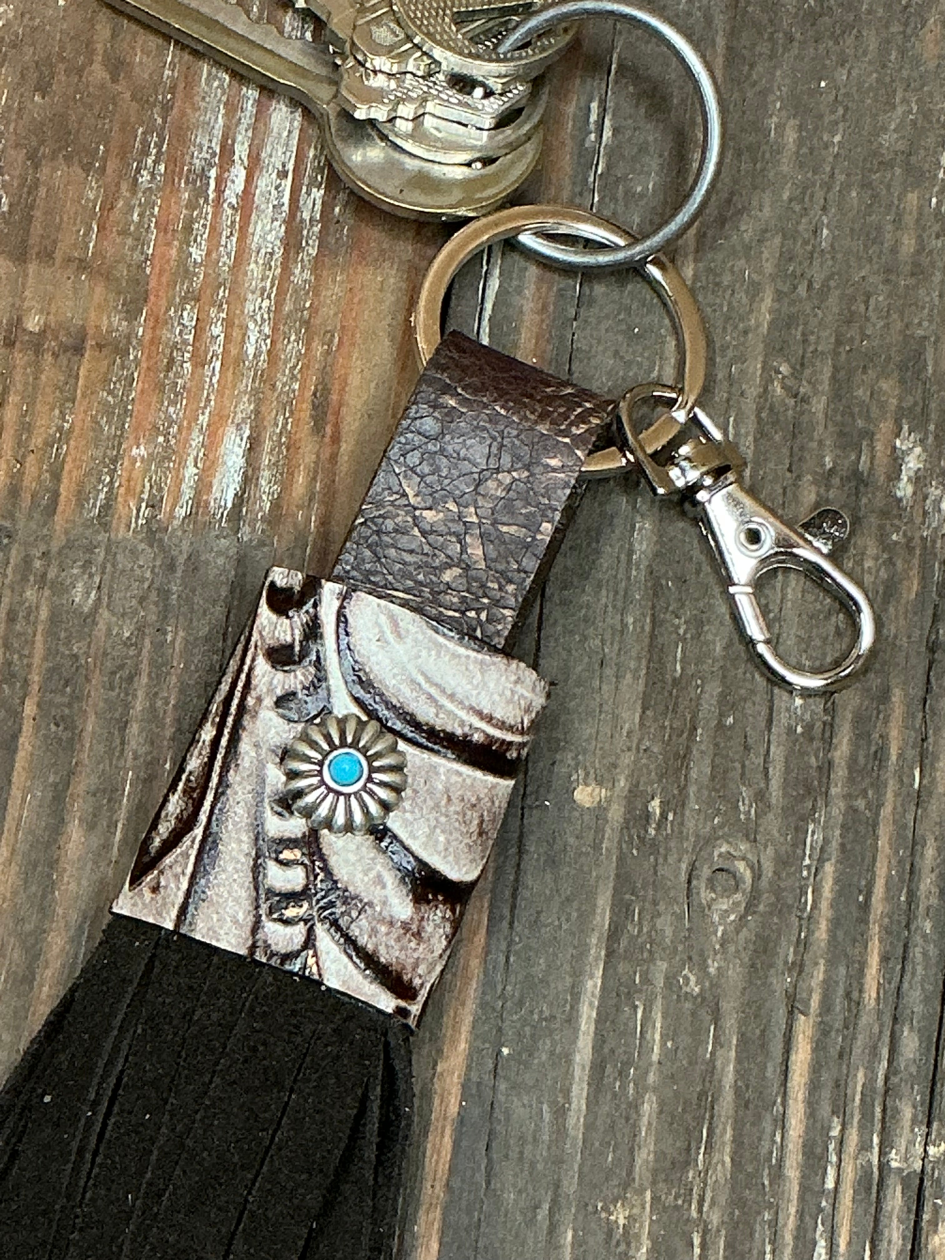 Indulge in the rustic allure of our Handcrafted Leather Tassel Keychain. Expertly fashioned from premium materials, this accessory exudes timeless charm with its hand-cut dark brown calf suede fringe, delicately swaying with every movement. The brown and ivory floral embossed leather adds a touch of exotic flair, enhancing the keychain's visual appeal and texture. A silver concho with a touch of turquoise serves as the perfect finishing touch, infusing the piece with a hint of rugged elegance. Elevate your everyday essentials with this meticulously crafted keychain, a symbol of craftsmanship and style.