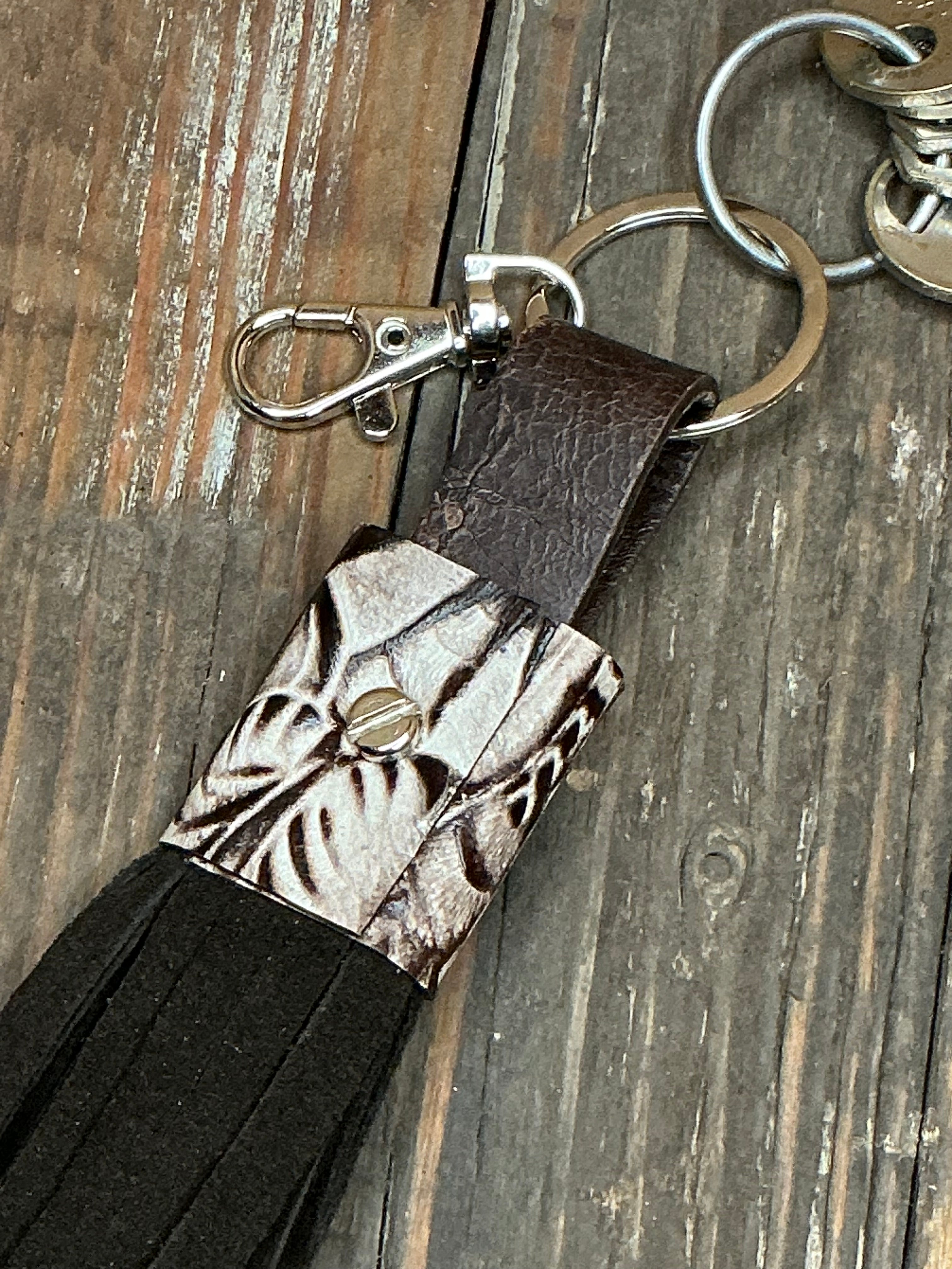 Brown and Cream Floral Western-Inspired Handcrafted Leather Tassel Keychain
