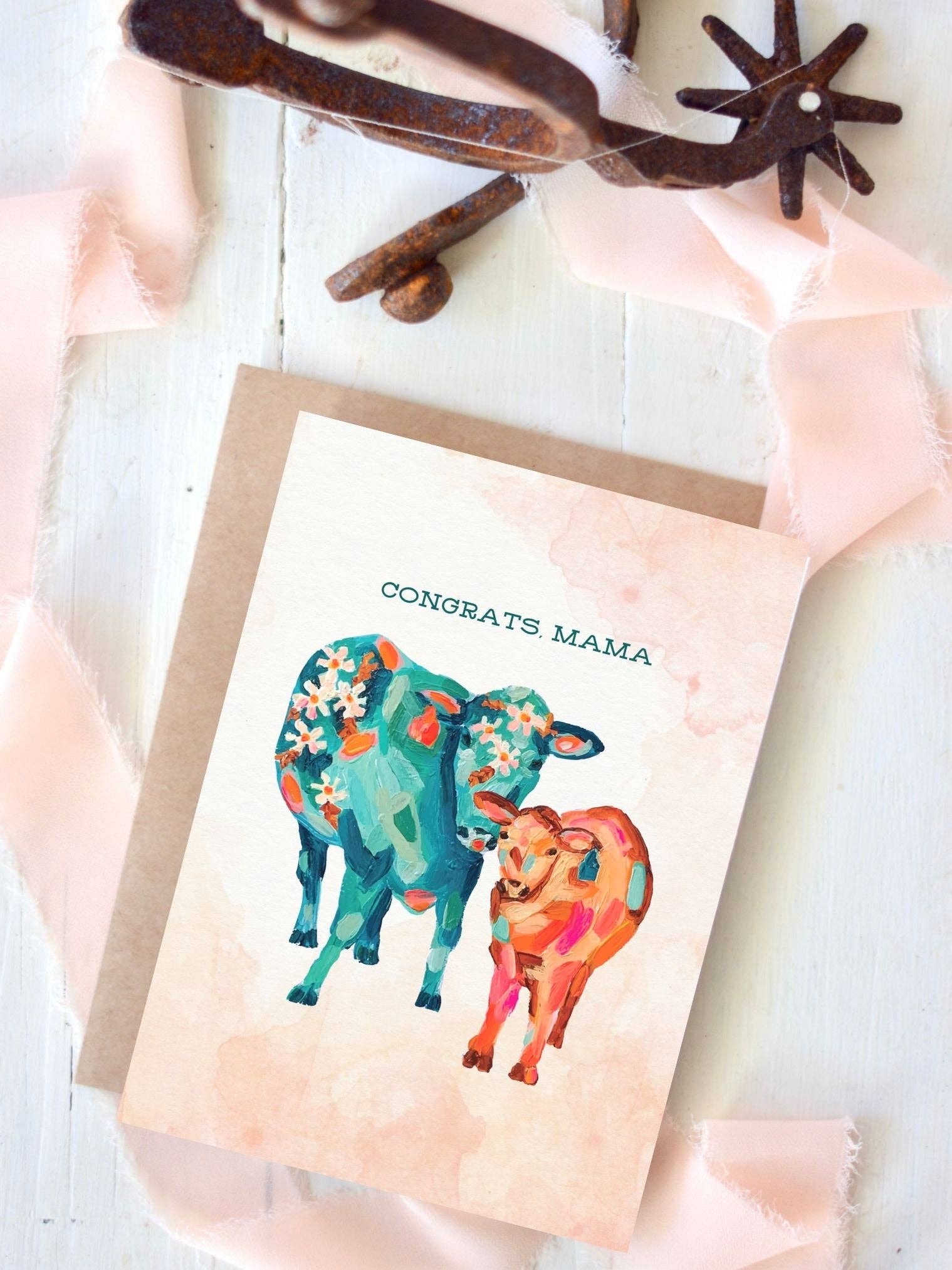 Cow Greeting Card Baby Shower Card, Cow Card, Western Greeting Card. A perfect way to say congrats to the mama in your life. New Mama Mother Card Details: * The front of the card reads: "congrats mama" * Blank Inside * The 4x6 card is designed and printed in Bend, OR * Comes in a protected sleeve * A Kraft envelope is provided