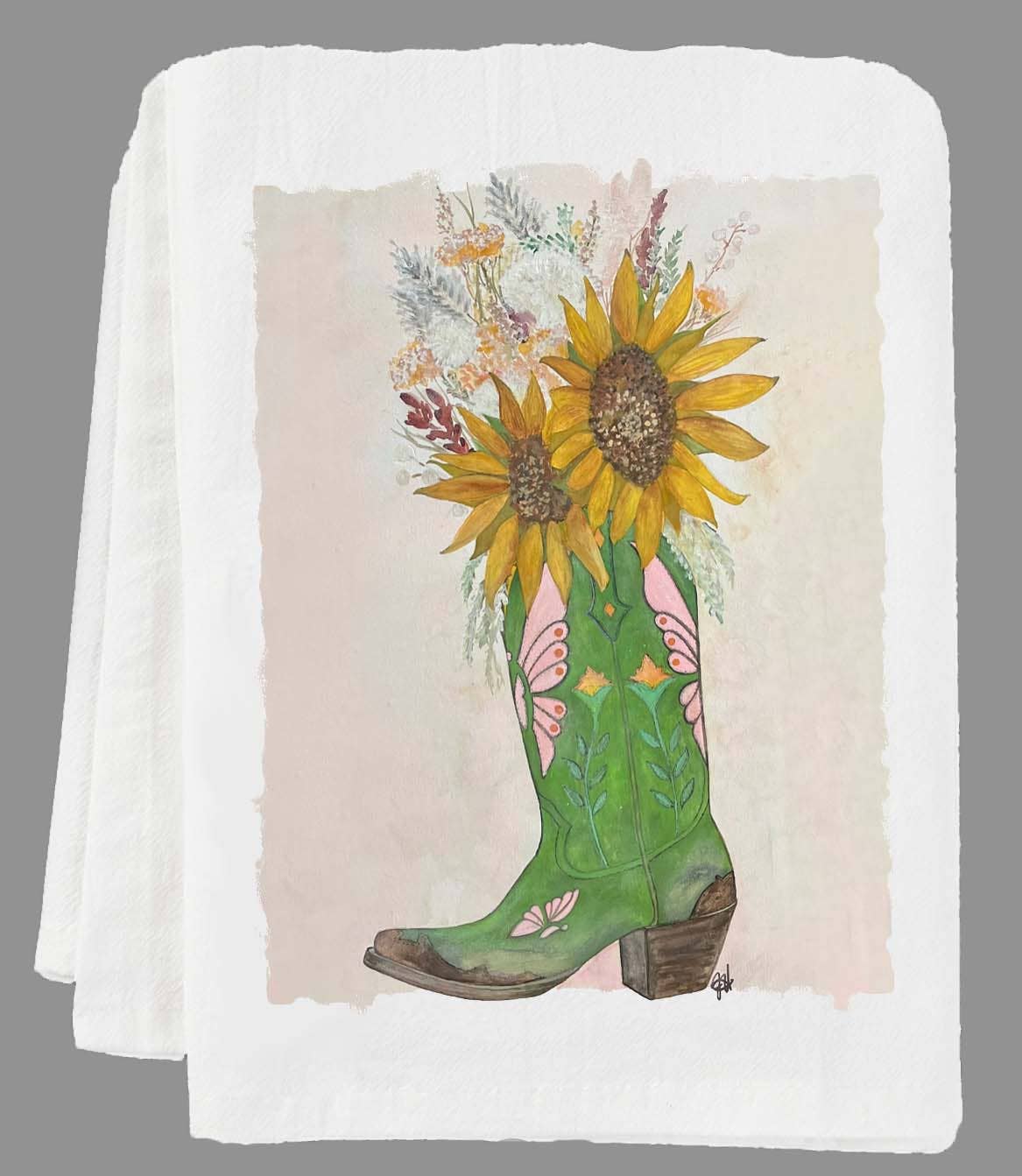 Add a splash of fun to your kitchen with this playful "Flowers ta Boot" tea towel. Featuring charming watercolor Western art by Jodi Hatfield, it’s perfect for drying dishes or brightening up your space with a touch of rustic country style.