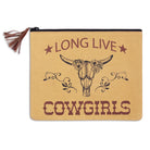 Perfect for stashing your makeup, toiletries, or even a small tablet, the Long Live Cowgirls bag combines durability with style. It’s crafted with a zippered top, ticking stripe lining, and a faux leather tassel pull, adding a touch of rustic flair to your daily essentials. Whether you’re hitting the road, the rodeo, or just heading out for the day, this bag keeps your cowgirl spirit front and center.
