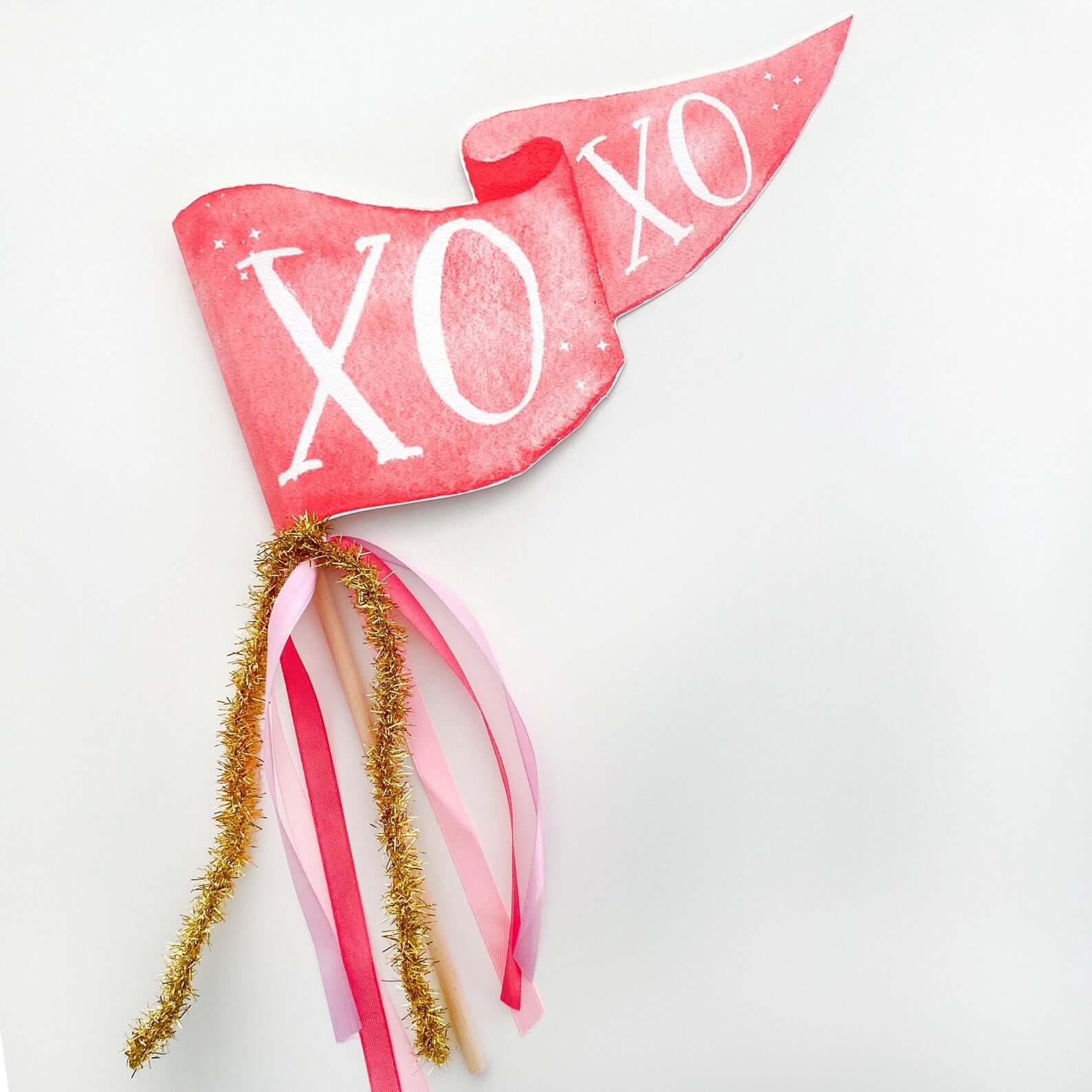 Party Pennants are so fun for Valentine's Day party props. Three cheers for you: hip, hip, hooray! This flag adds joy to any day. Hold it in a photo or pop on a cake. Wave it with glee & give the ribbons a shake. A celebration with flair is more fun, isn’t it? Let the merriment begin with this cute party pennant! DETAILS • Pennant flags are approximately 10" x 5" on a 12" wooden dowel and come fully assembled. • Pennants are made of 120 lb. luxe watercolor texture paper with original watercolor illustration for extra whimsy. • Ribbon selection may vary. • Packaged beautifully in 11x14 cello sleeve with backer.