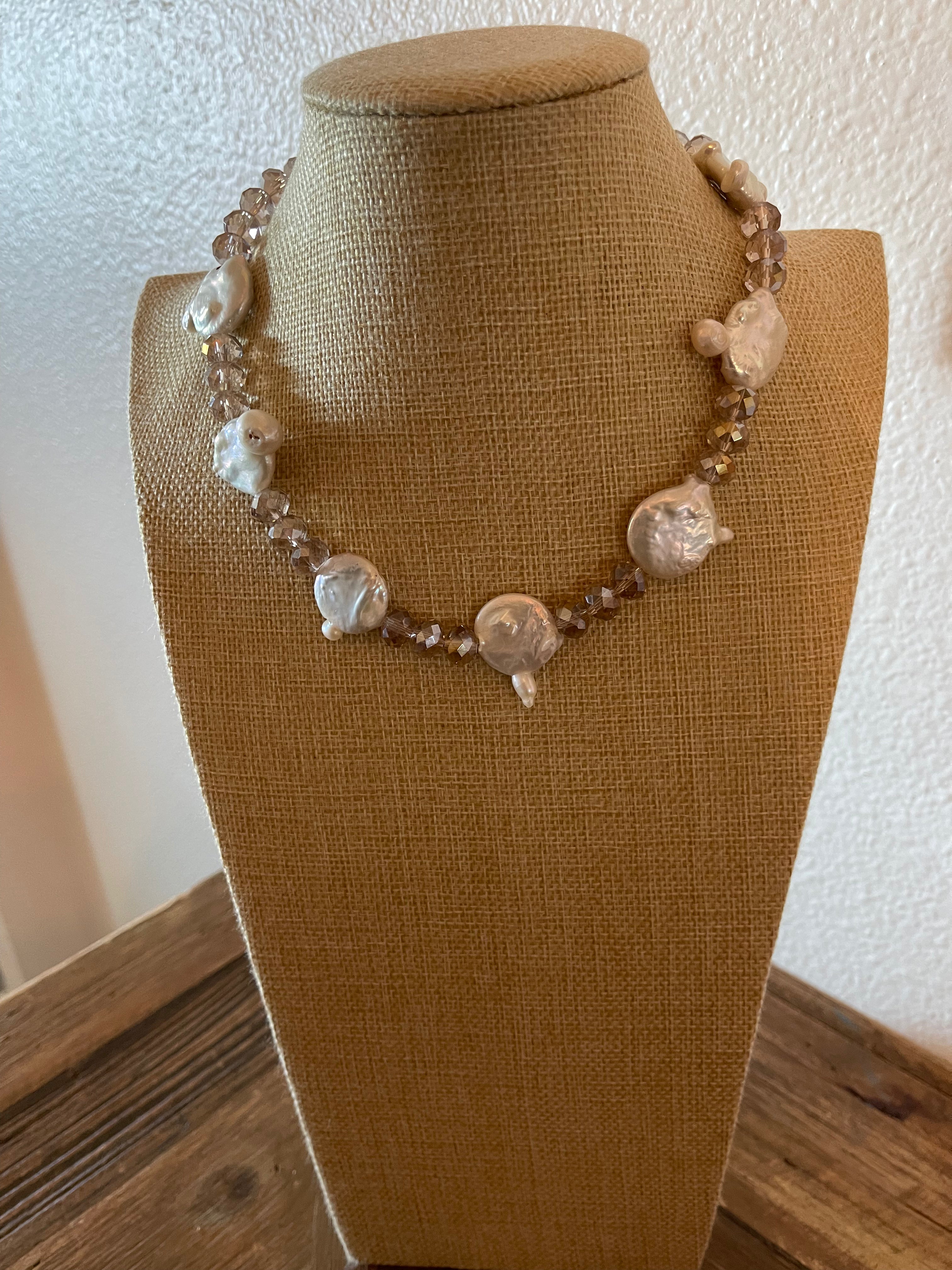 Materials: Natural freshwater coin pearls, 10mm champagne glass crystal beads, jewelry findings