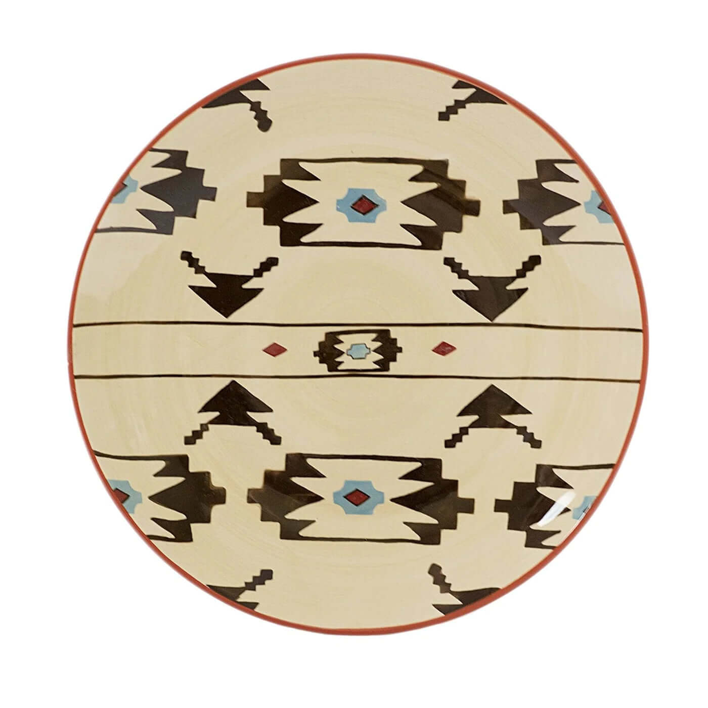 Attractive Artesia serving platter features geometric Southwestern designs in chocolate, turquoise and red on a cream background. Coordinating pieces available separately. Sold as a single serving platter. Each unit measures approximately 1.5"H X 12.75" Dia. Hand wash as needed.