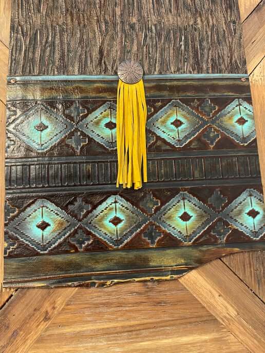 This Handcrafted Dark Brown, Turquoise and Copper embossed leather table runner is so striking! The dark brown with copper accents embossed leather body of the runner is accented with Turquoise and brown hand paint embossed leather ends that have a natural raw finished edge. The copper concho's with hand cut mustard yellow fringe tassels complete this runner. This runner will add so much to your table. It is easy to clean, simply just wipe off any spill with a damp cloth. Only use water to dampen the cloth for cleaning up spills. This cowhide leather embossed table runner will last for years.