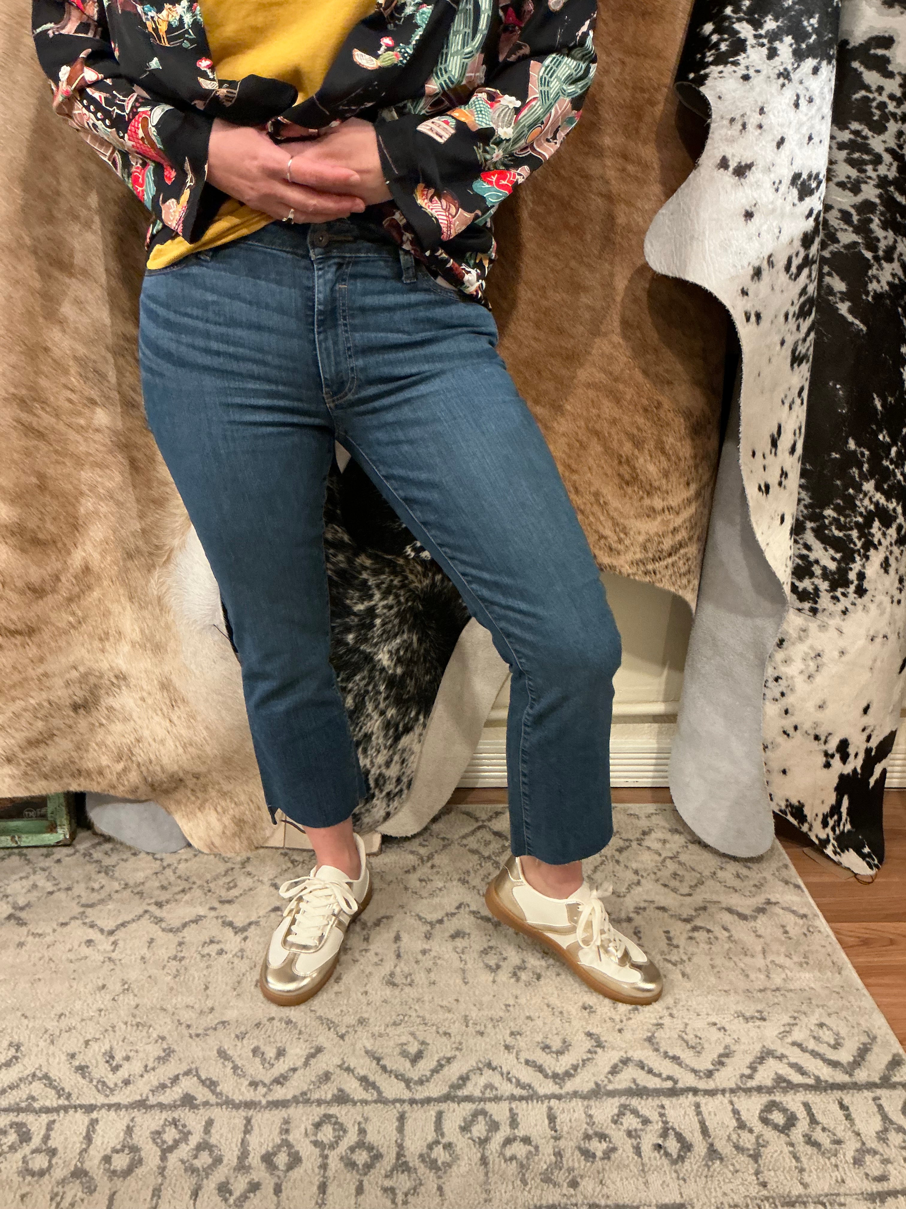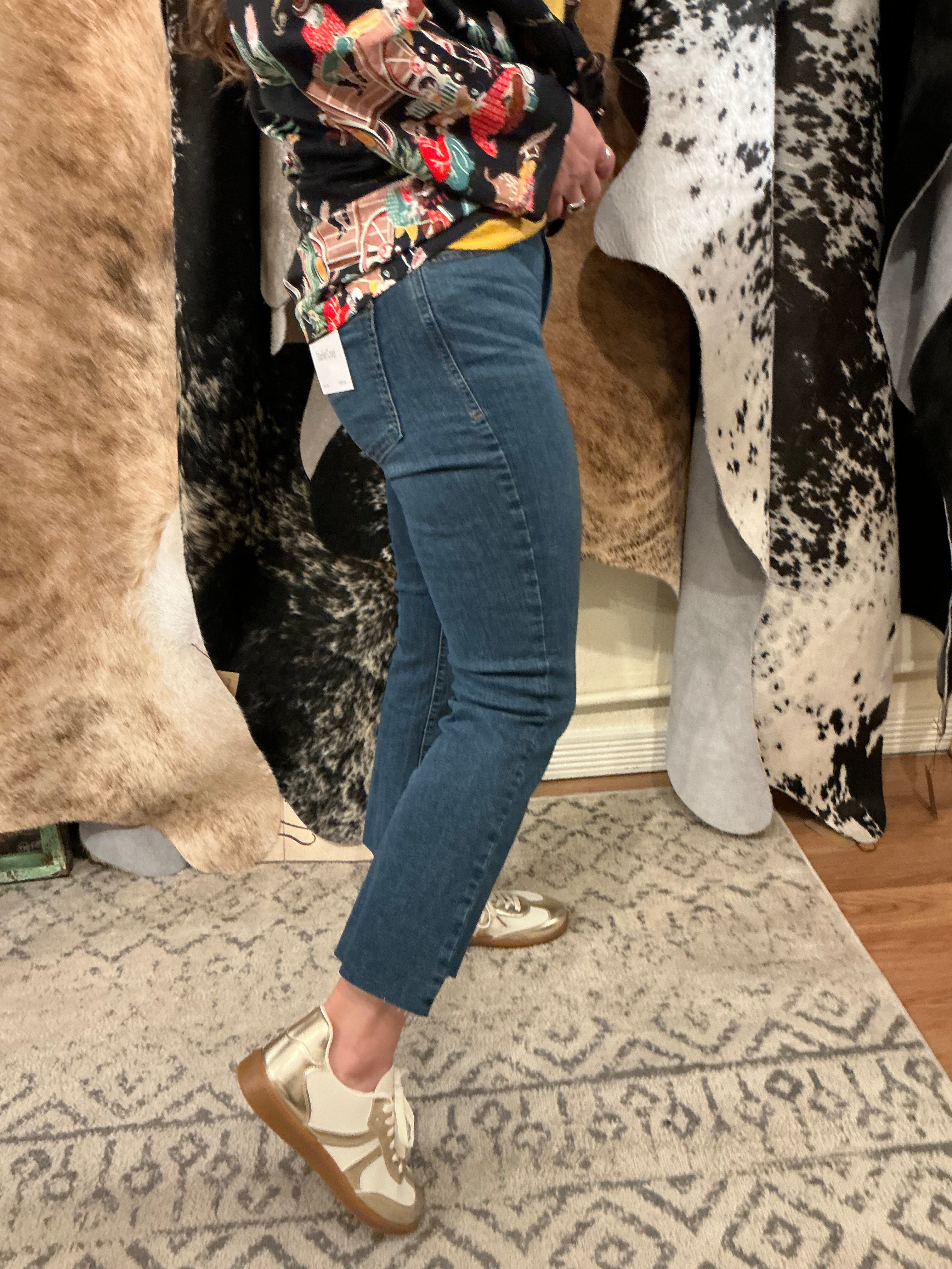 - What are some of the design details on the Caite & Kyla jeans? The Ina Straight Leg Jean by Caite & Kyla is known for its artistic and unique touches. These jeans have delicate embroidered details on both the front and back pockets, giving them a boho-chic feel that makes them stand out from standard denim.