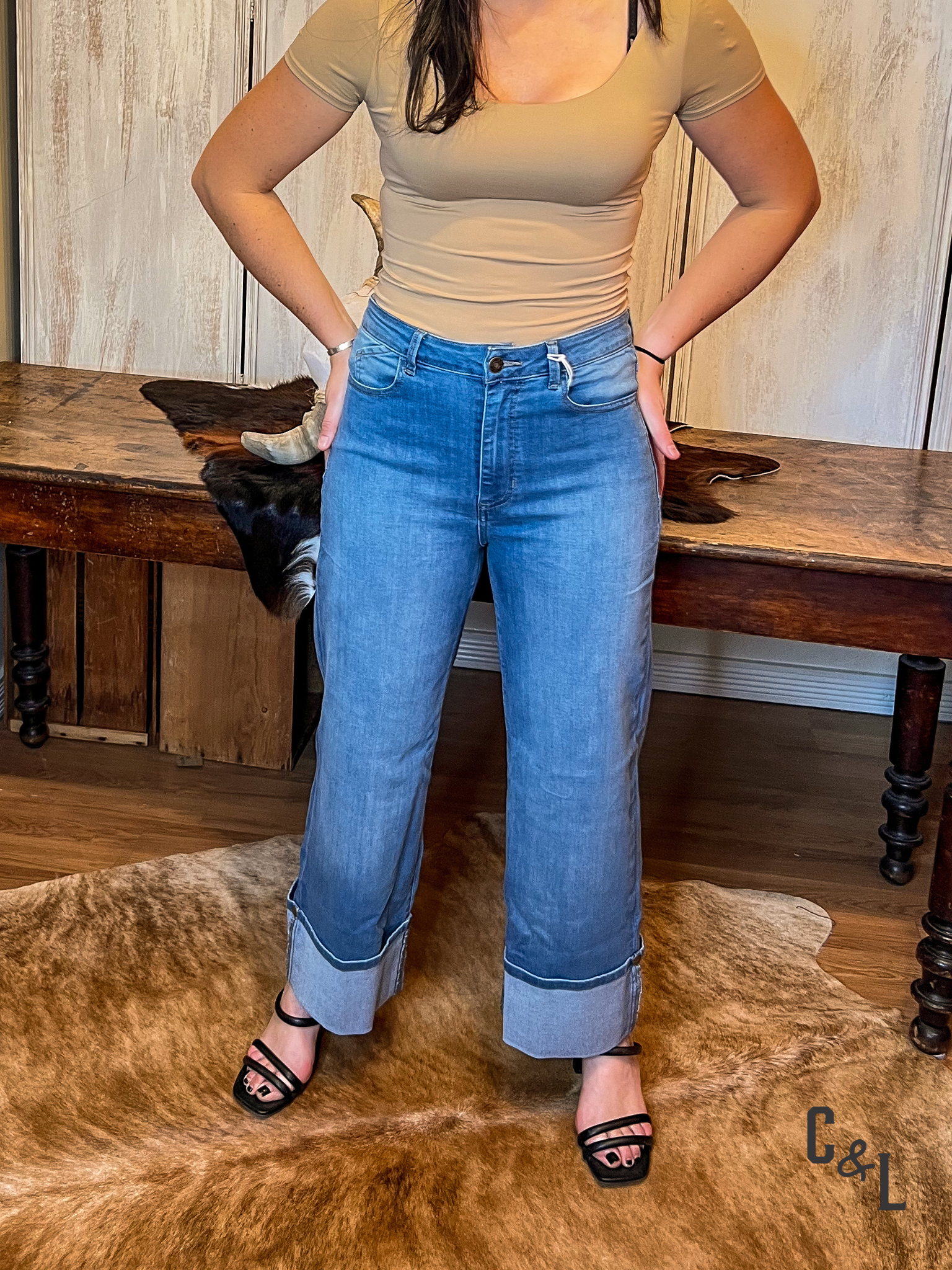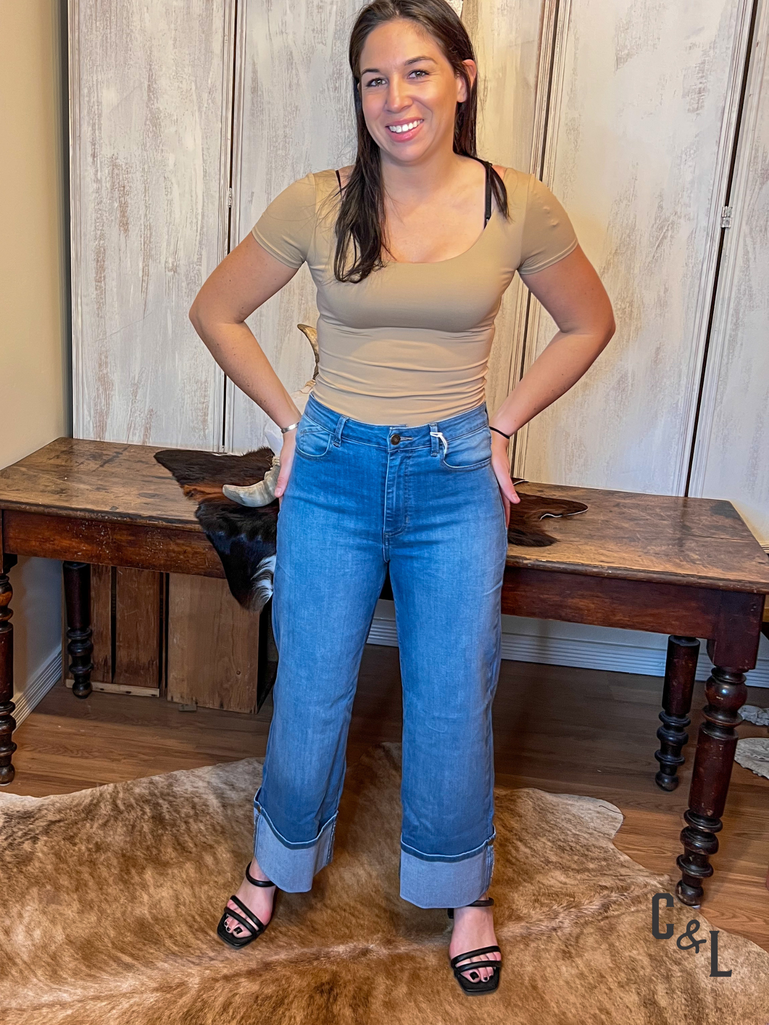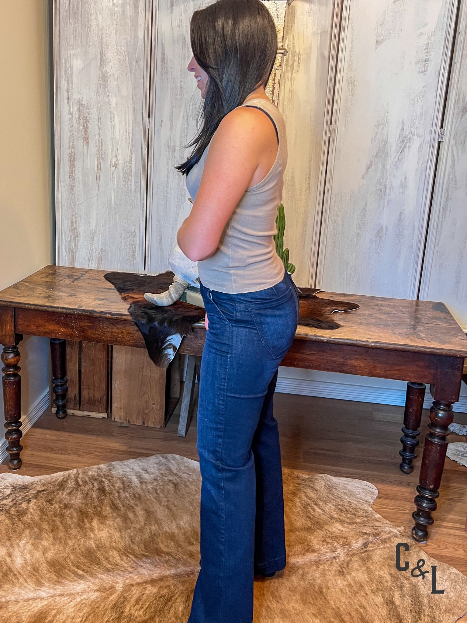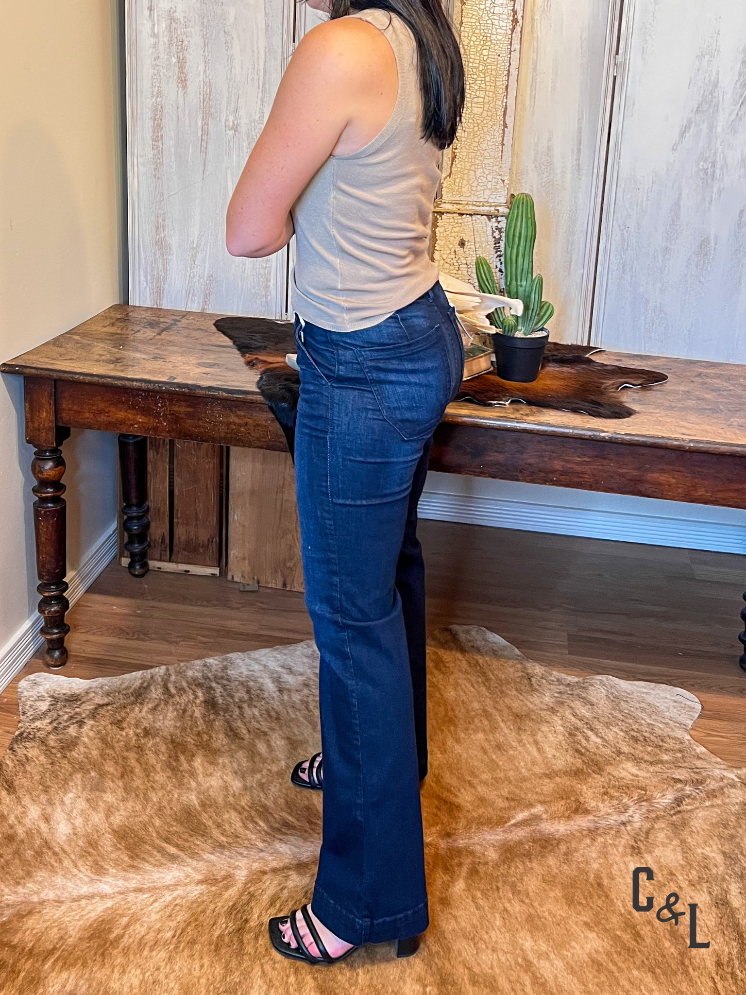 - Tell me more about the style and features of the Florez jeans. Our Florez collection includes two distinct styles. The Florez Sophia Studs Straight Leg Denim is a classic mid-rise, straight-leg jean with a comfortable, flattering fit and unique stud embellishments. The Florez Ana Flared Denim is a high-waisted, wide-leg jean that creates a sleek, polished silhouette. Both styles are made from comfortable, stretchy denim.