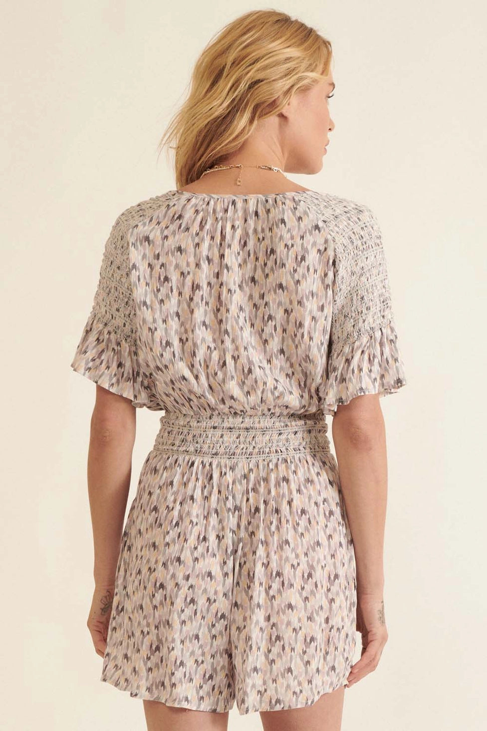 Experience country vibes in this abstract-print woven romper! With a V neckline and tie closure, short raglan sleeves featuring smocked detail and ruffle cuffs, and a button-front closure with pearly buttons, this romper is perfect for any music festival. The smocked elastic waist and side seam pockets add both style and function. Throw on a belt, grab your boots and denim jacket, and get ready for a daring adventure!