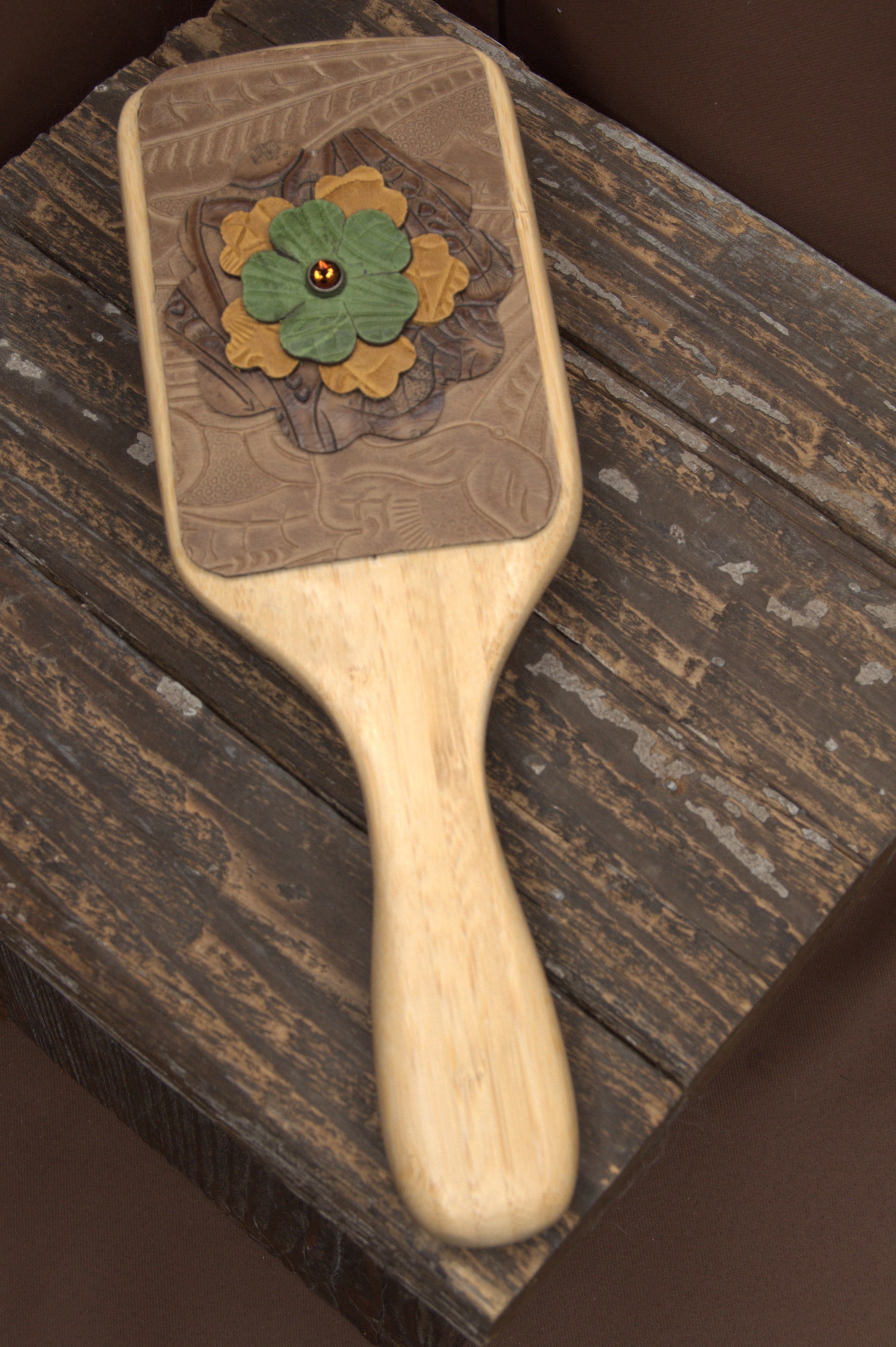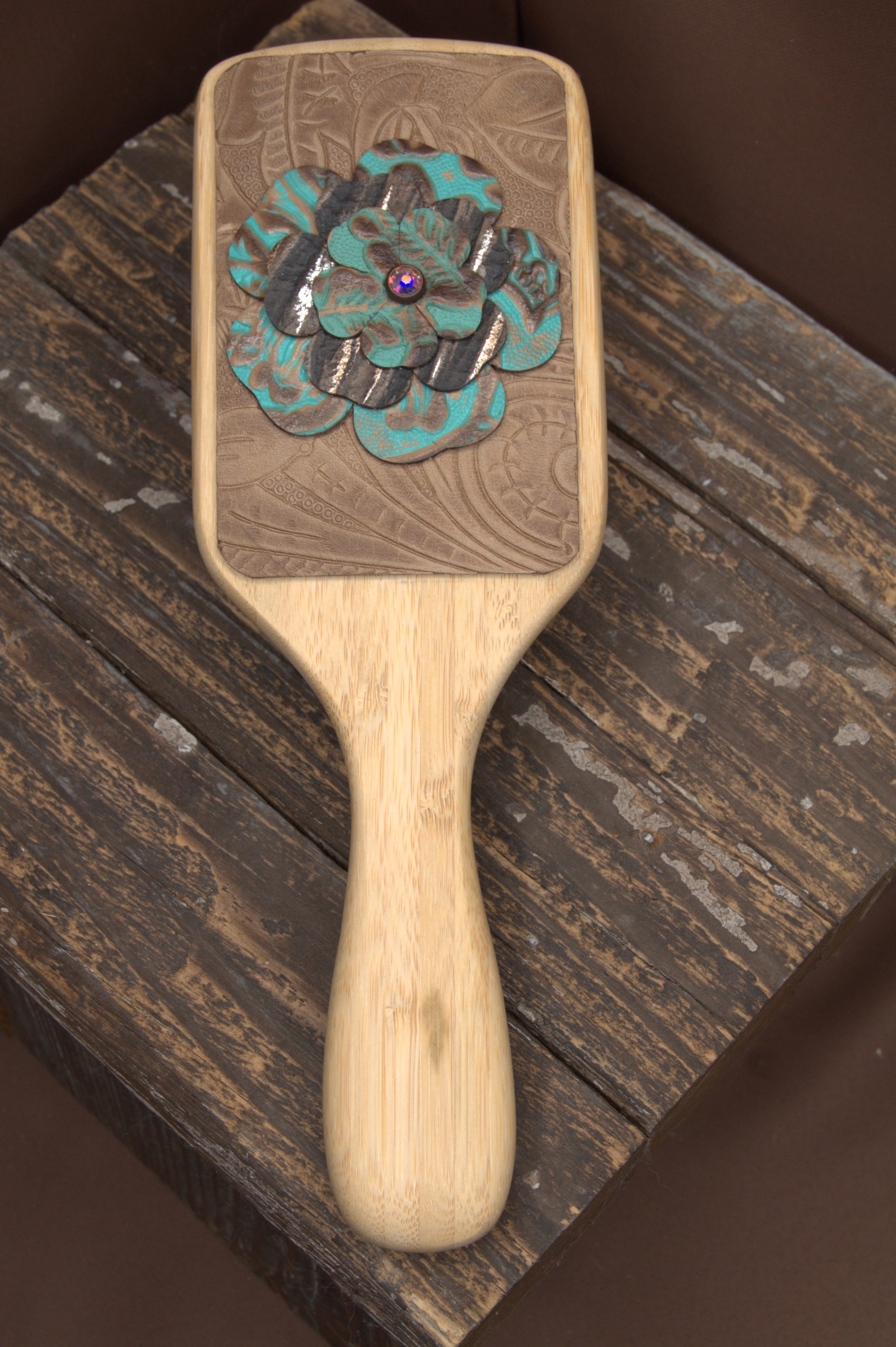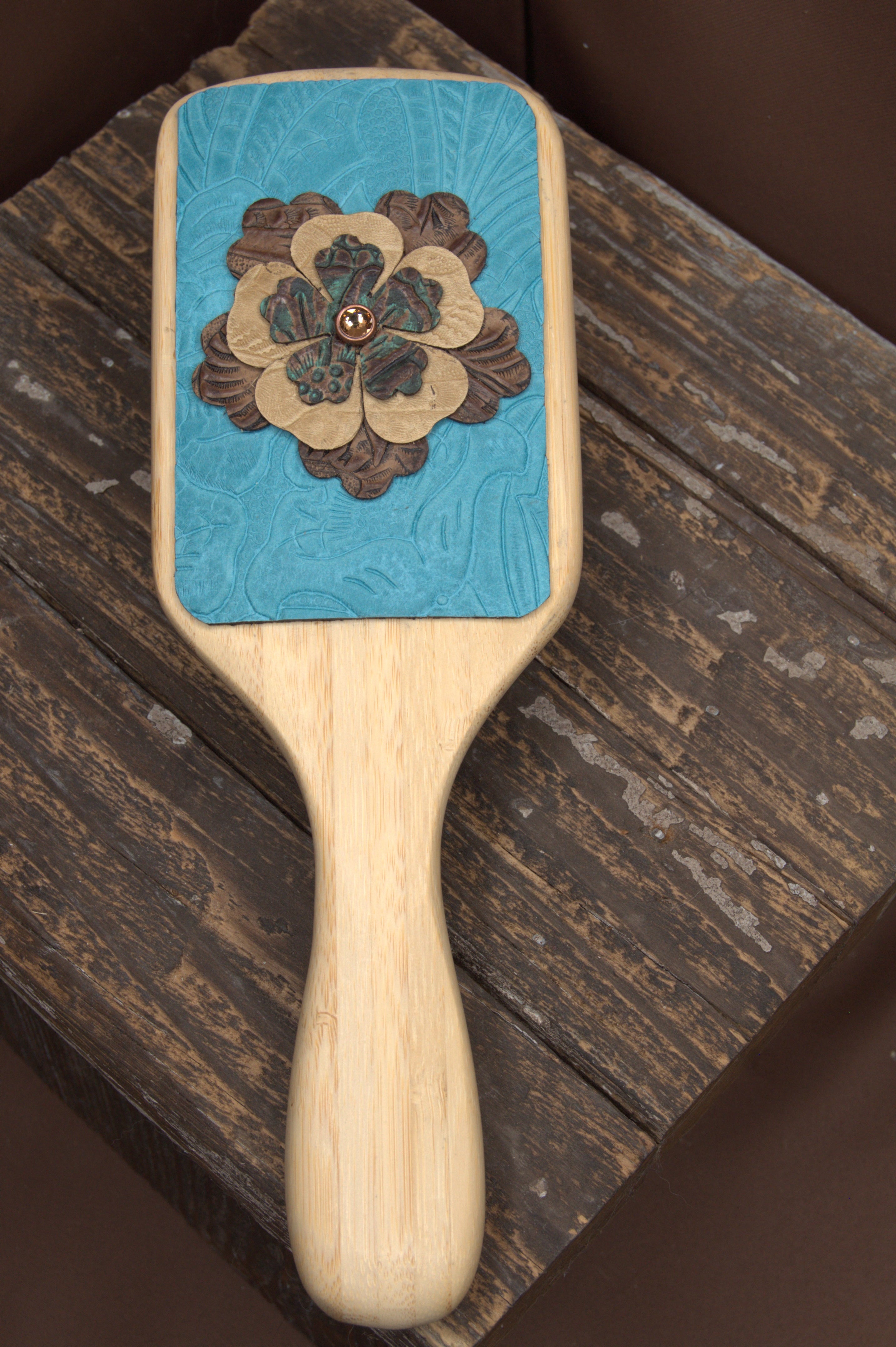 - How should I care for my leather-embellished hairbrush? To keep your handcrafted hairbrush in great condition, avoid getting the leather wet. Store it in a dry place to prevent damage to the leather or embellishments. You can gently clean the bristles as you normally would, but be careful not to use water or cleaning products on the leather itself.