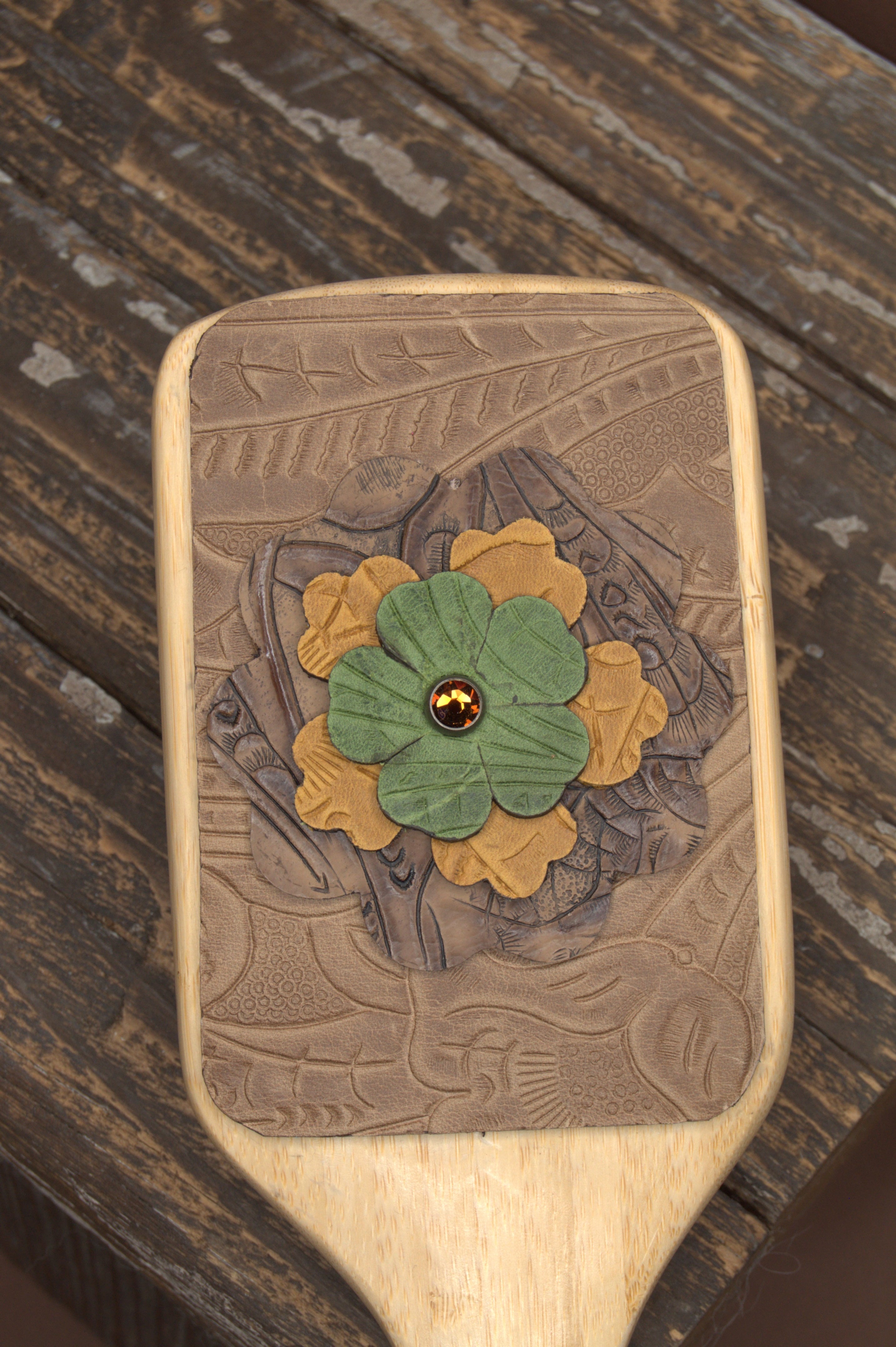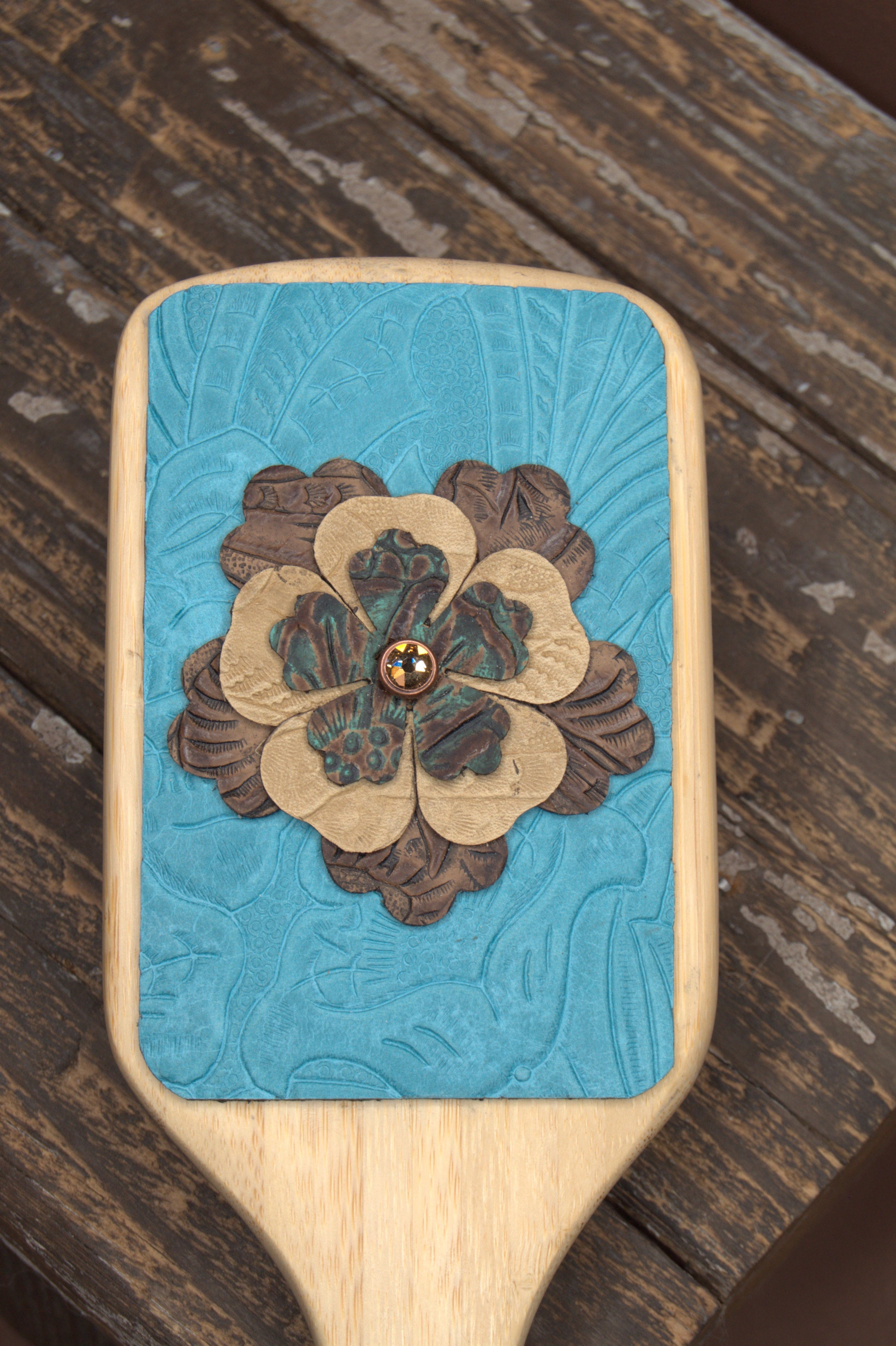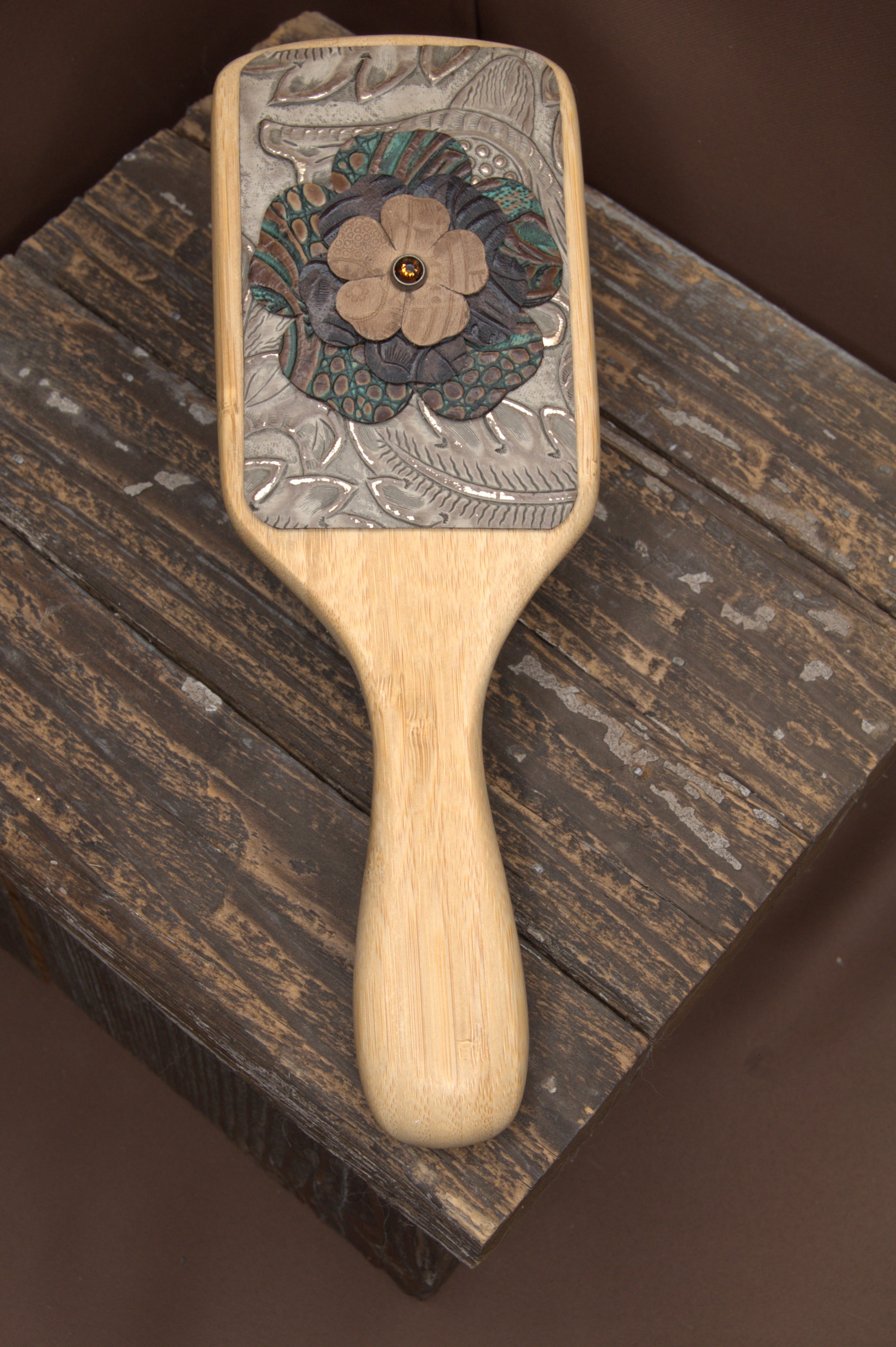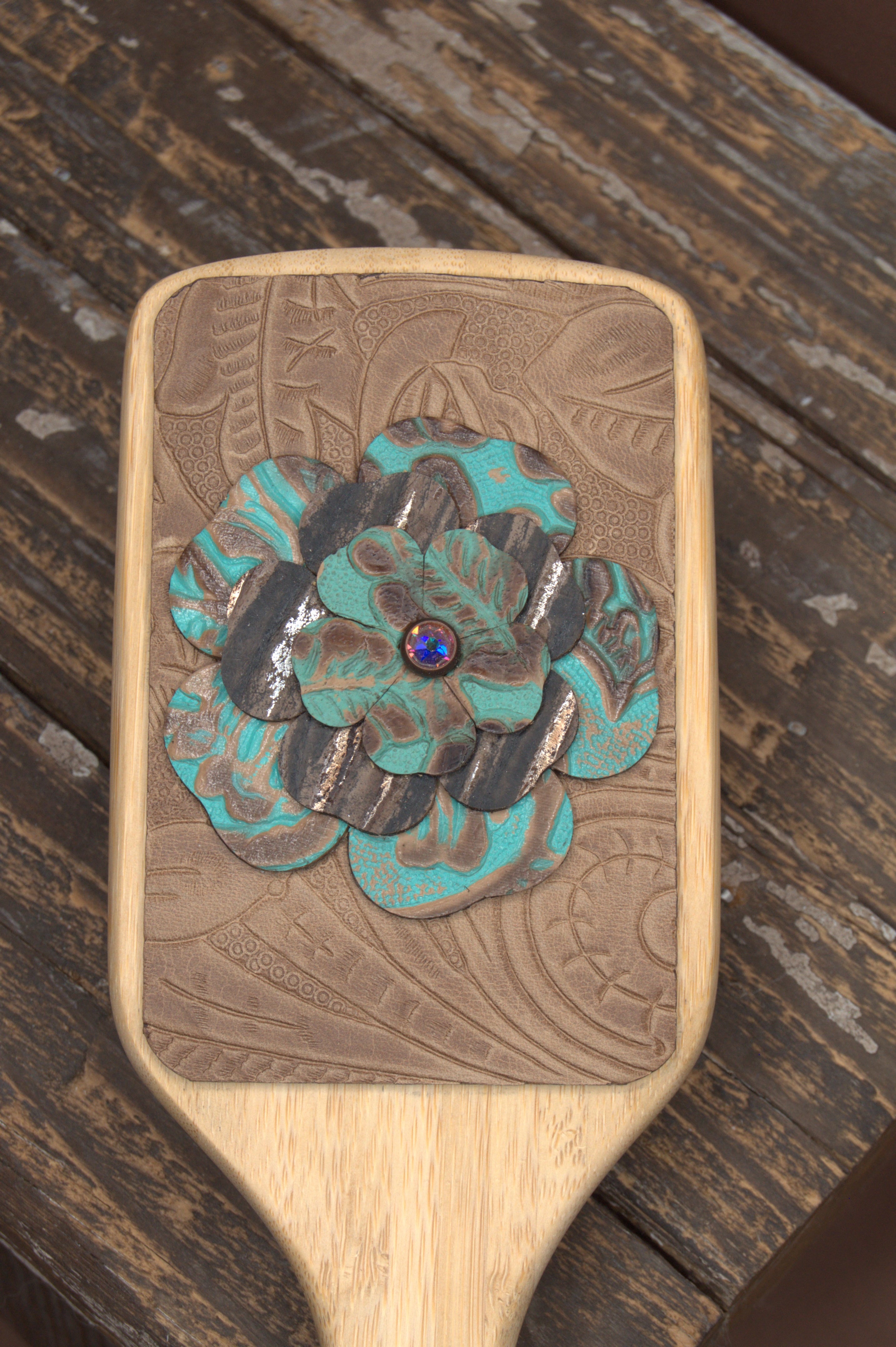 - How should I care for my leather-embellished hairbrush? To keep your handcrafted hairbrush in great condition, avoid getting the leather wet. Store it in a dry place to prevent damage to the leather or embellishments. You can gently clean the bristles as you normally would, but be careful not to use water or cleaning products on the leather itself.