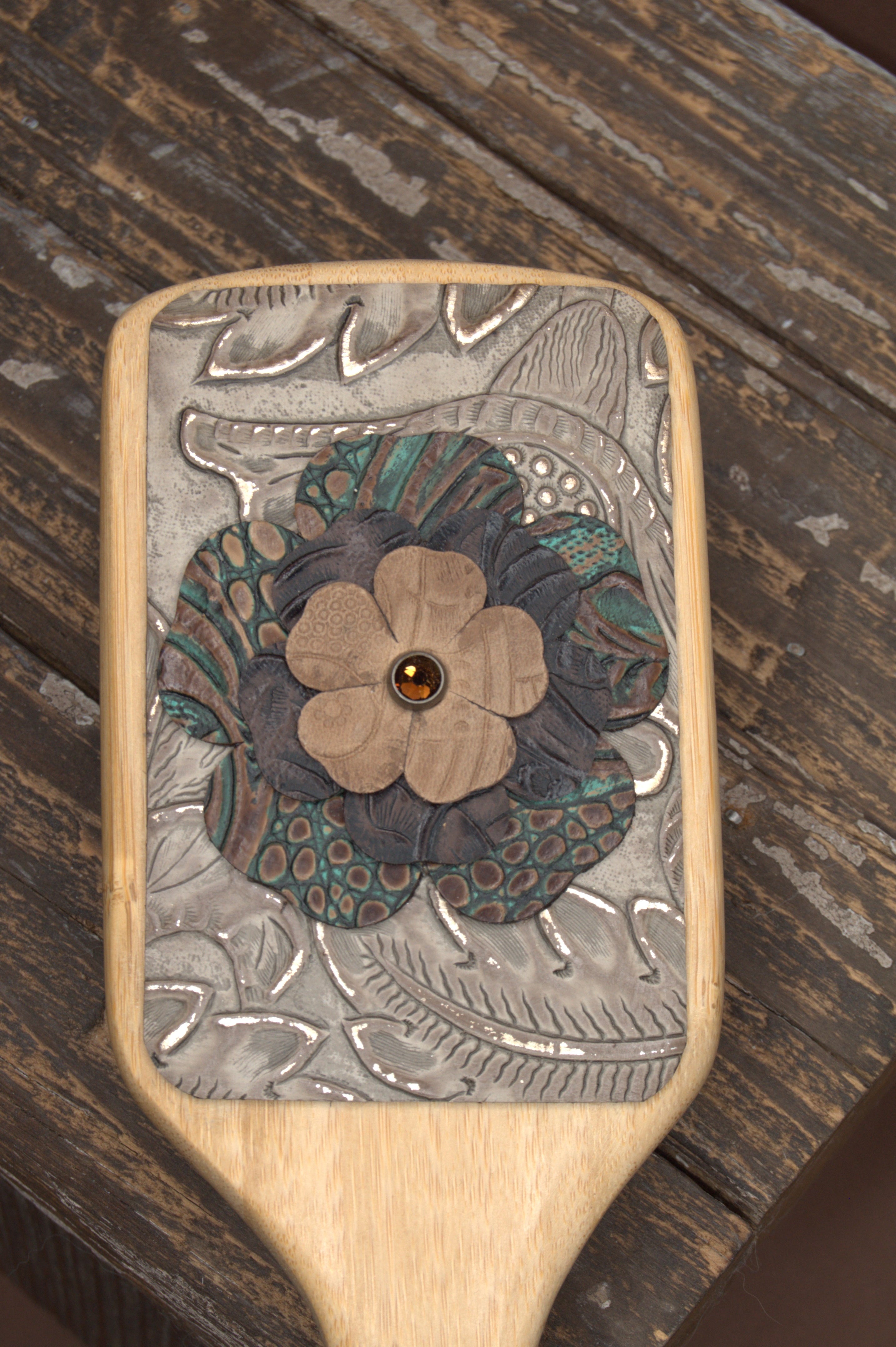 - What makes your embellished hairbrushes unique? Our hairbrushes are unique because they are one-of-a-kind, artisanal accessories. The leather is personally selected and expertly placed by Charlyn Pacheco, often featuring intricate details like hand-pressed patterns, studs, and decorative stitching. This attention to detail transforms a simple hairbrush into a statement piece.