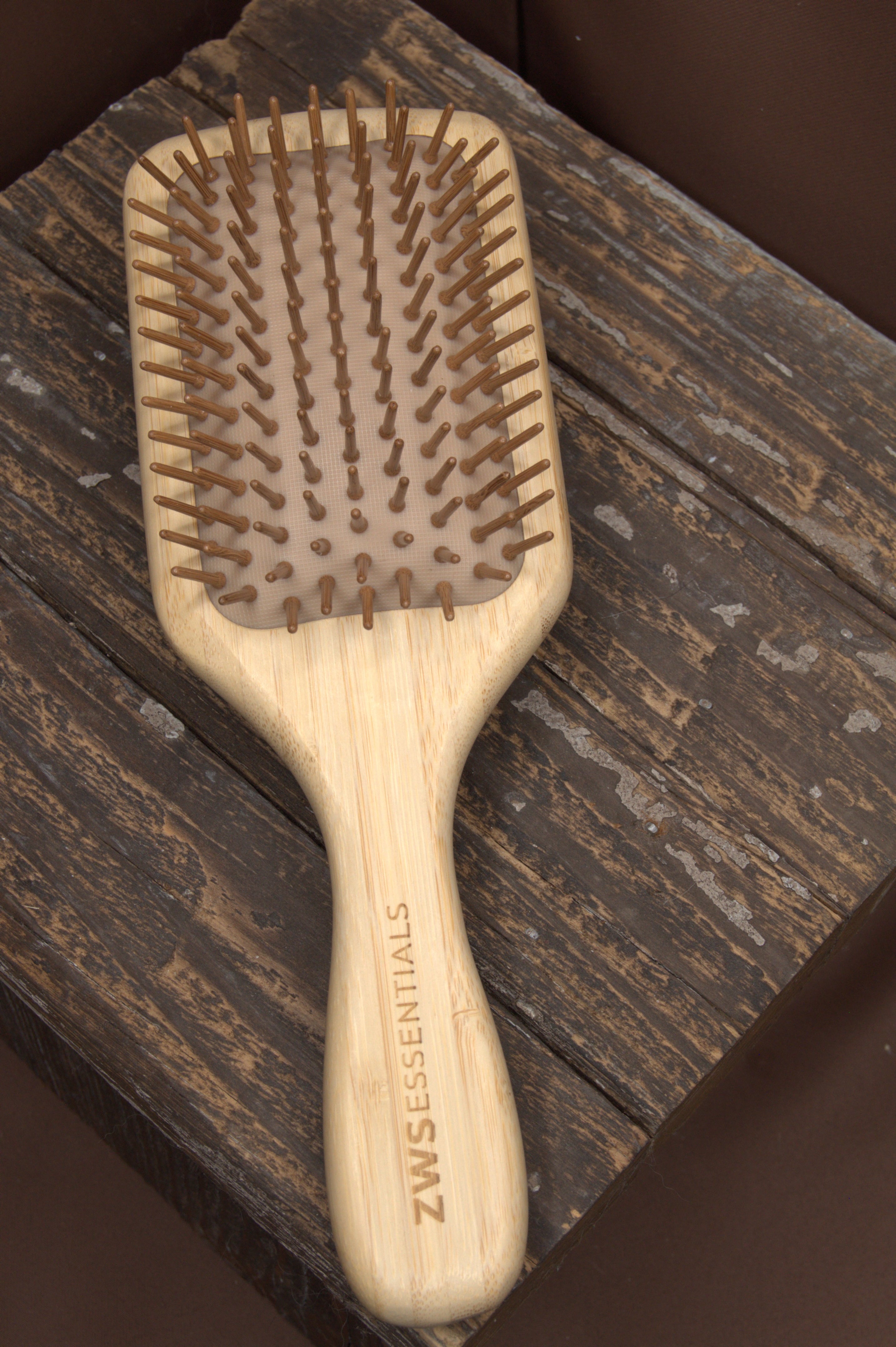 Hair brush 100% organic bamboo handle and bristles, natural rubber base, carnauba wax finish. Plastic free, vegan friendly, 9 1/2" L x 3 1/4" wide paddle x 1 1/2" w handle