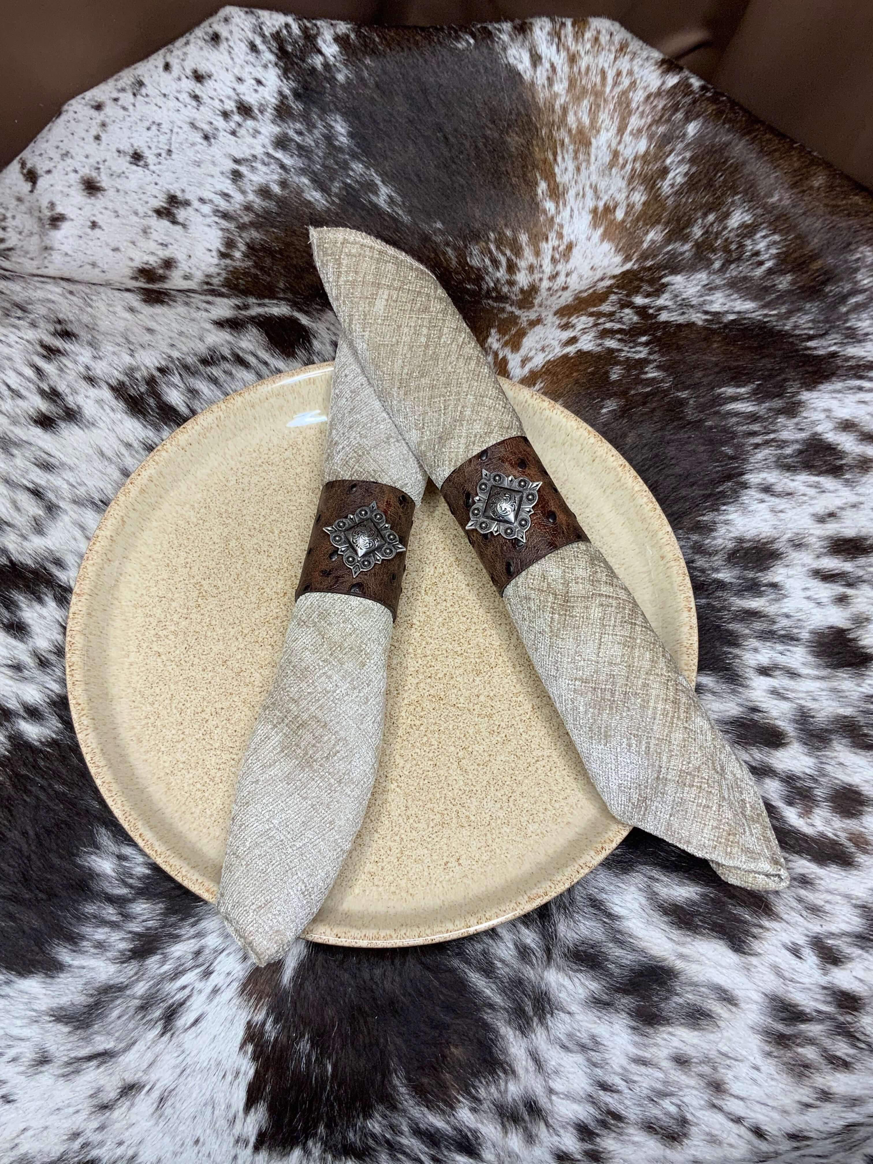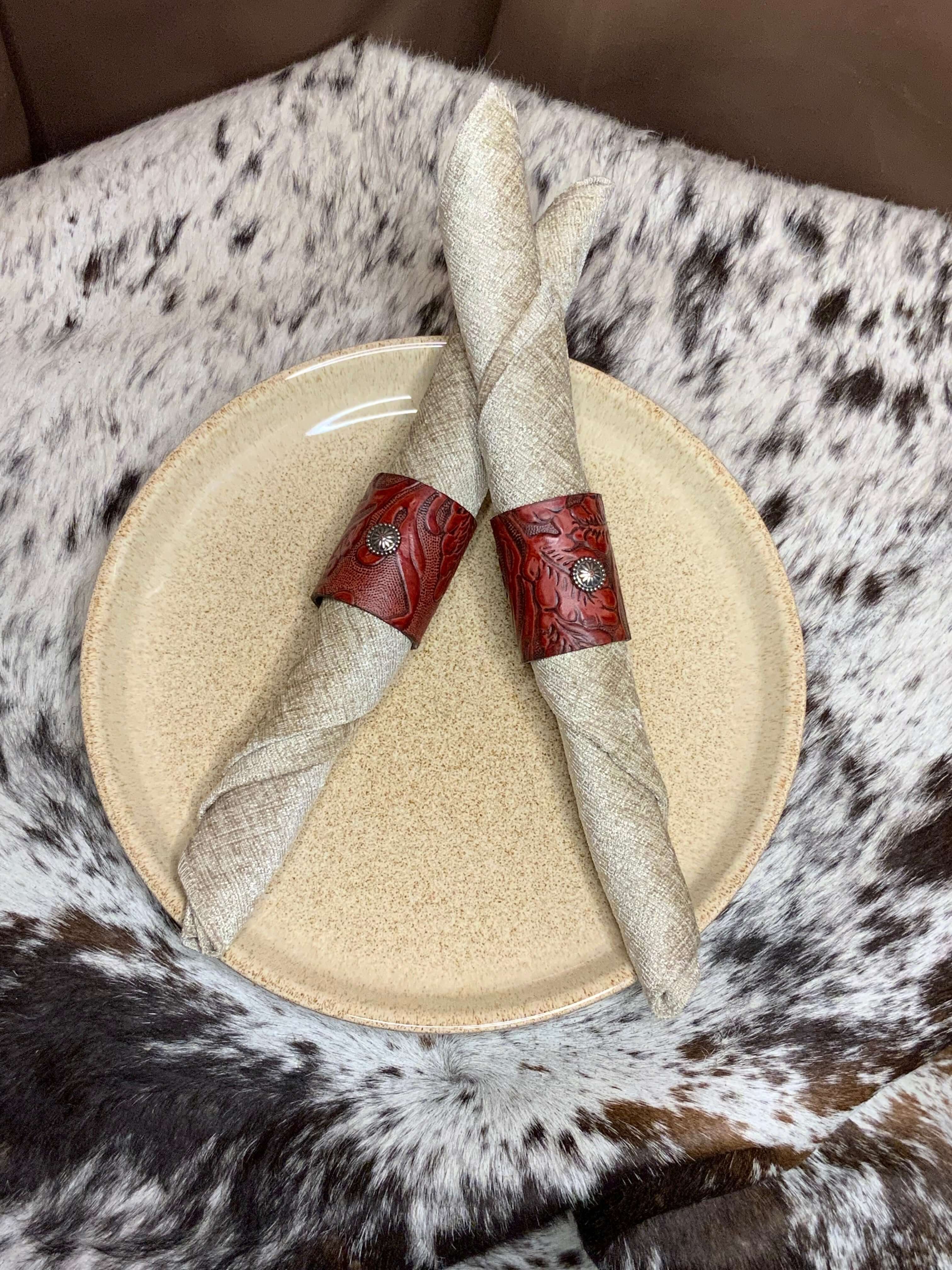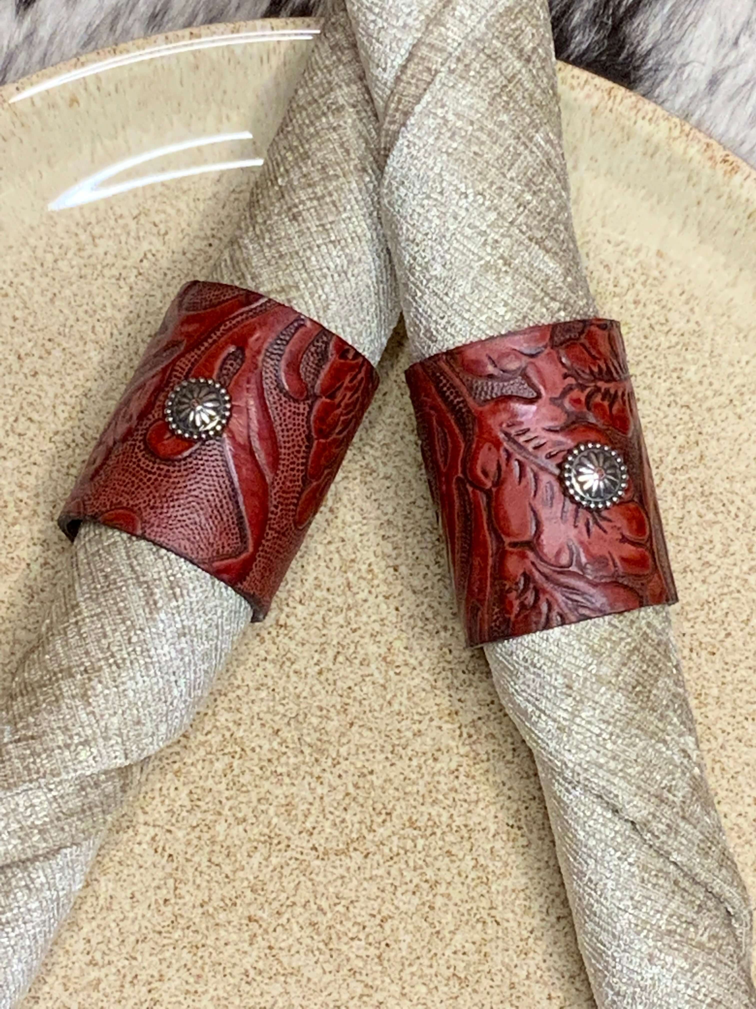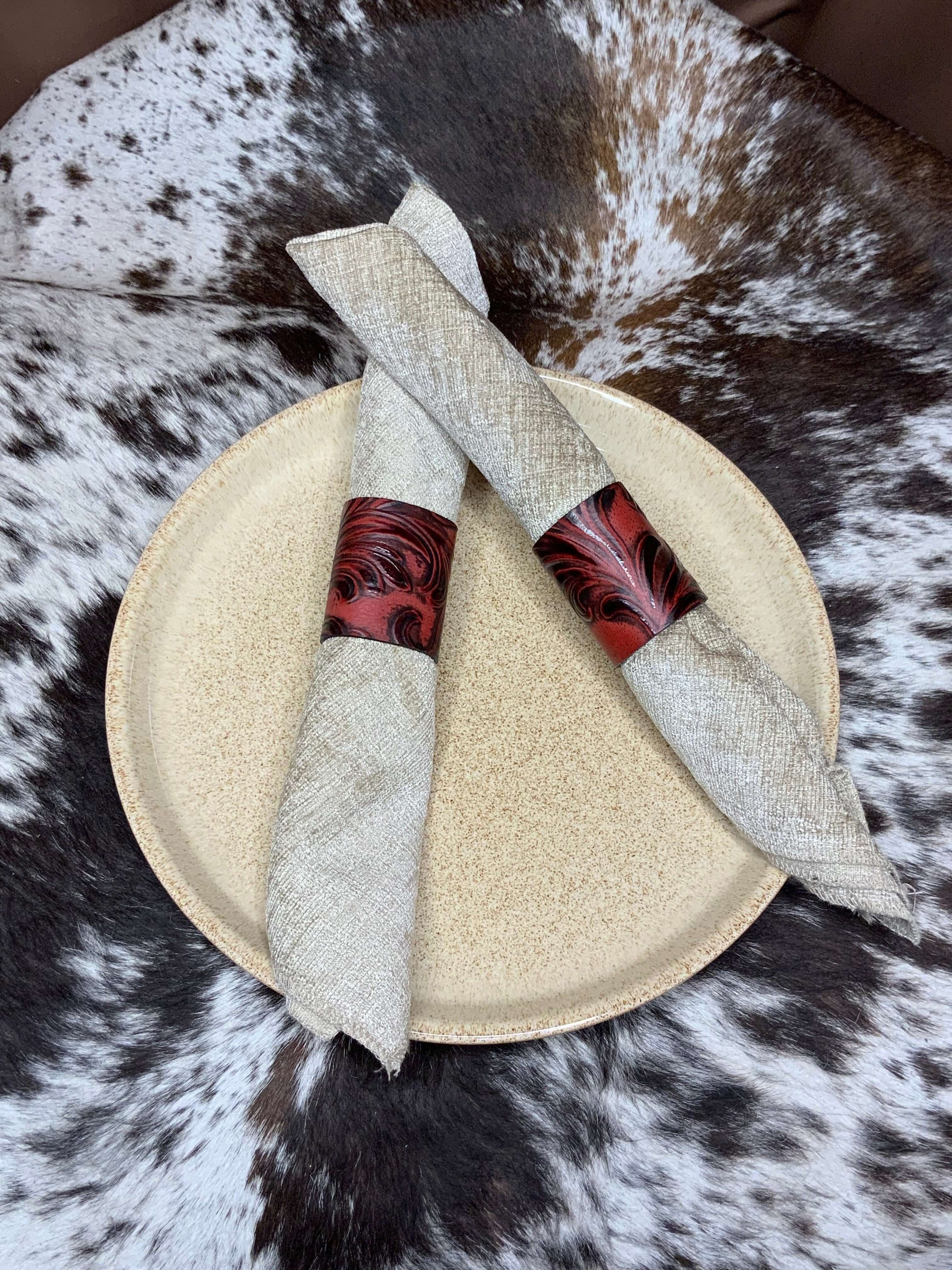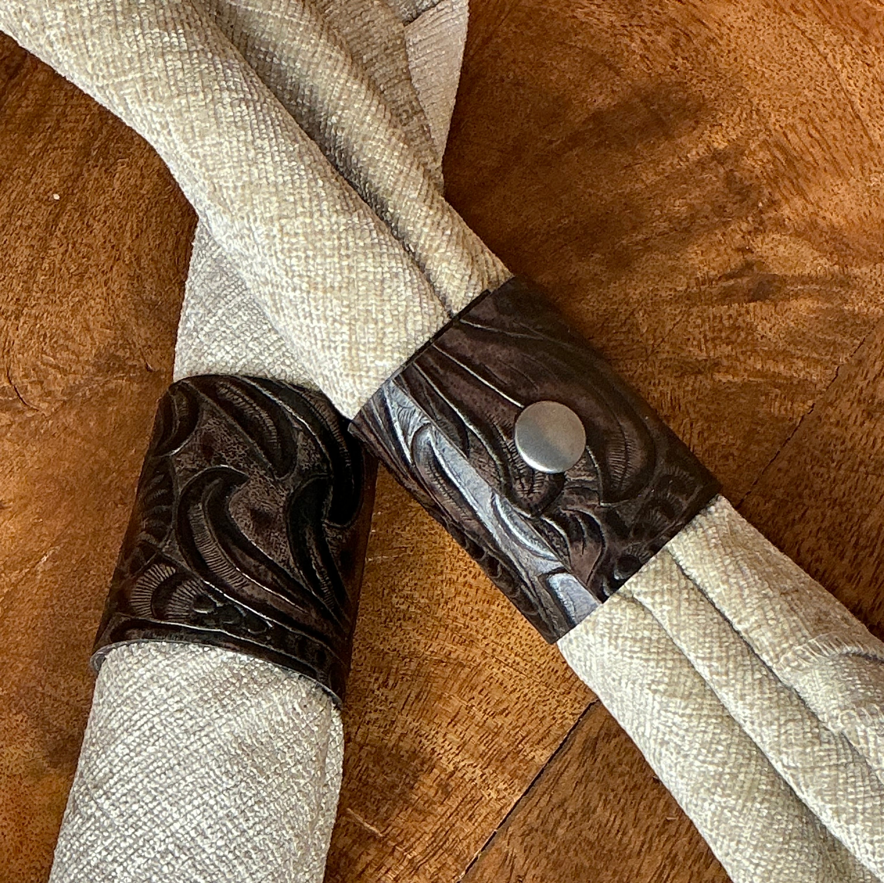 - Are these napkin rings suitable for a rustic or Western home? Yes. Our leather napkin rings are a perfect accessory to add to your dining or kitchen decor. The natural leather and handcrafted details make them a beautiful and subtle way to incorporate Western and rustic style into your home.