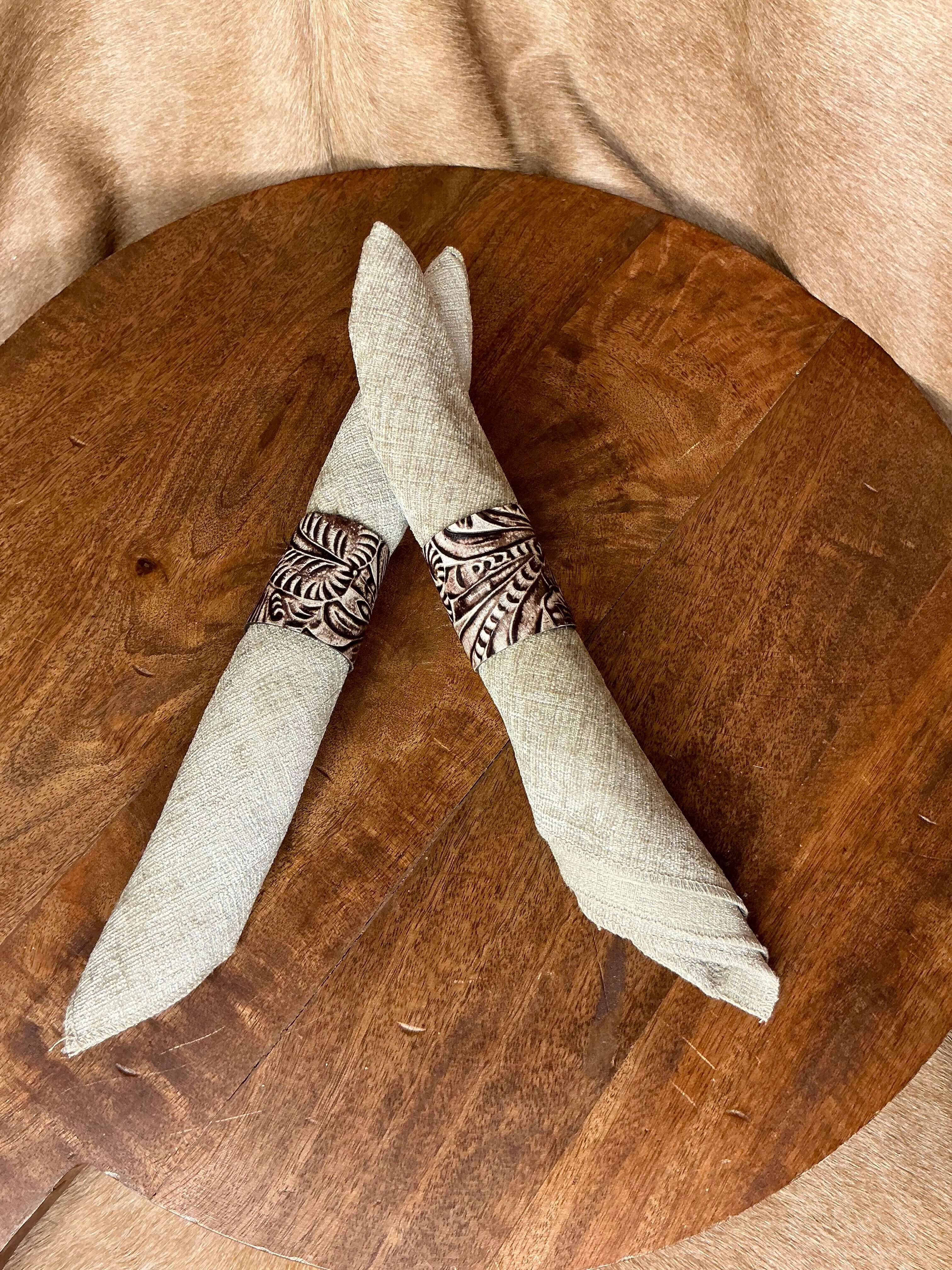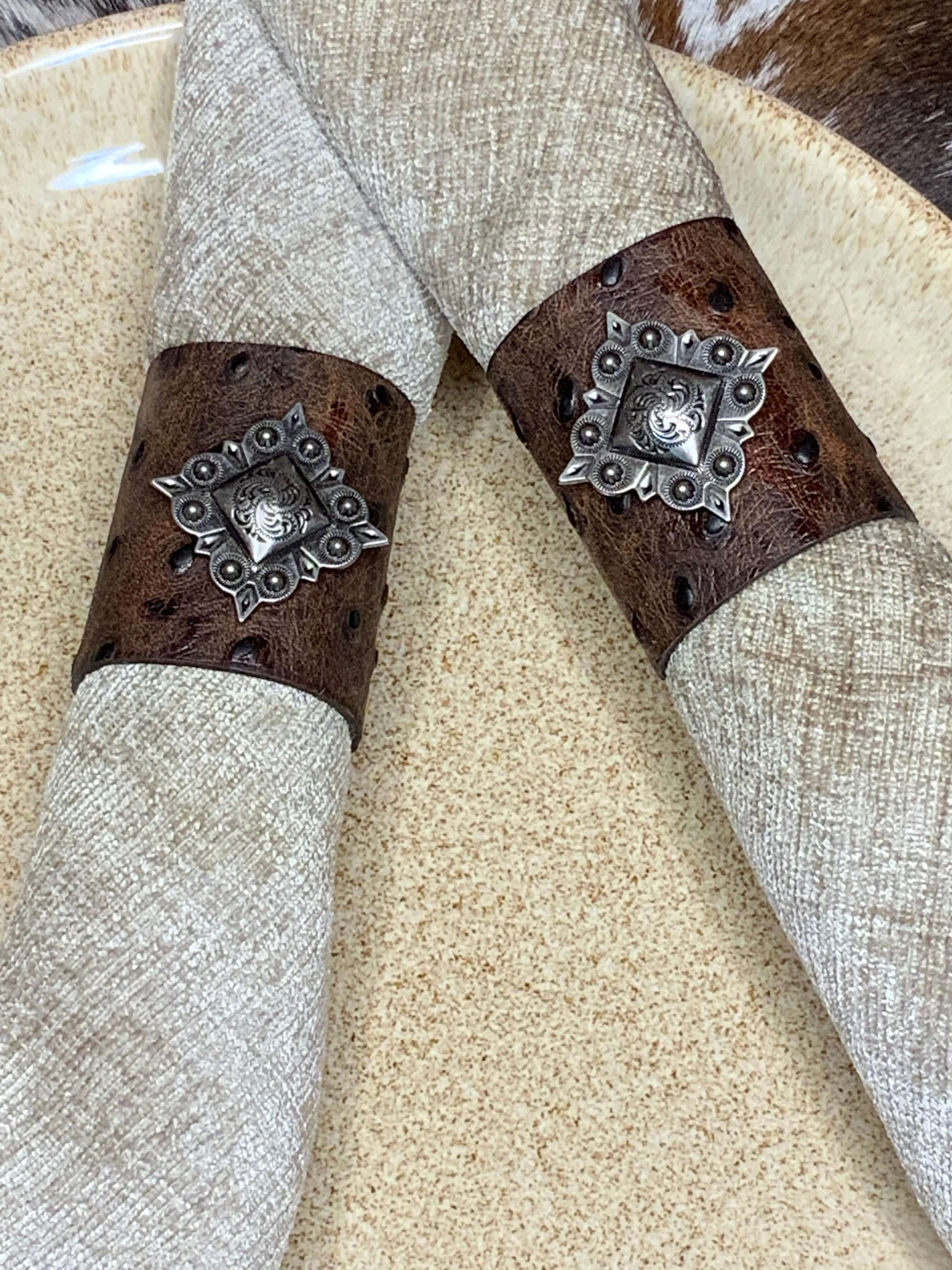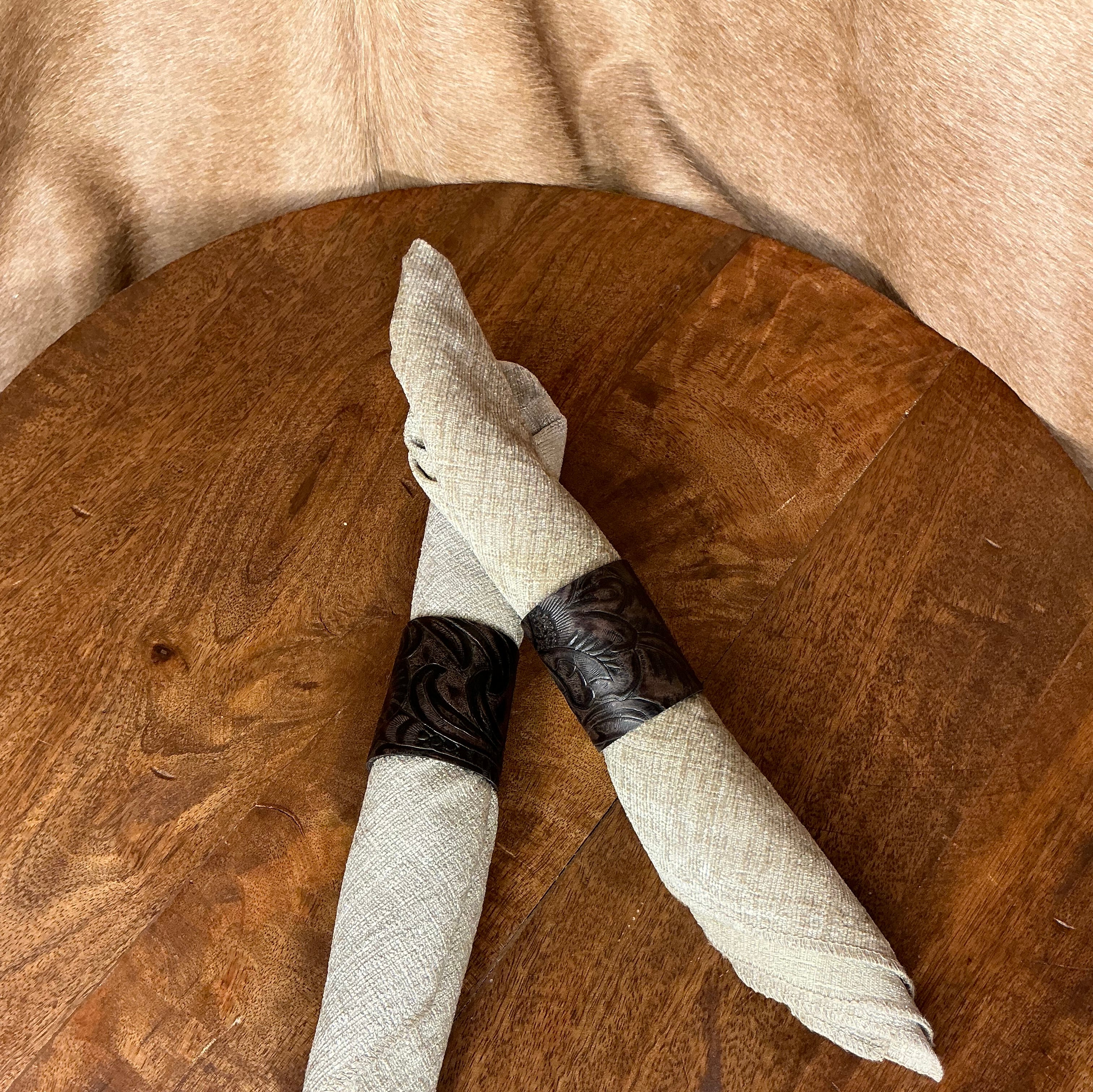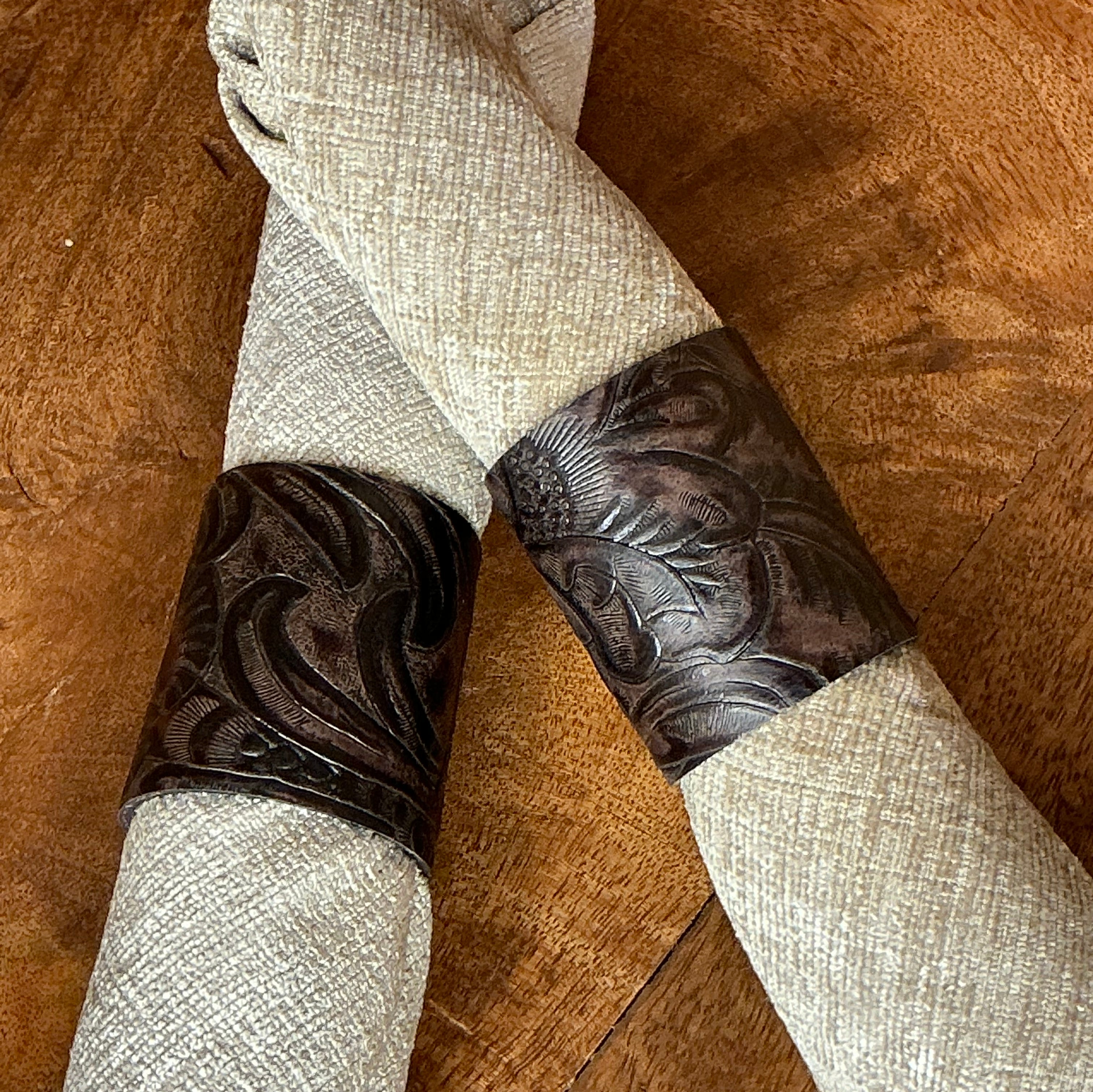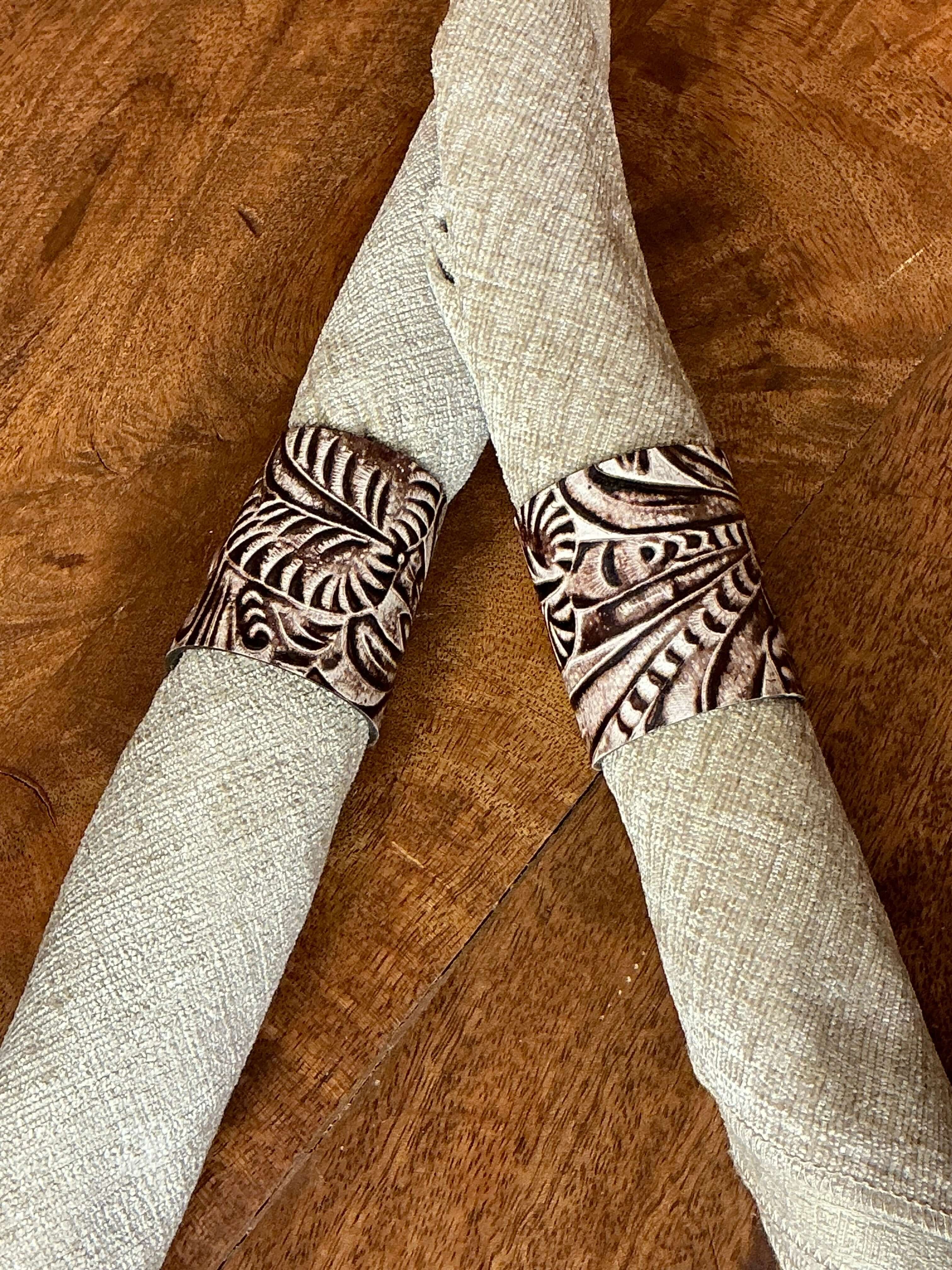- Are these napkin rings suitable for a rustic or Western home? Yes. Our leather napkin rings are a perfect accessory to add to your dining or kitchen decor. The natural leather and handcrafted details make them a beautiful and subtle way to incorporate Western and rustic style into your home.