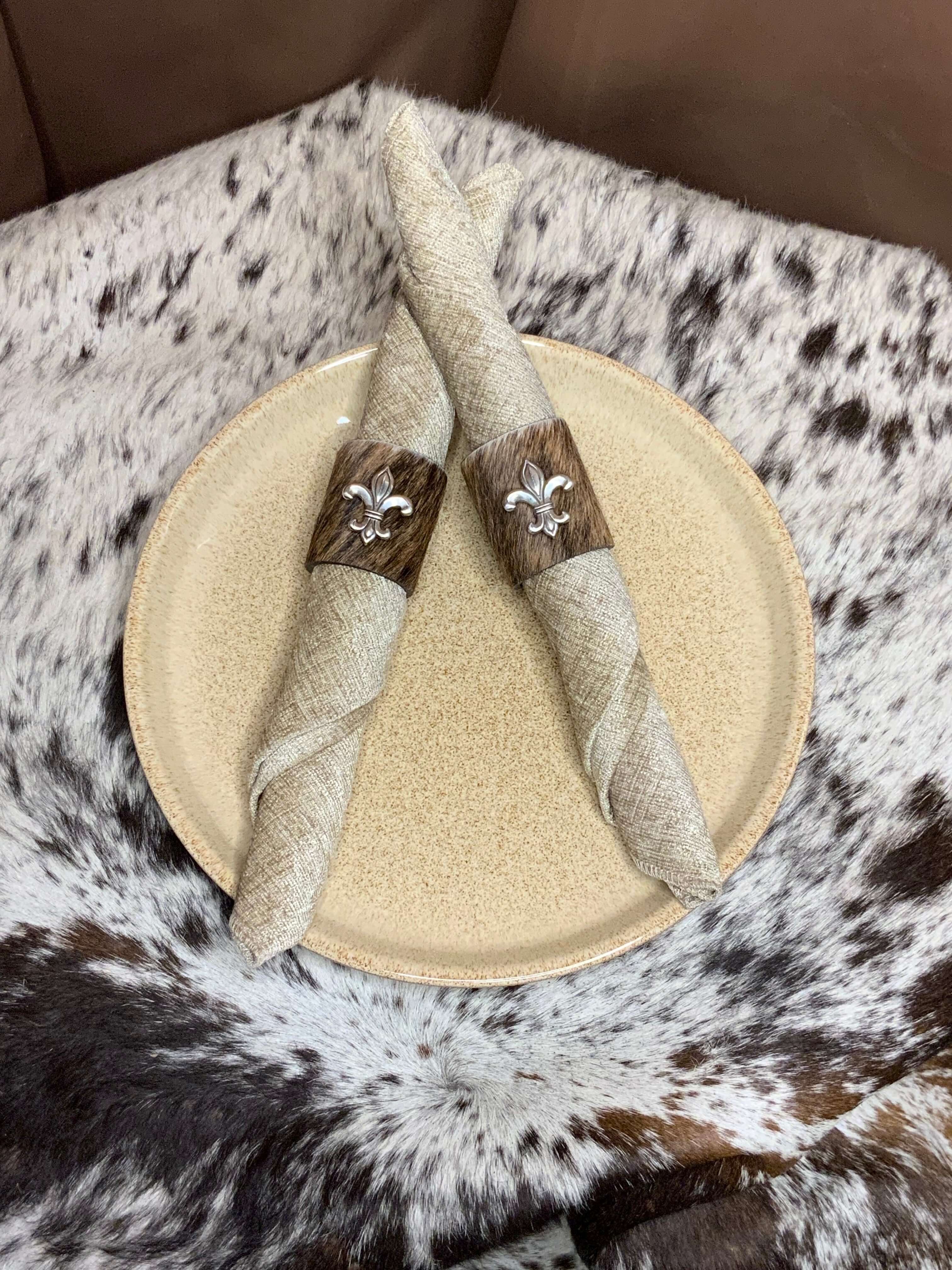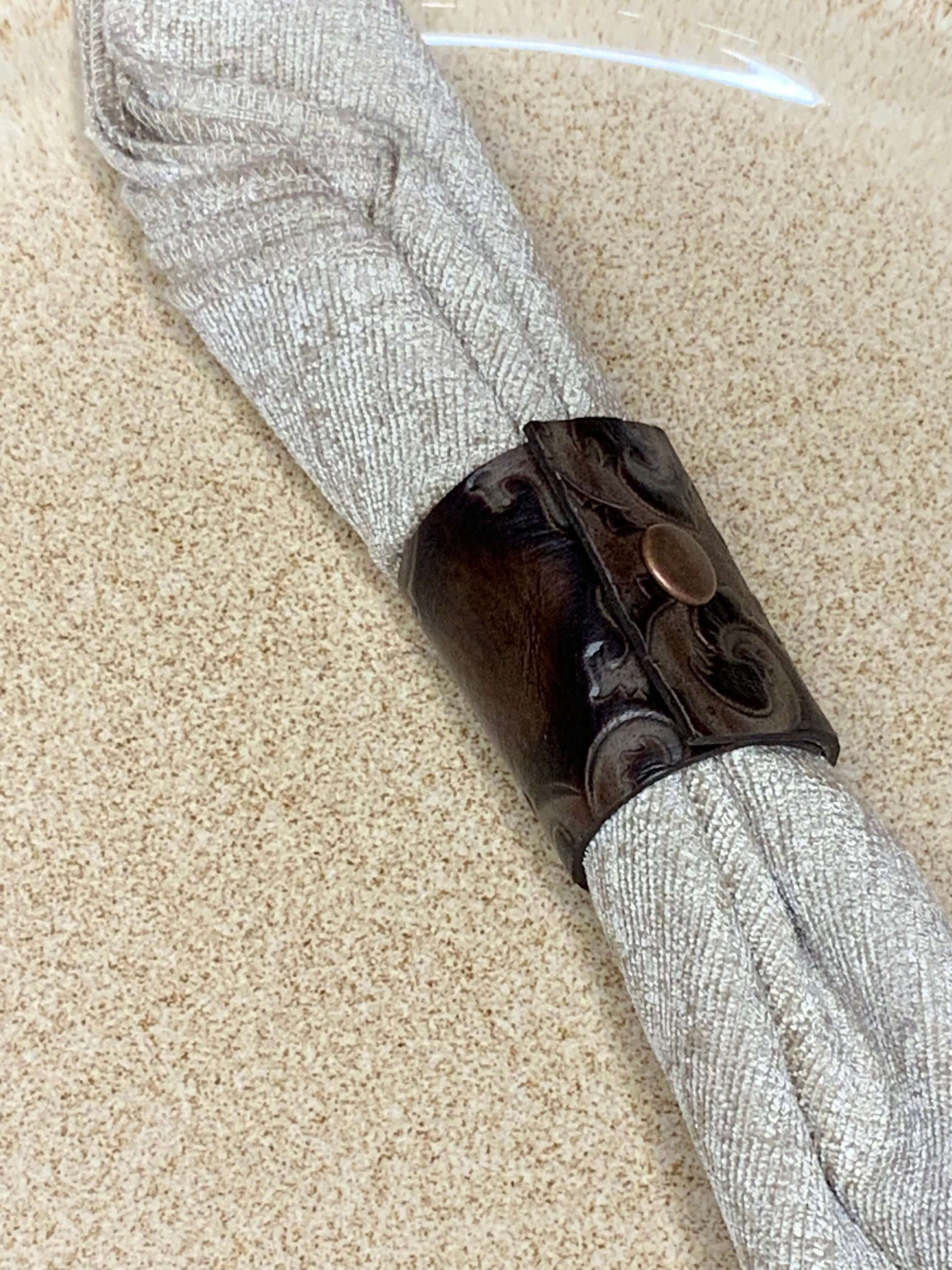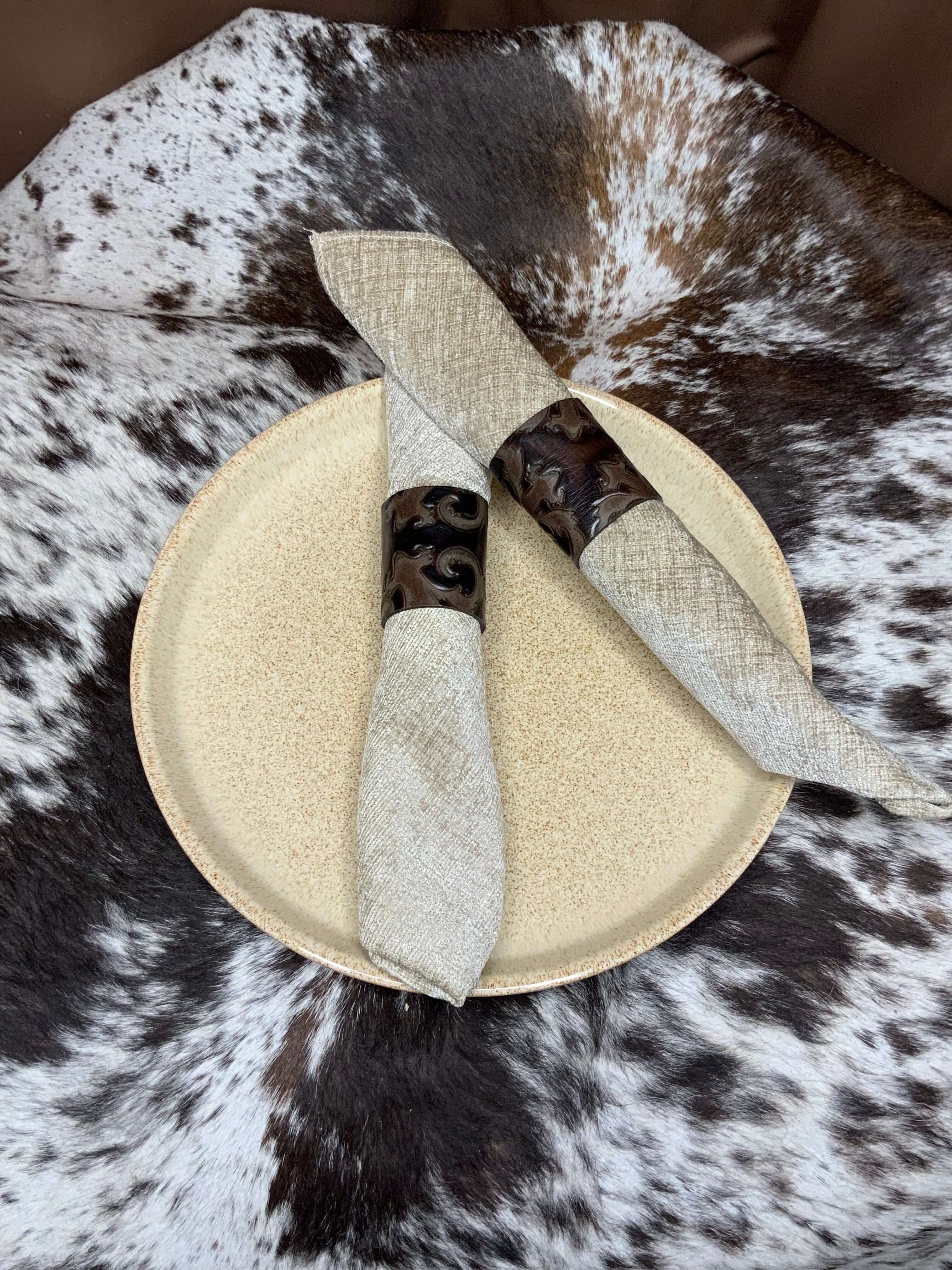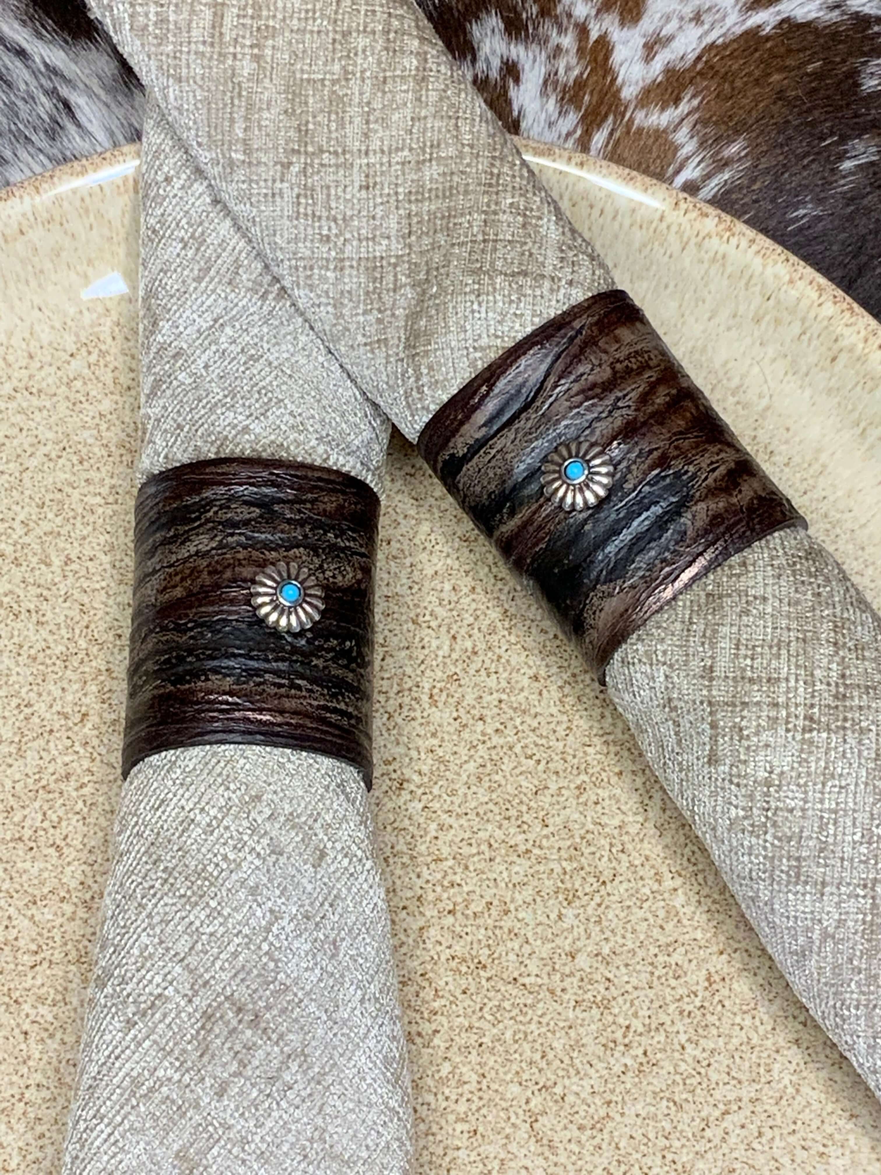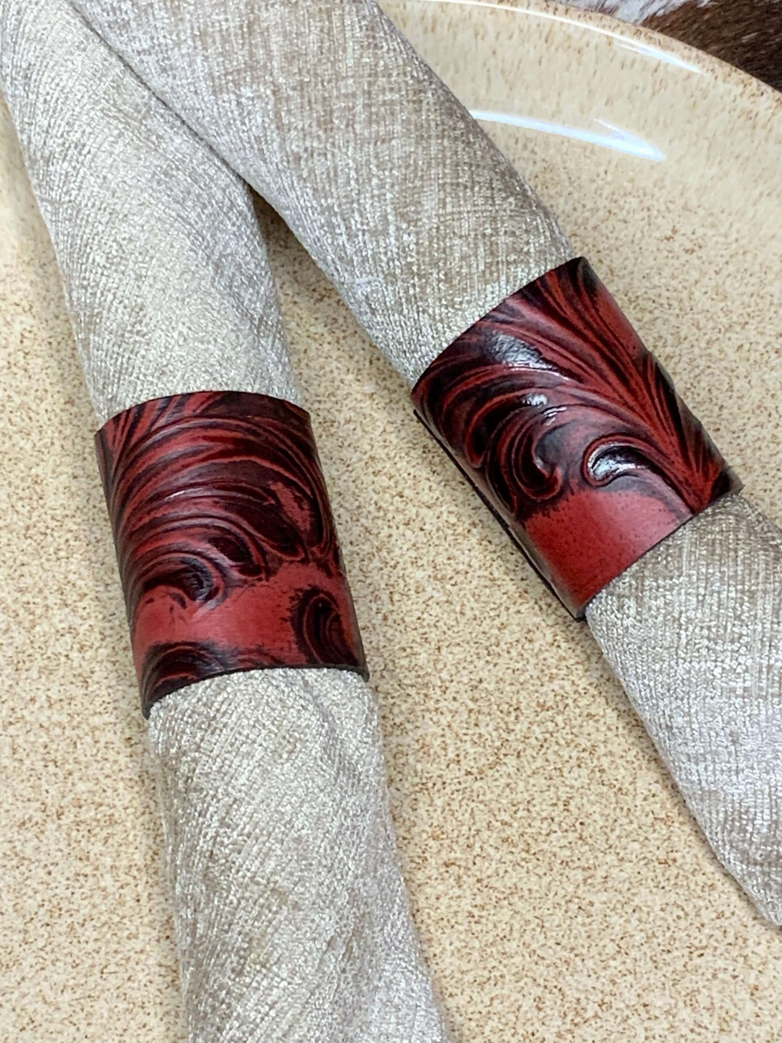 - Are these napkin rings suitable for a rustic or Western home? Yes. Our leather napkin rings are a perfect accessory to add to your dining or kitchen decor. The natural leather and handcrafted details make them a beautiful and subtle way to incorporate Western and rustic style into your home.
