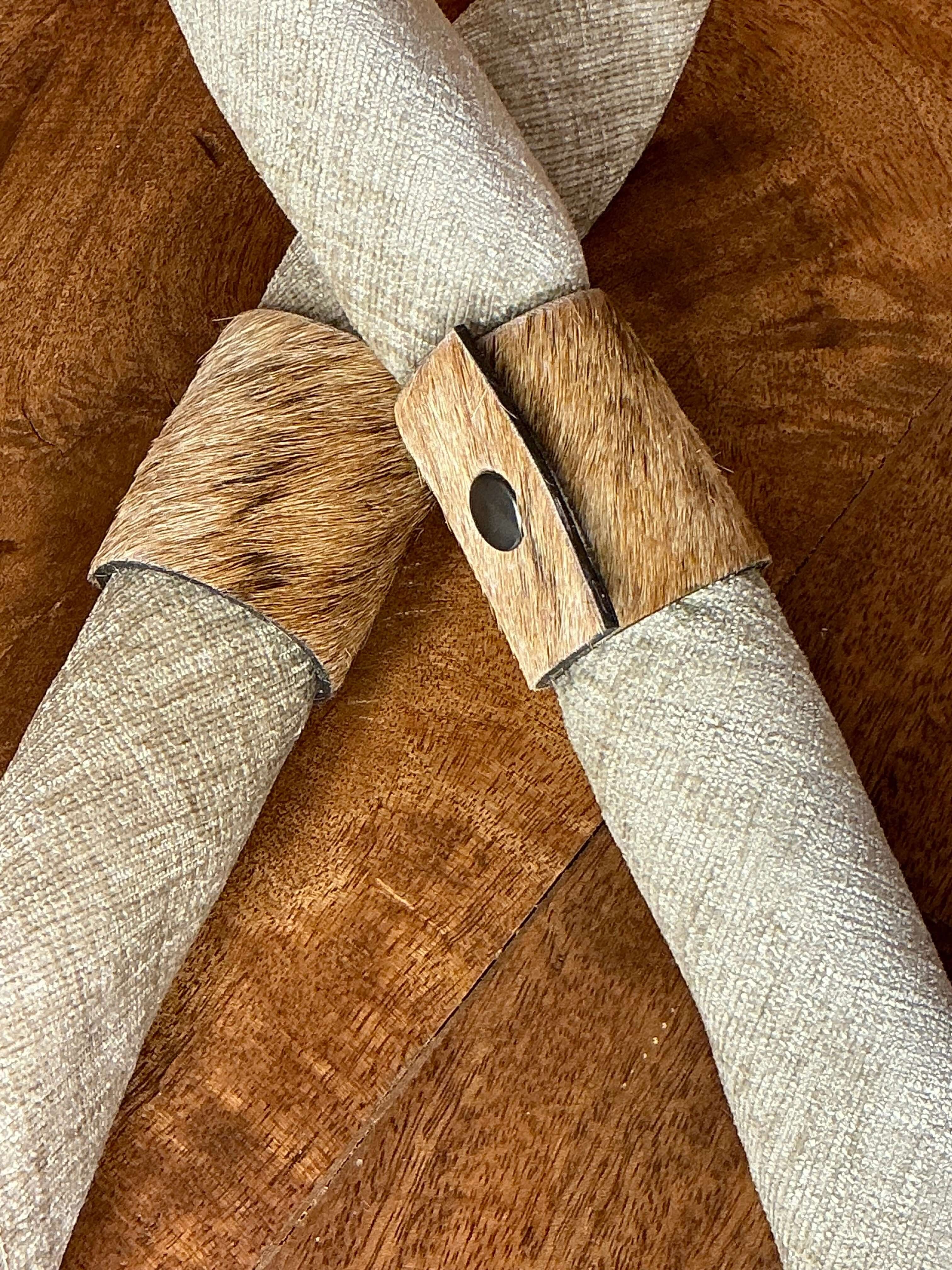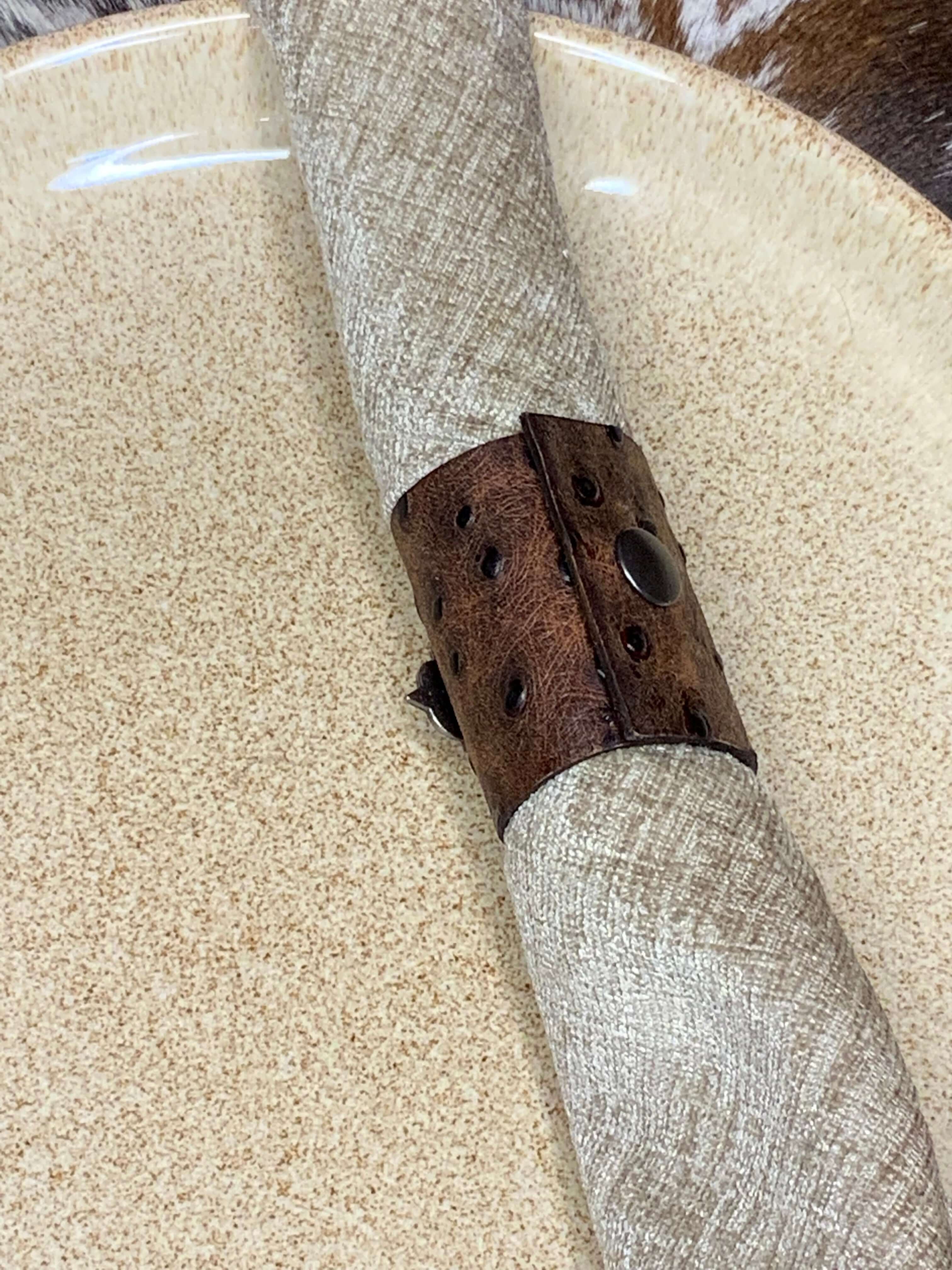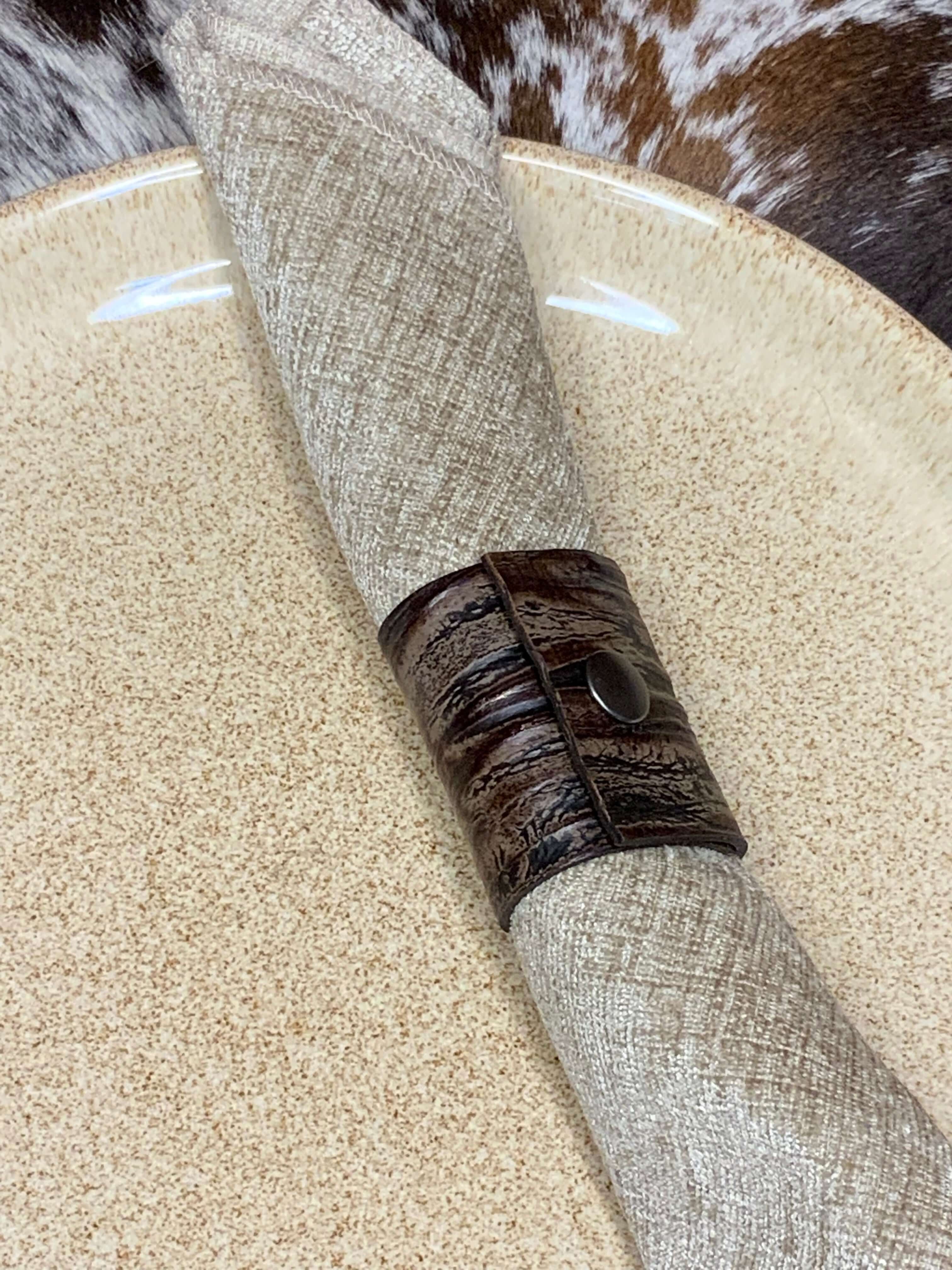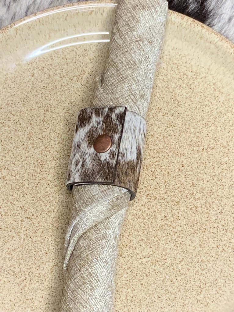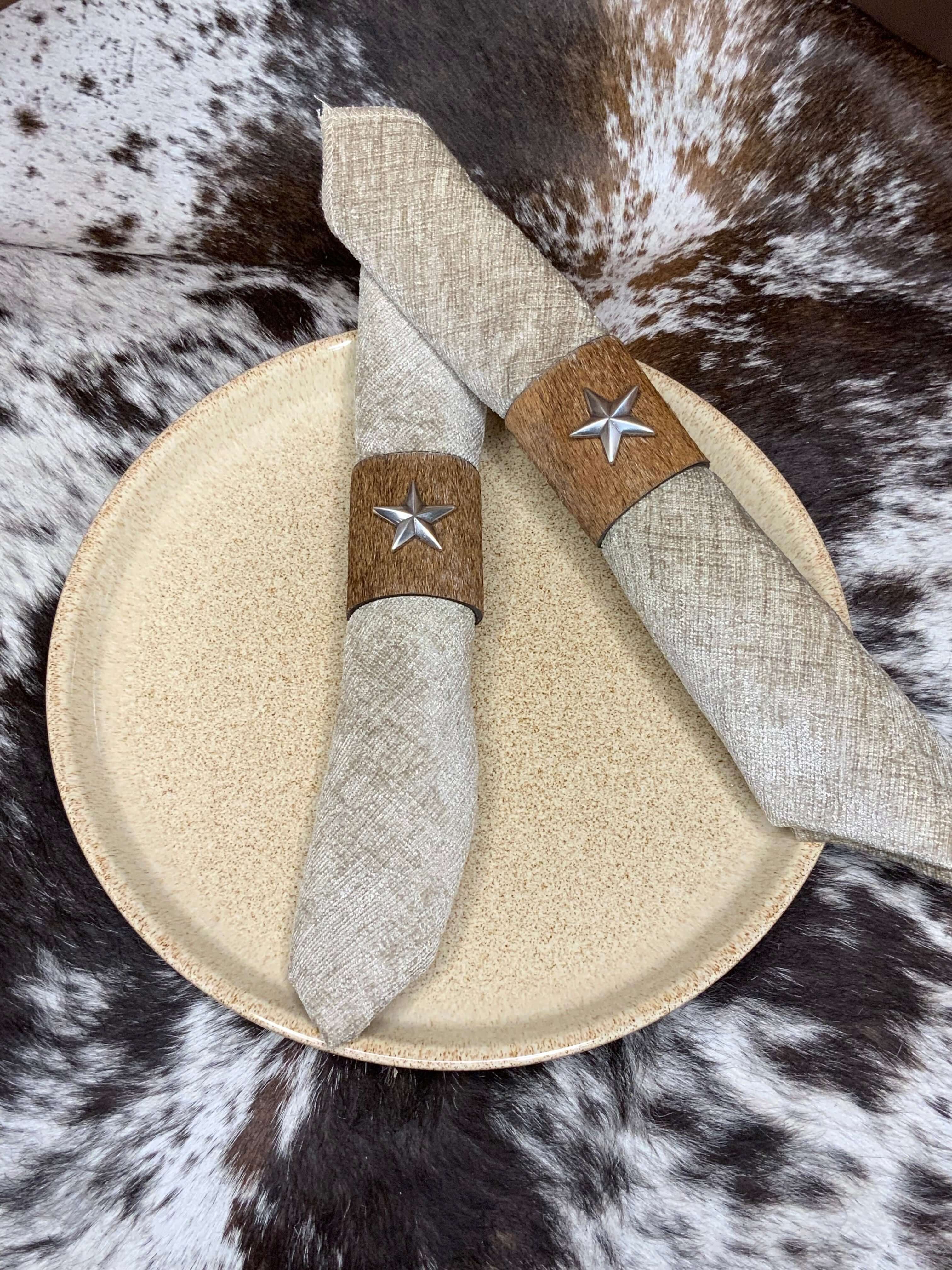 - Are these napkin rings suitable for a rustic or Western home? Yes. Our leather napkin rings are a perfect accessory to add to your dining or kitchen decor. The natural leather and handcrafted details make them a beautiful and subtle way to incorporate Western and rustic style into your home.