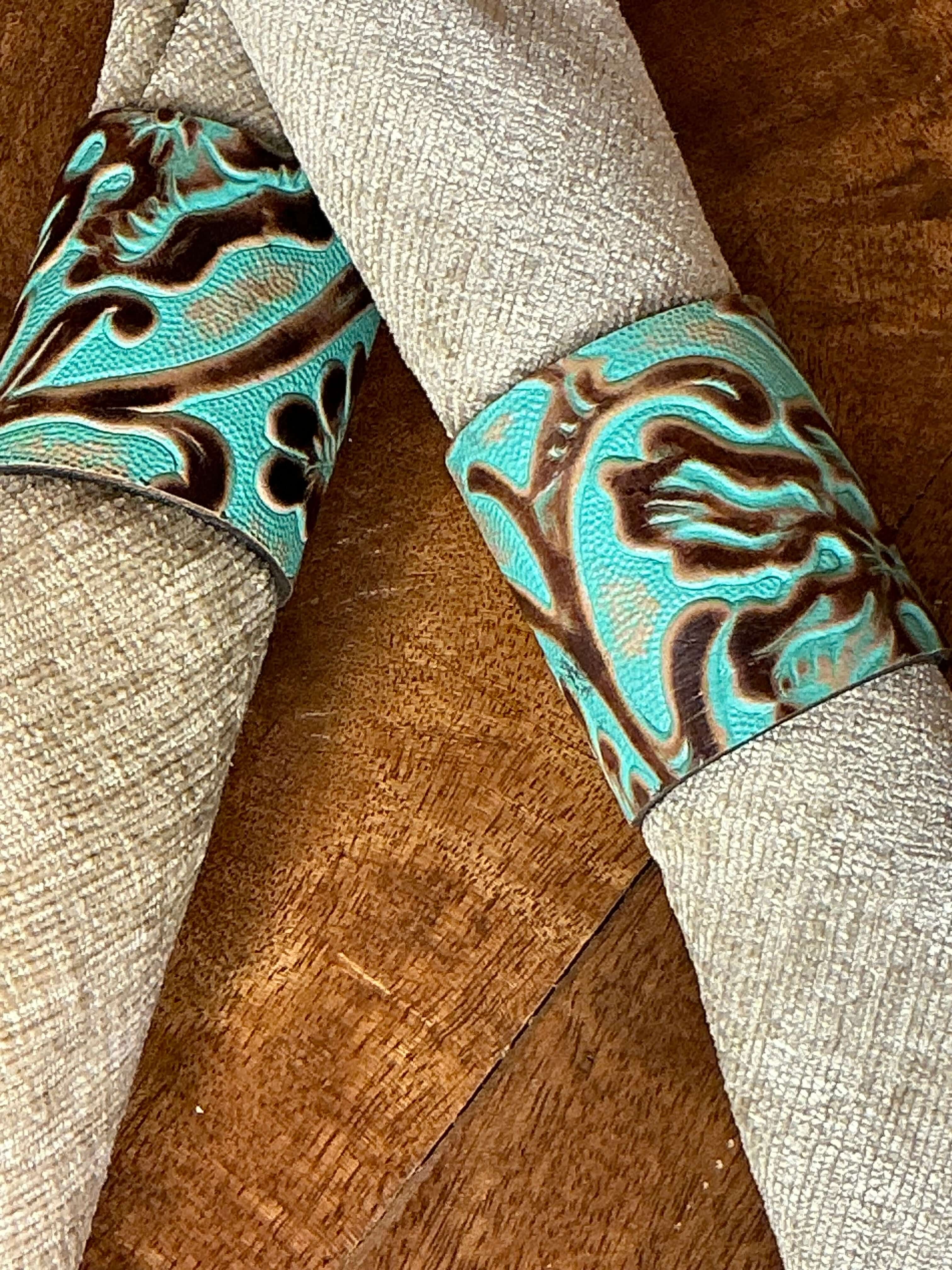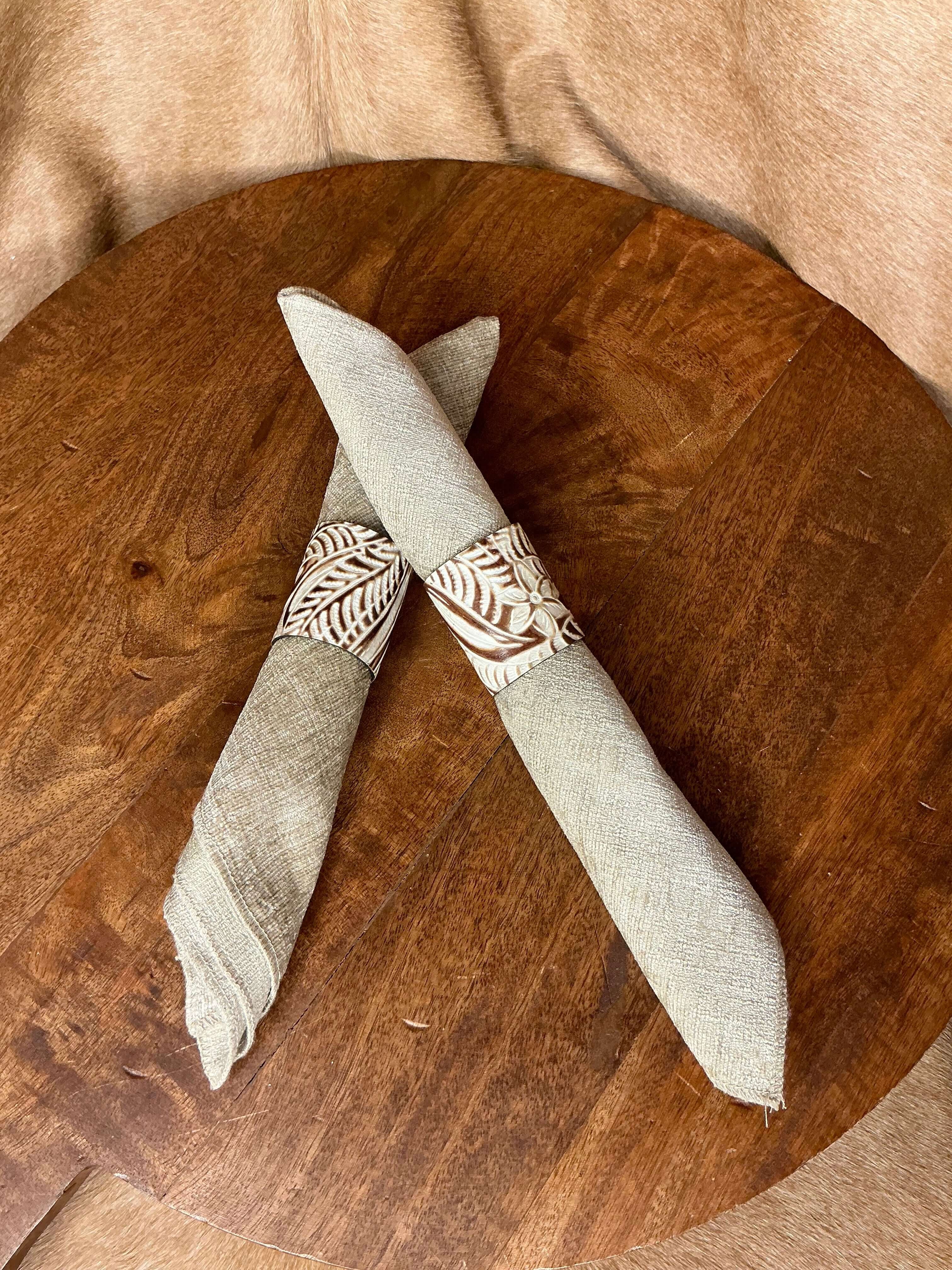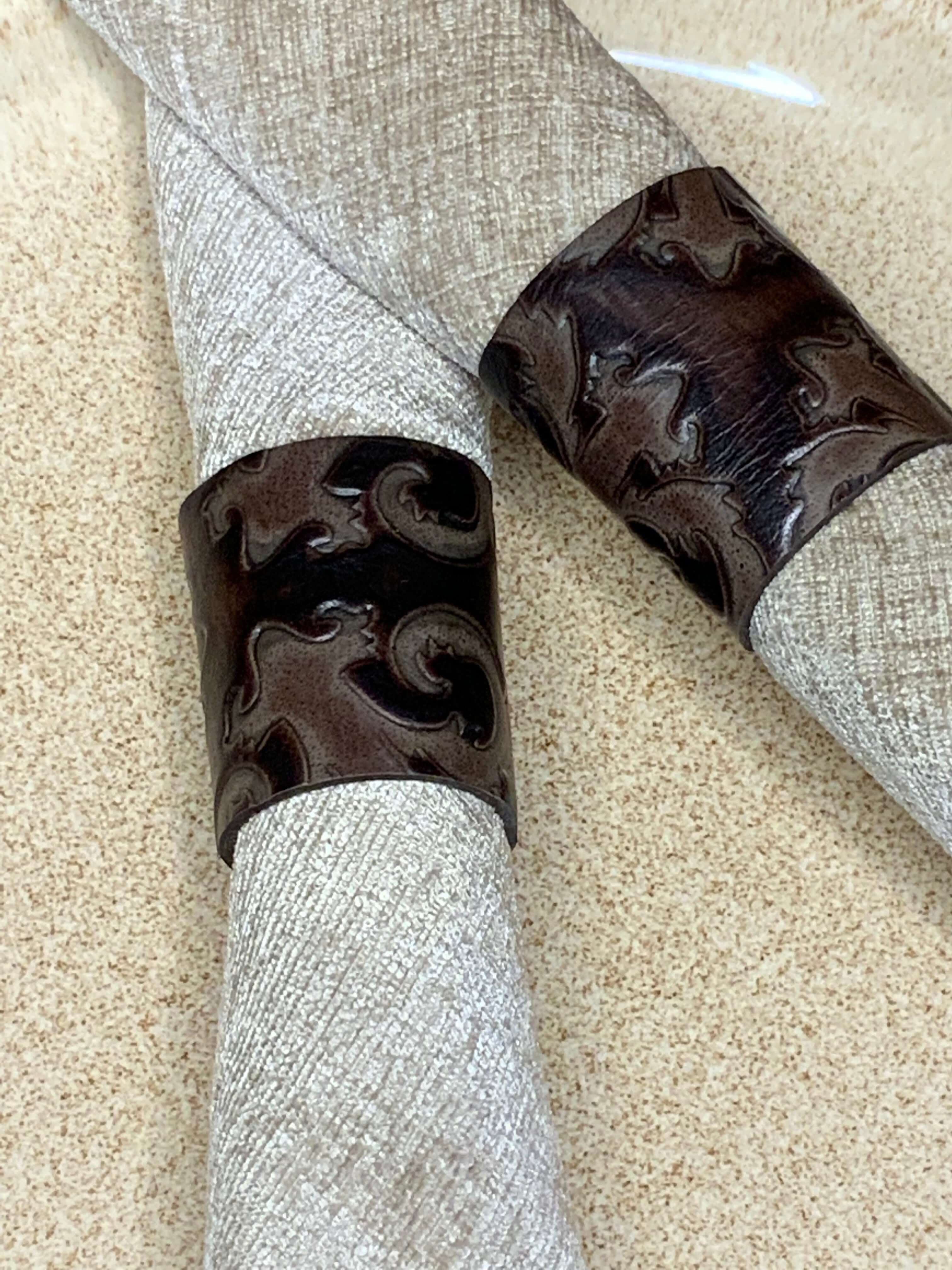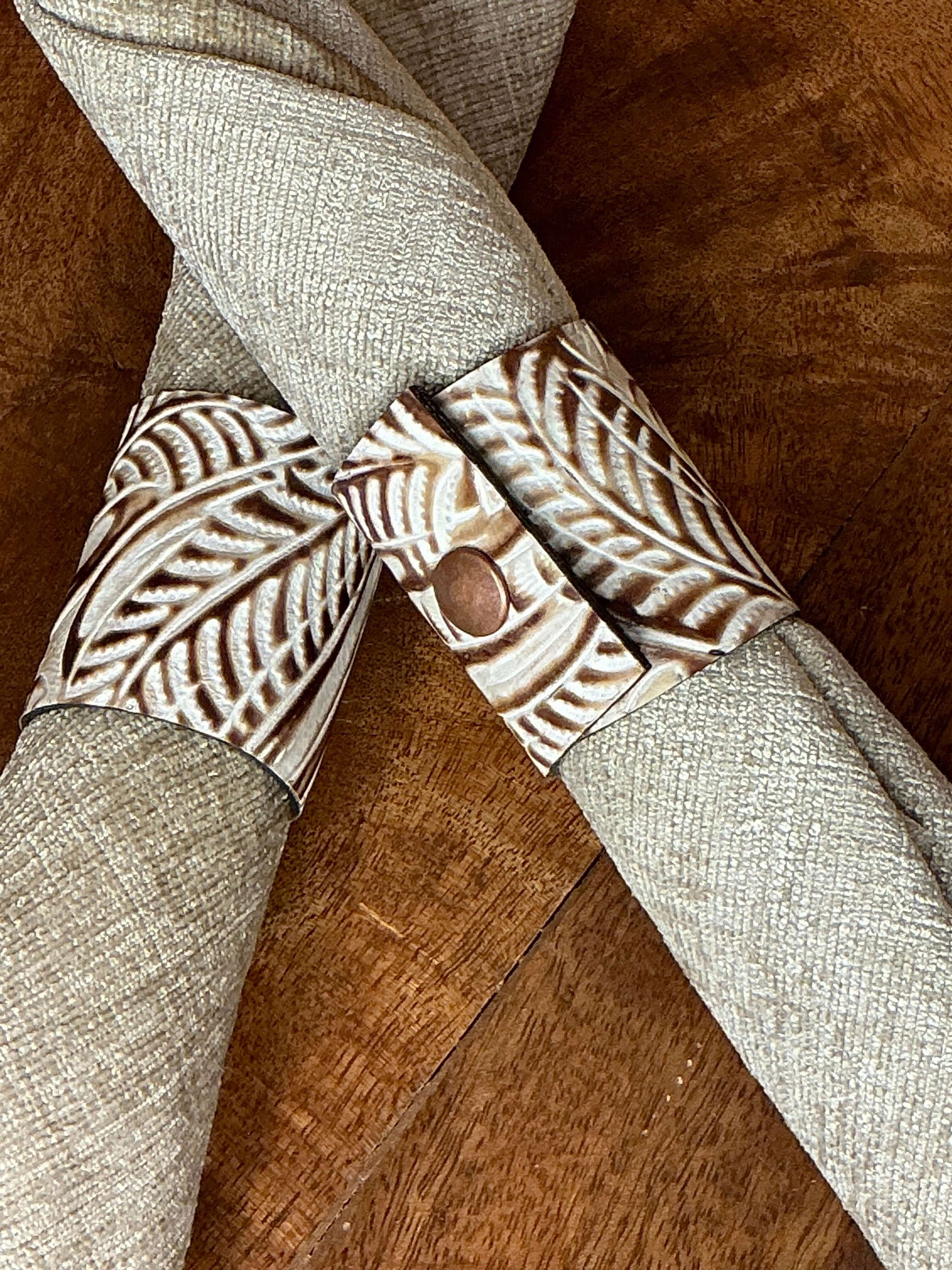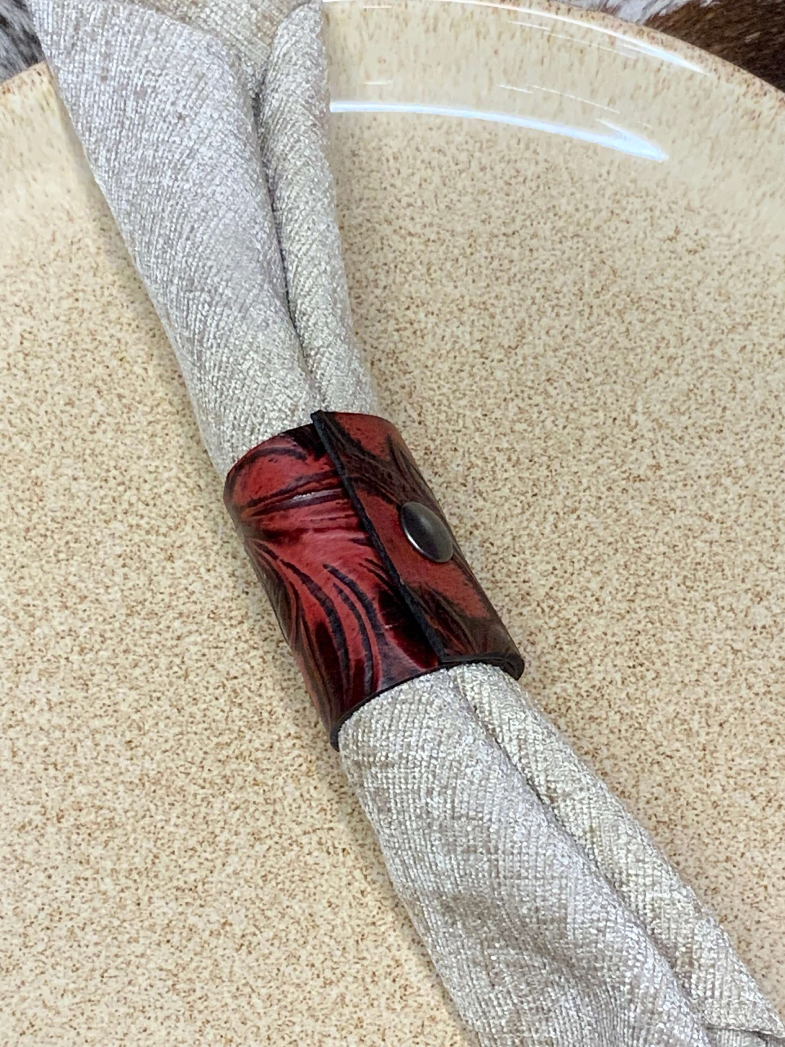 - What makes your leather napkin rings unique? Our napkin rings are unique because they are one-of-a-kind, artisanal accessories. The leather is personally selected and expertly finished by Charlyn Pacheco. The designs often feature details like hand-pressed patterns, subtle studs, or unique shapes that add a special touch to your table setting.