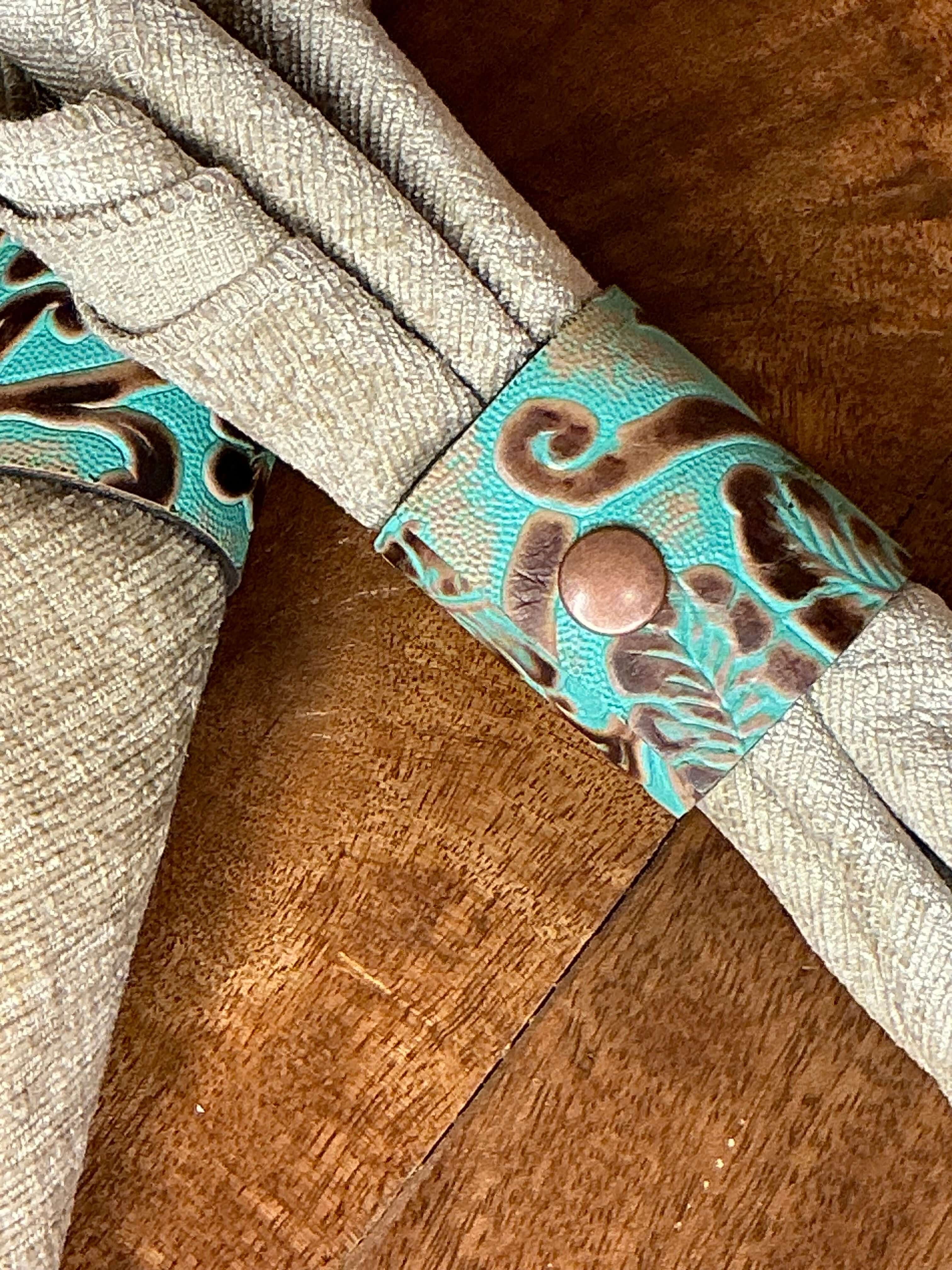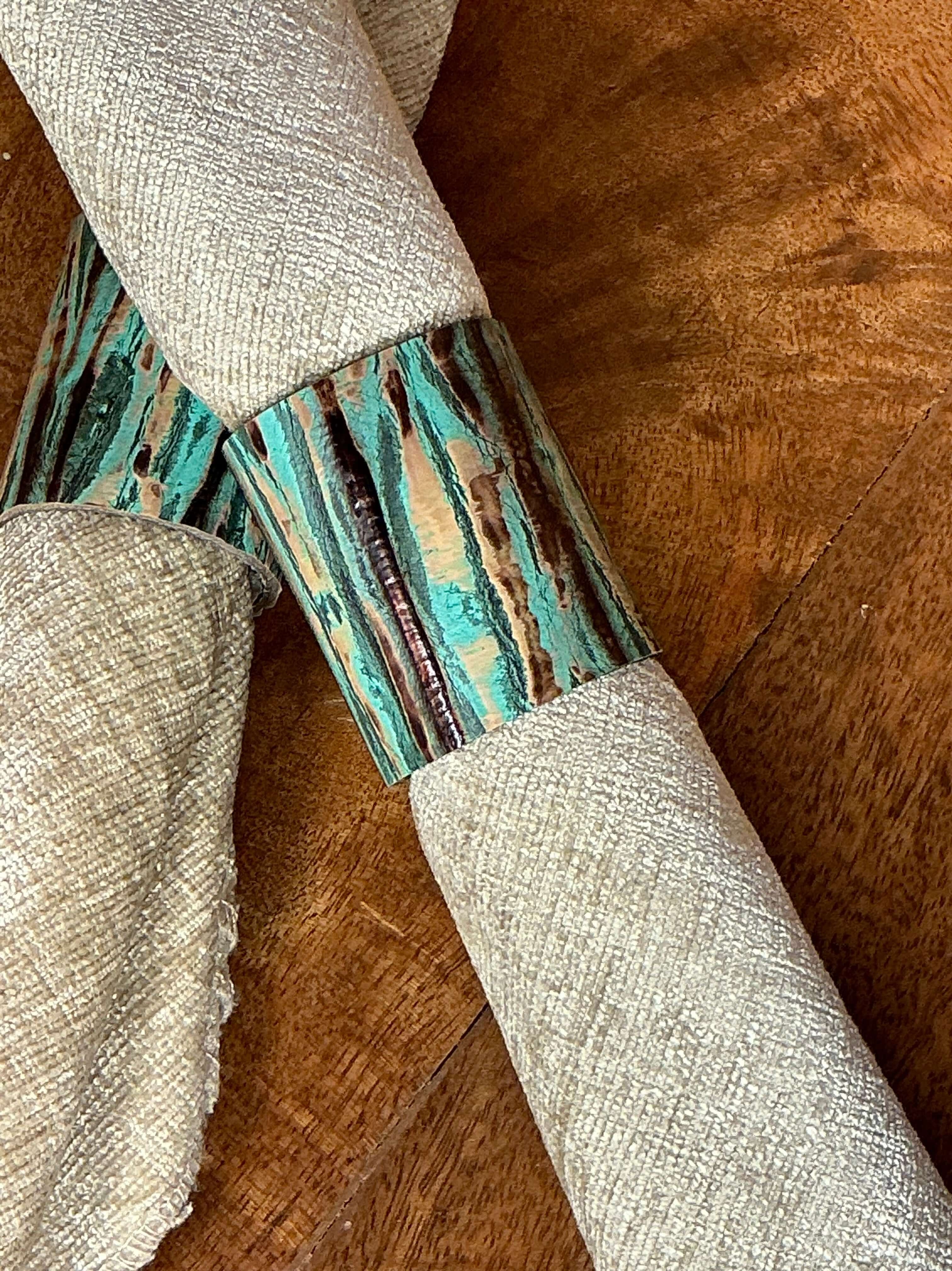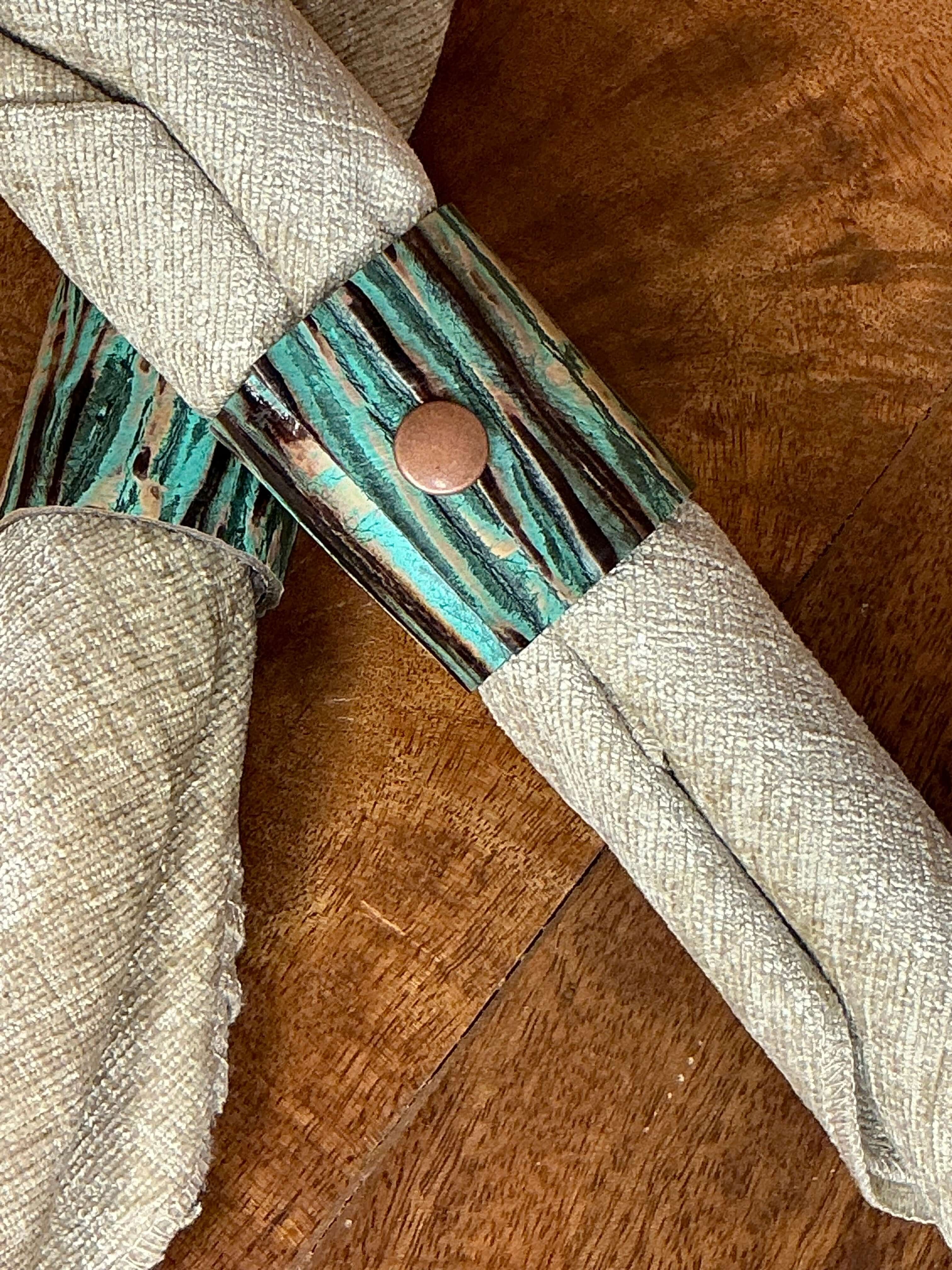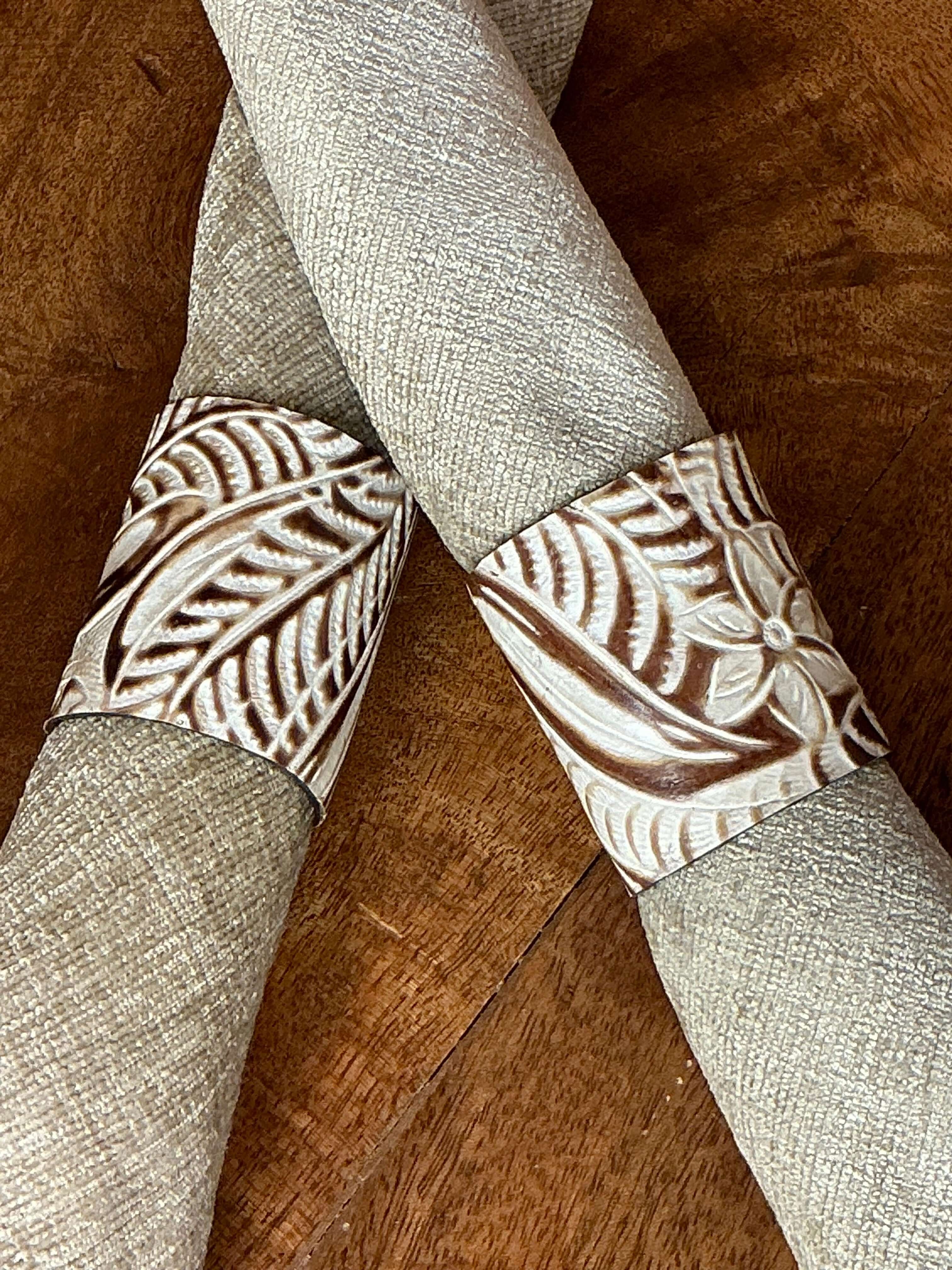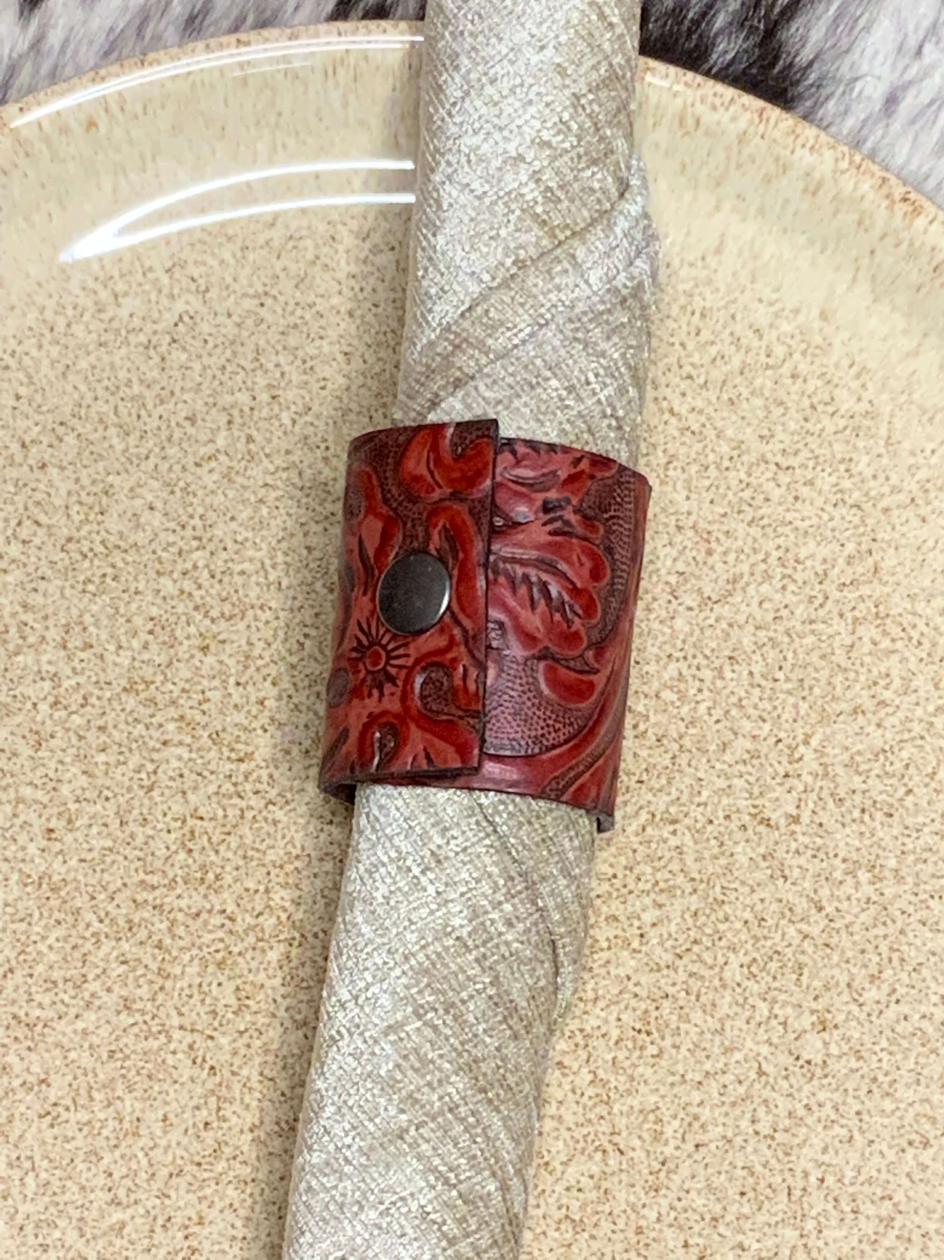 - What makes your leather napkin rings unique? Our napkin rings are unique because they are one-of-a-kind, artisanal accessories. The leather is personally selected and expertly finished by Charlyn Pacheco. The designs often feature details like hand-pressed patterns, subtle studs, or unique shapes that add a special touch to your table setting.