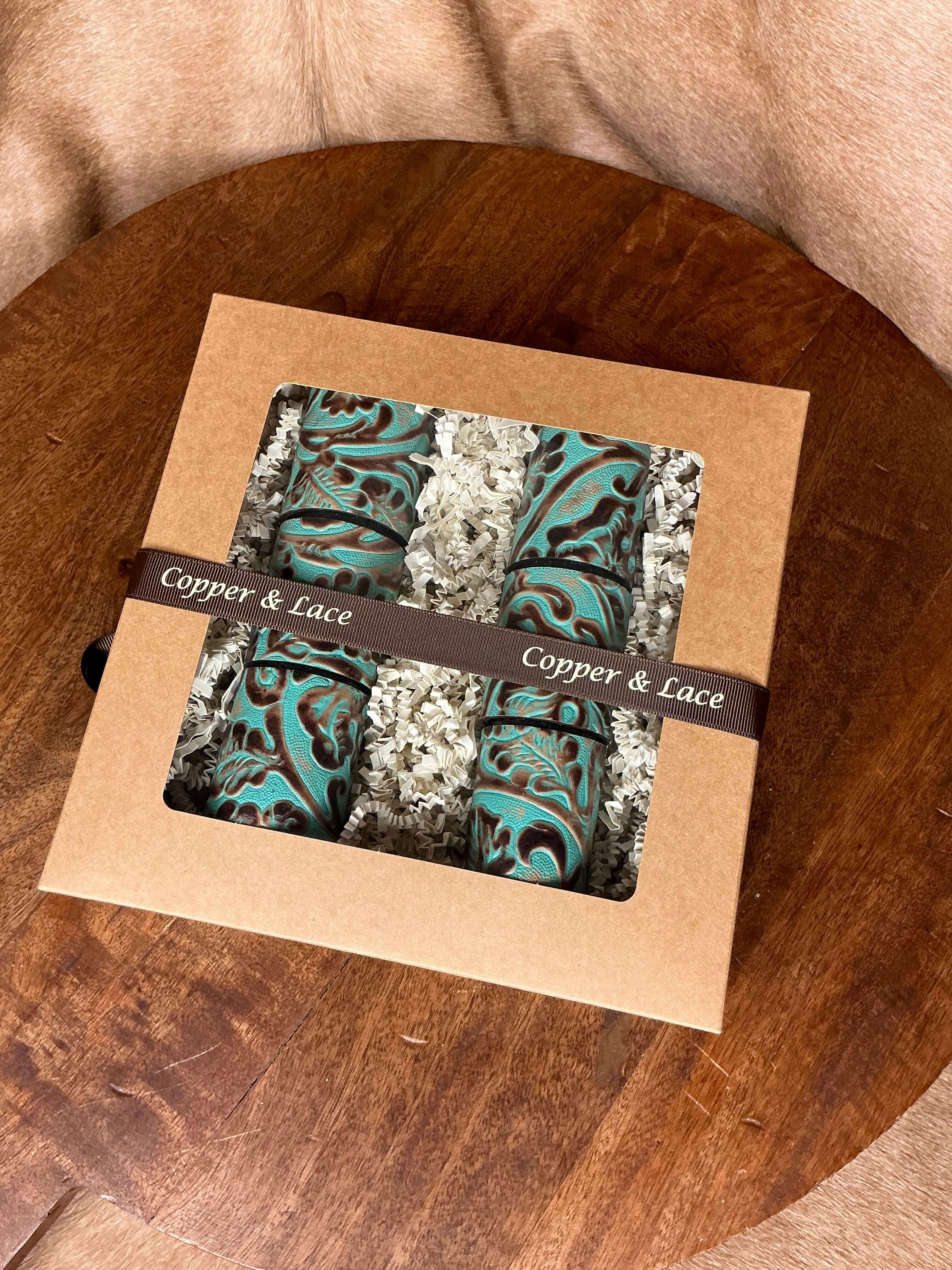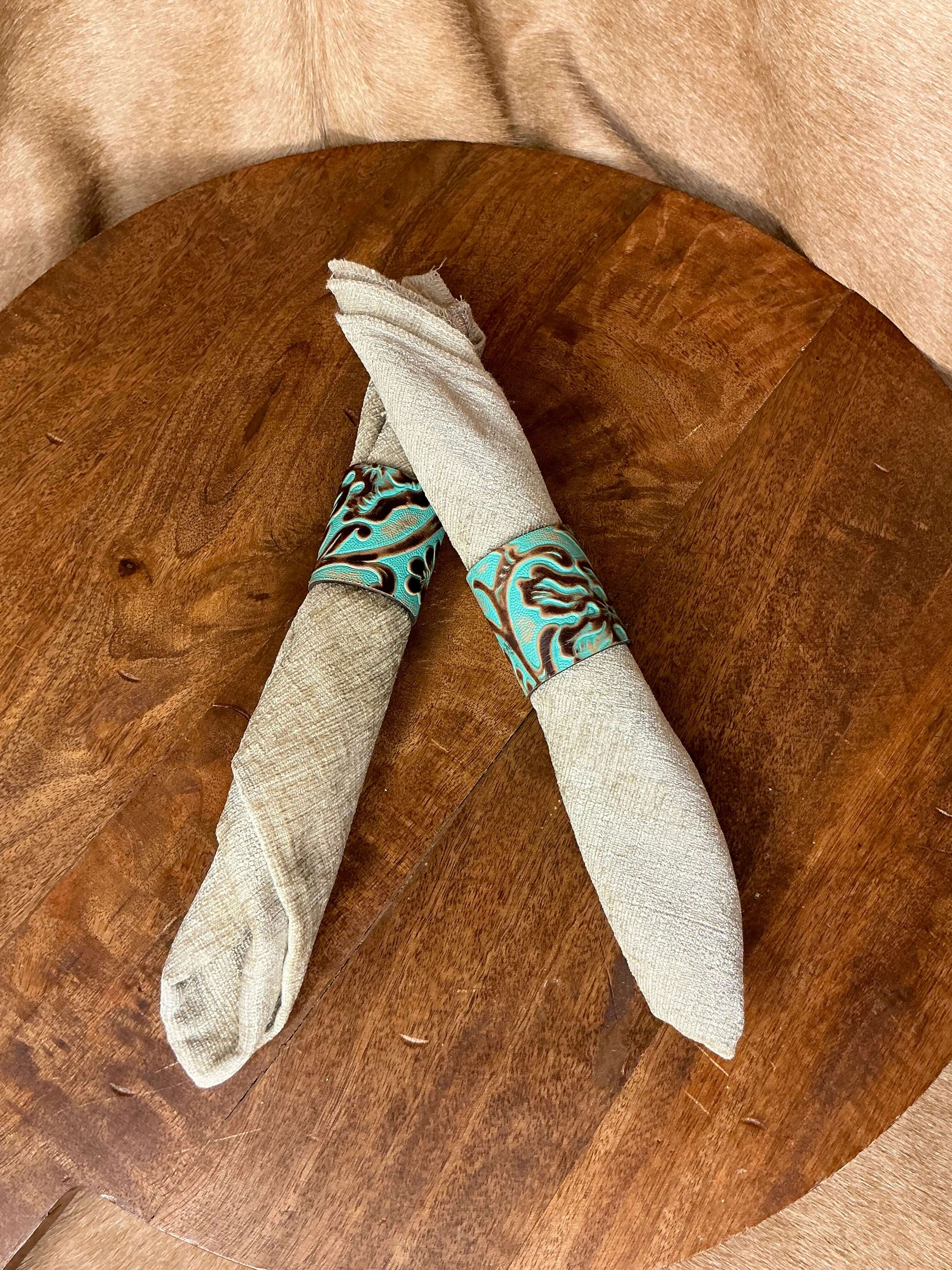 Add a touch of rustic elegance to your dining experience with these handcrafted embossed leather napkin rings, made right here in Paso Robles, CA. This set of 6 leather napkin rings features intricate embossing and snaps at the back for easy use, making them both stylish and functional. Perfect for dressing up any table setting, they bring a unique western charm to your gatherings. Whether you're hosting a dinner party or looking for a thoughtful birthday or hostess gift, these napkin rings are sure to impress. Crafted with care, they make a wonderful addition to any western-themed or rustic table décor.