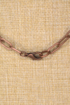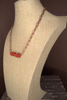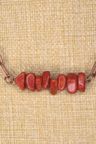 Crimson Mesa Bar Necklace — a handcrafted Copper & Lace Western Boutique original that radiates the warmth and strength of the West. Made in Paso Robles, California, this stunning piece features five natural Red Imperial Jasper free-form nuggets, each approximately ¼" x ¼", set along a 1½" copper bar and suspended from a coordinating copper link chain.