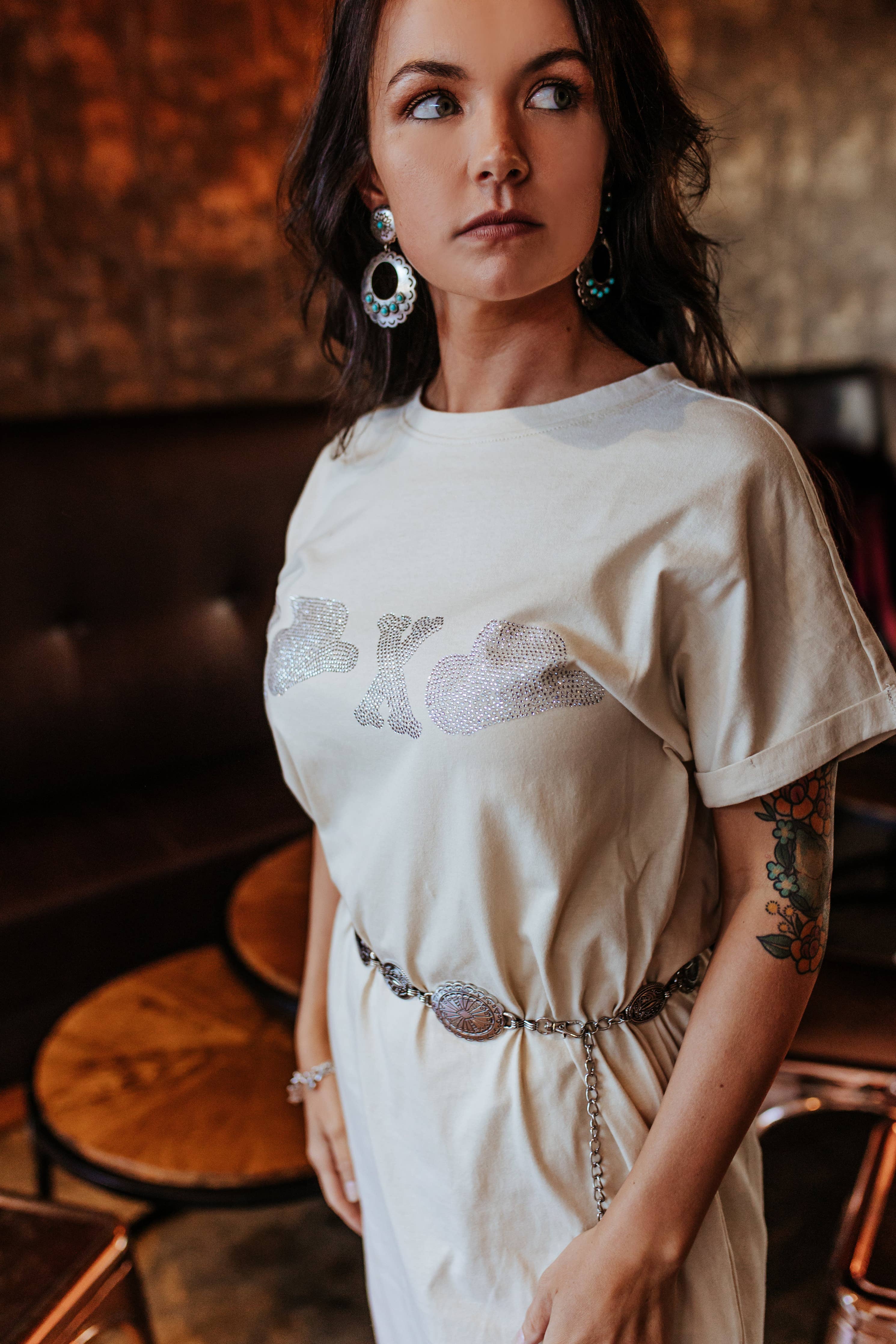 Effortless style with a western twist. This cream-colored t-shirt dress features shimmering sequin embroidery across the front, spelling out "XOXO" with playful cowboy hats as the O’s. The relaxed fit makes it easy to wear, while the sparkle detail adds just the right amount of flair.