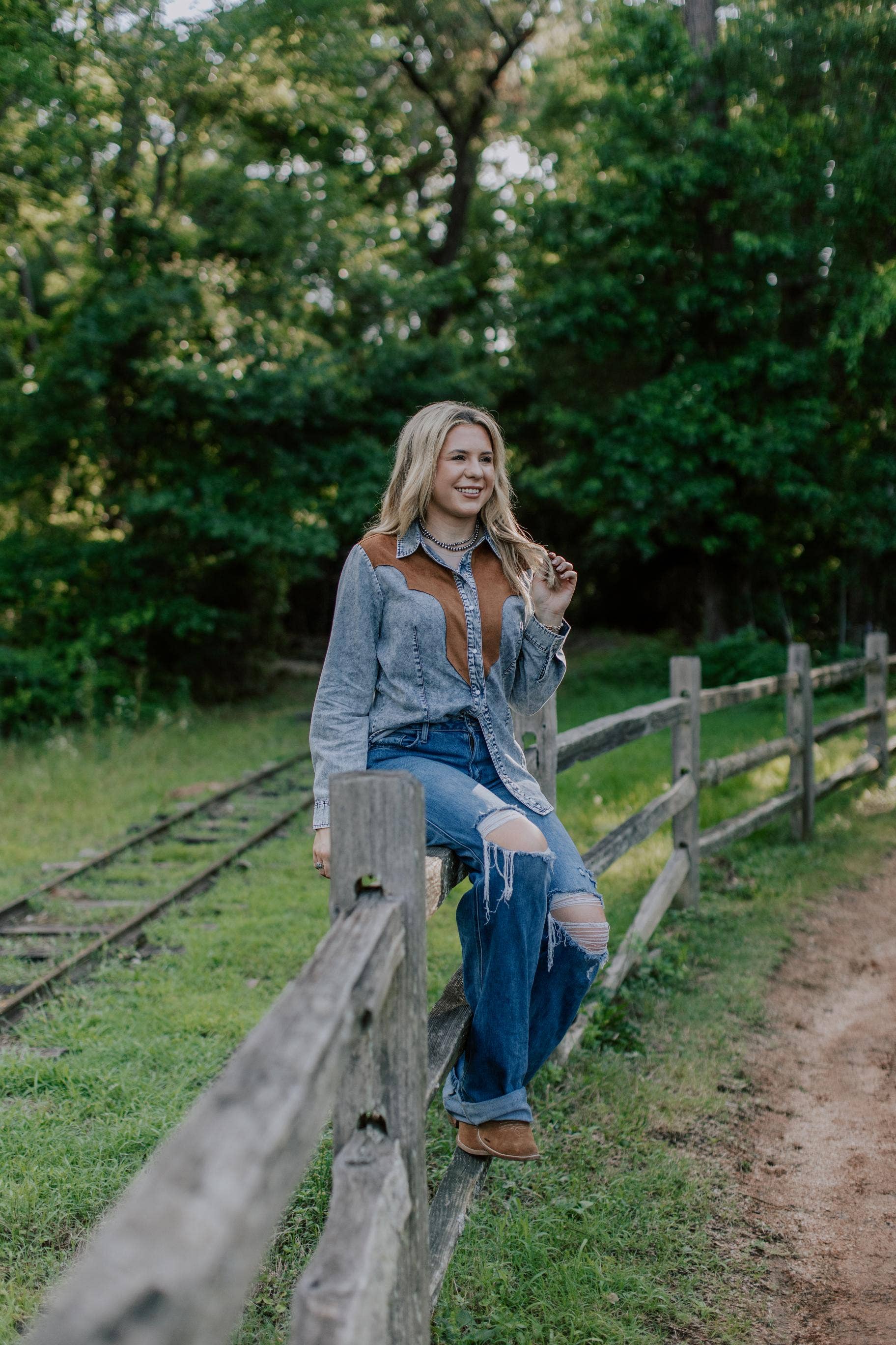 A timeless western staple with modern flair, this denim pearl snap shirt features a contrasting faux-suede yoke in rich caramel brown. Designed with classic pearl snaps down the front and at the cuffs, it’s the perfect blend of rugged and chic. Layer it over a tee for a laid-back look or dress it up with boots and jewelry for rodeo nights and concerts.