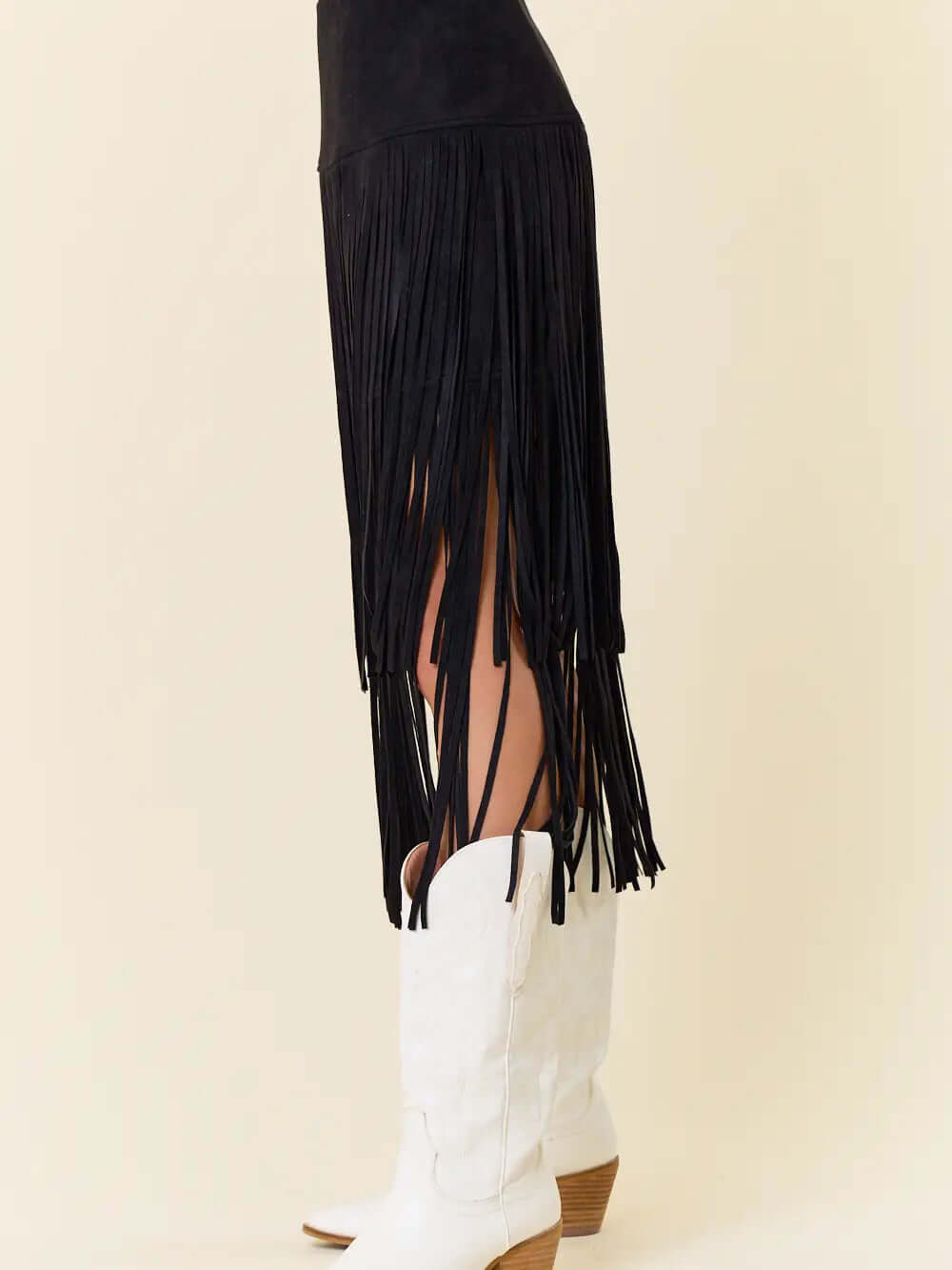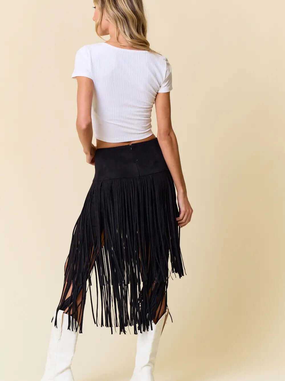 Embrace your wild side with this playful black fringed faux suede skirt, perfect for channeling boho-western vibes. The flowing fringe adds fun movement, making it ideal for rodeos, night outs, or date nights where you want to stand out. Designed in a flattering midi length, it pairs perfectly with cowgirl boots for an effortlessly stylish look. Whether you're heading to a party or a holiday event, this skirt brings a mix of western charm and modern flair to your wardrobe.