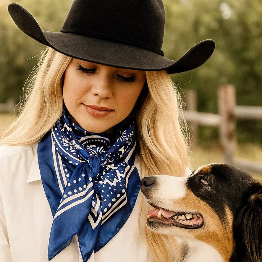 Our classic wild rag/scarf trimmed in blue with a floral paisley pattern. It is a square and measures 35" x 35". It is sure to add a bright pop of color to any outfit.
