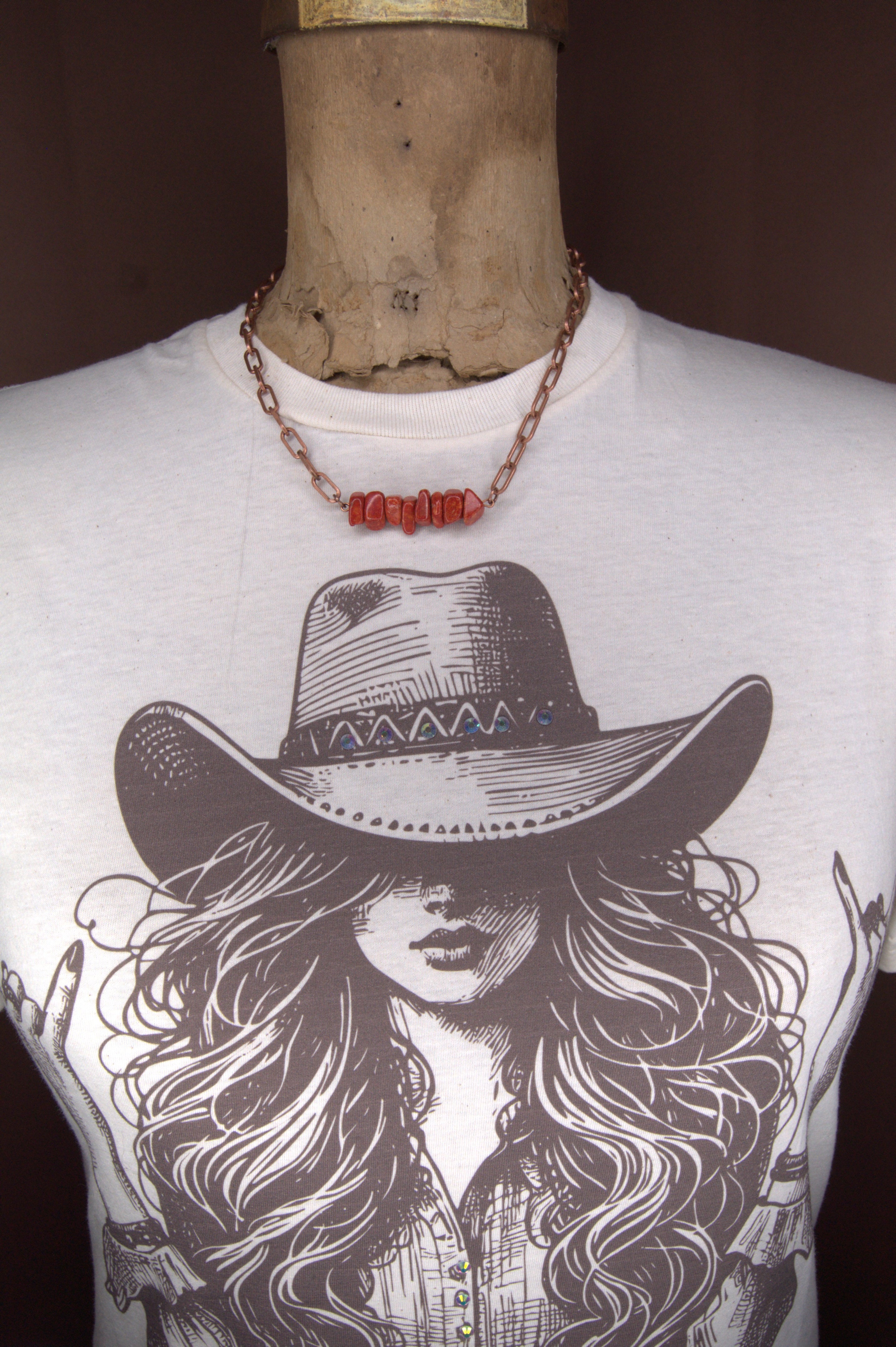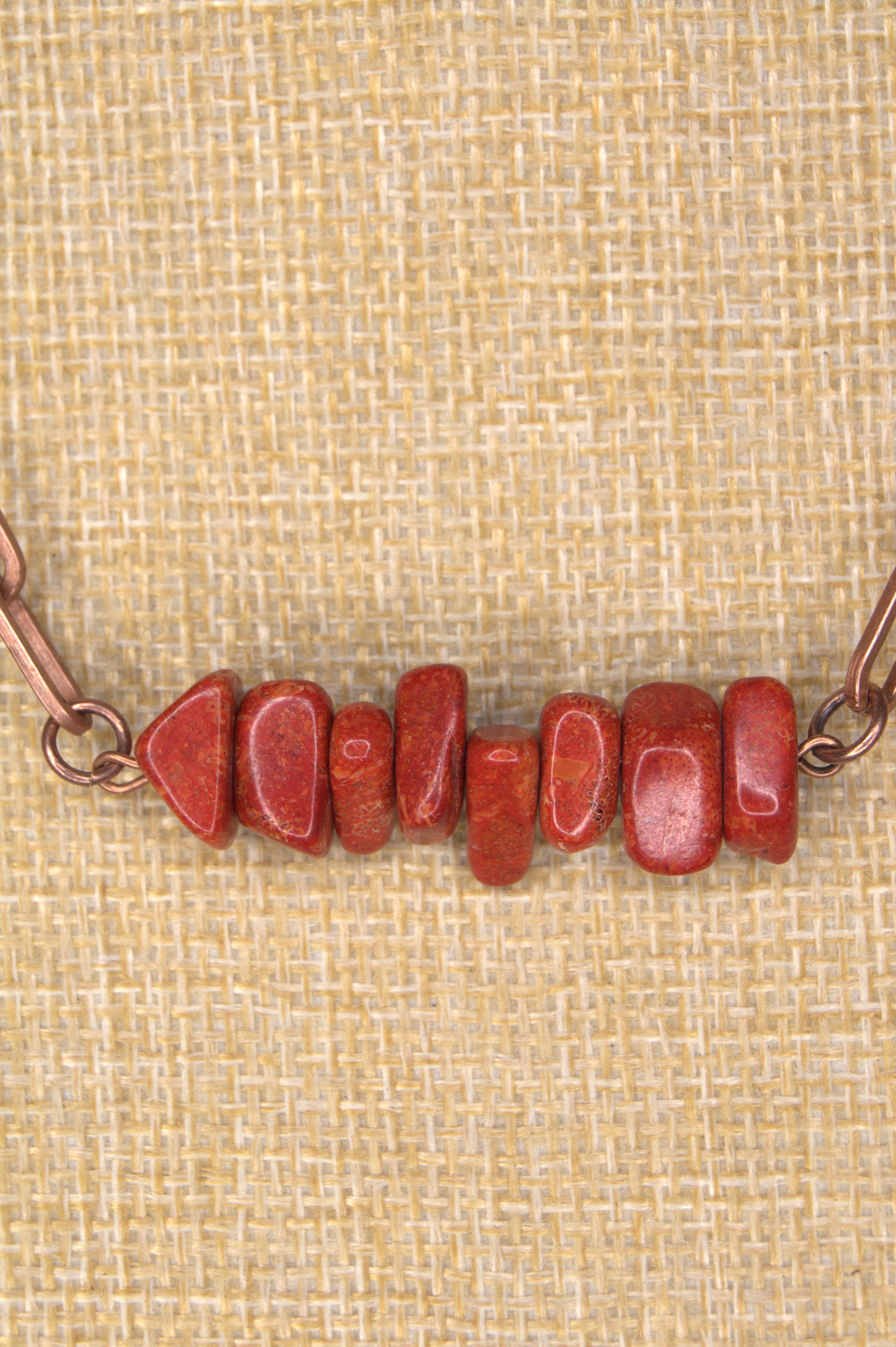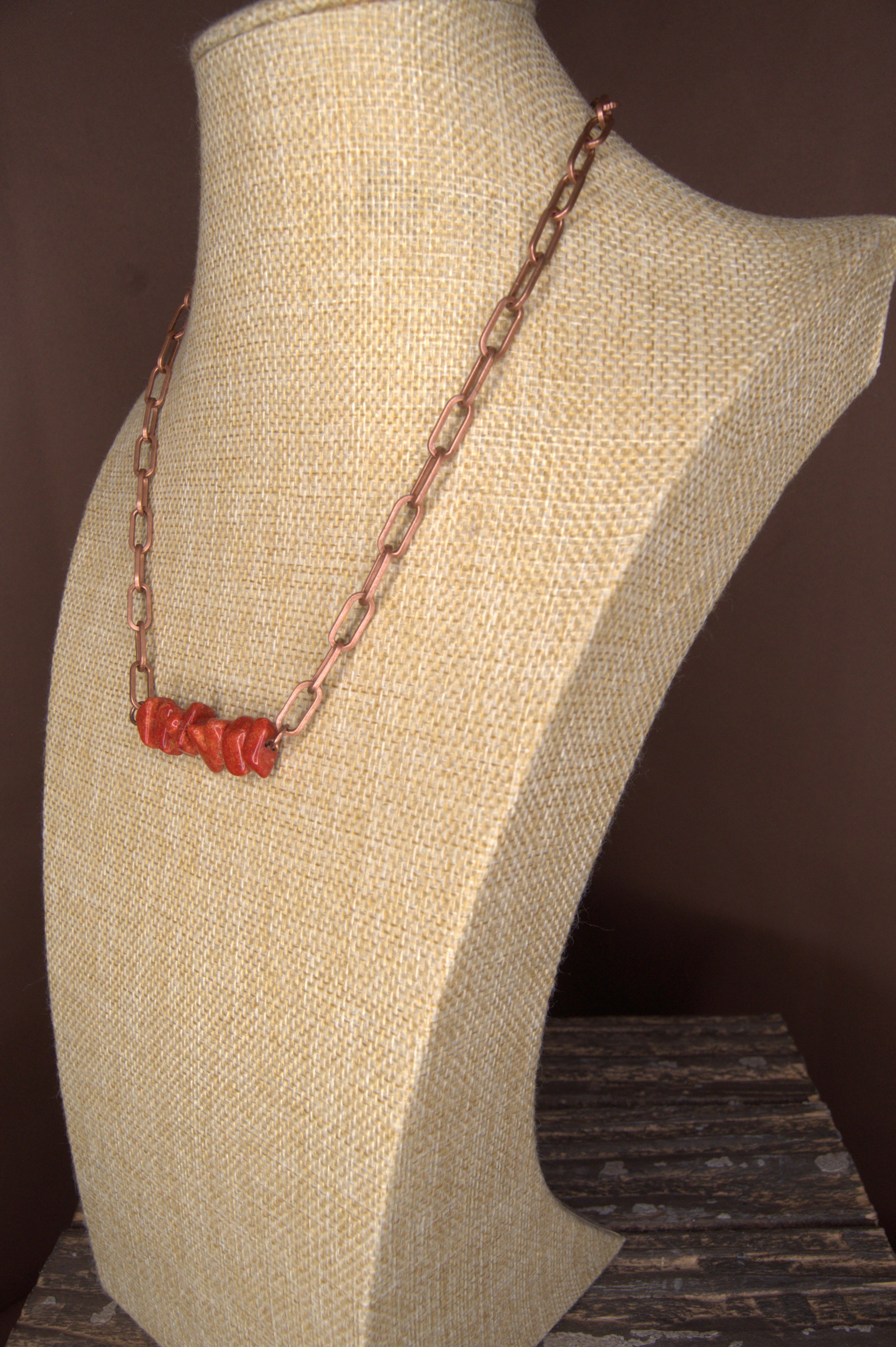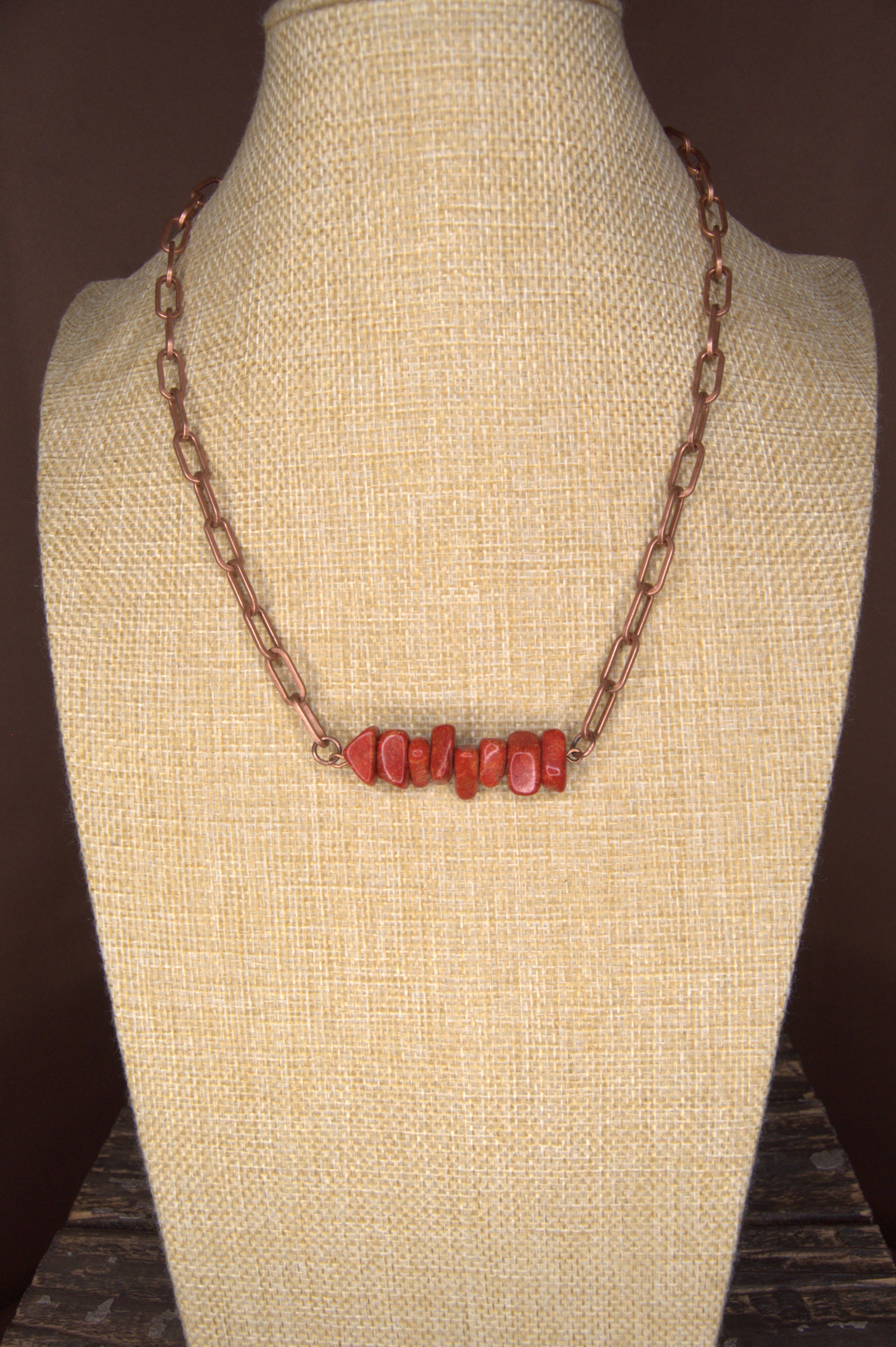 Crimson Mesa Bar Necklace — a handcrafted Copper & Lace Western Boutique original that radiates the warmth and strength of the West. Made in Paso Robles, California, this stunning piece features five natural Red Imperial Jasper free-form nuggets, each approximately ¼" x ¼", set along a 1½" copper bar and suspended from a coordinating copper link chain.