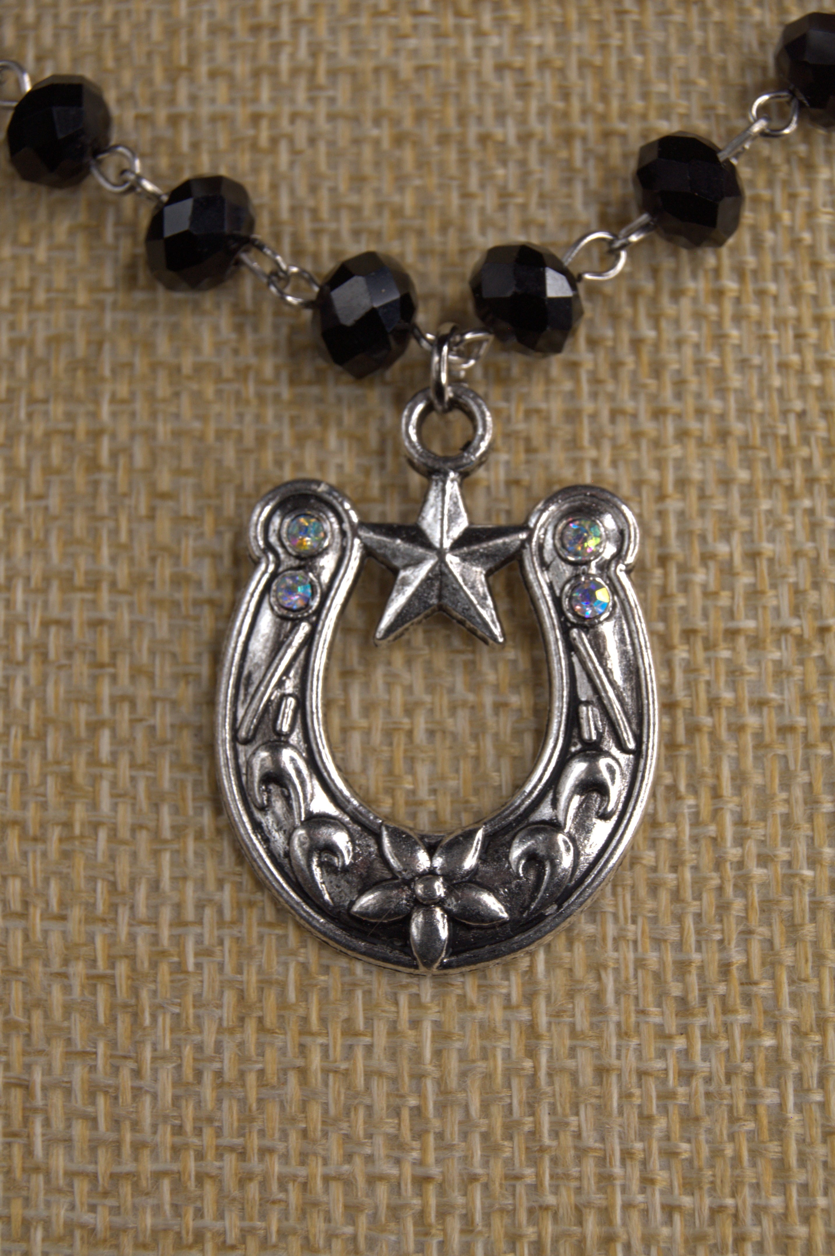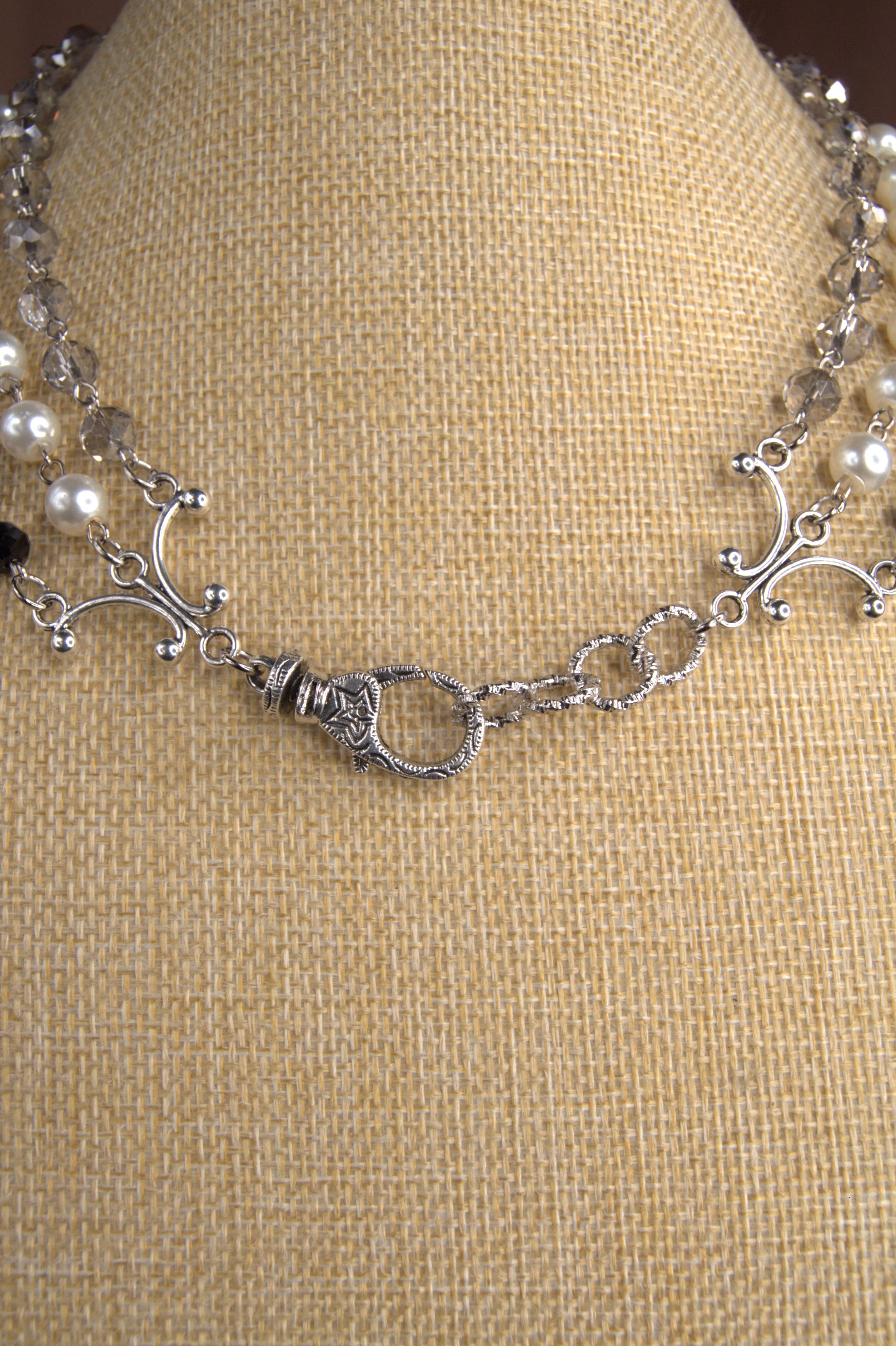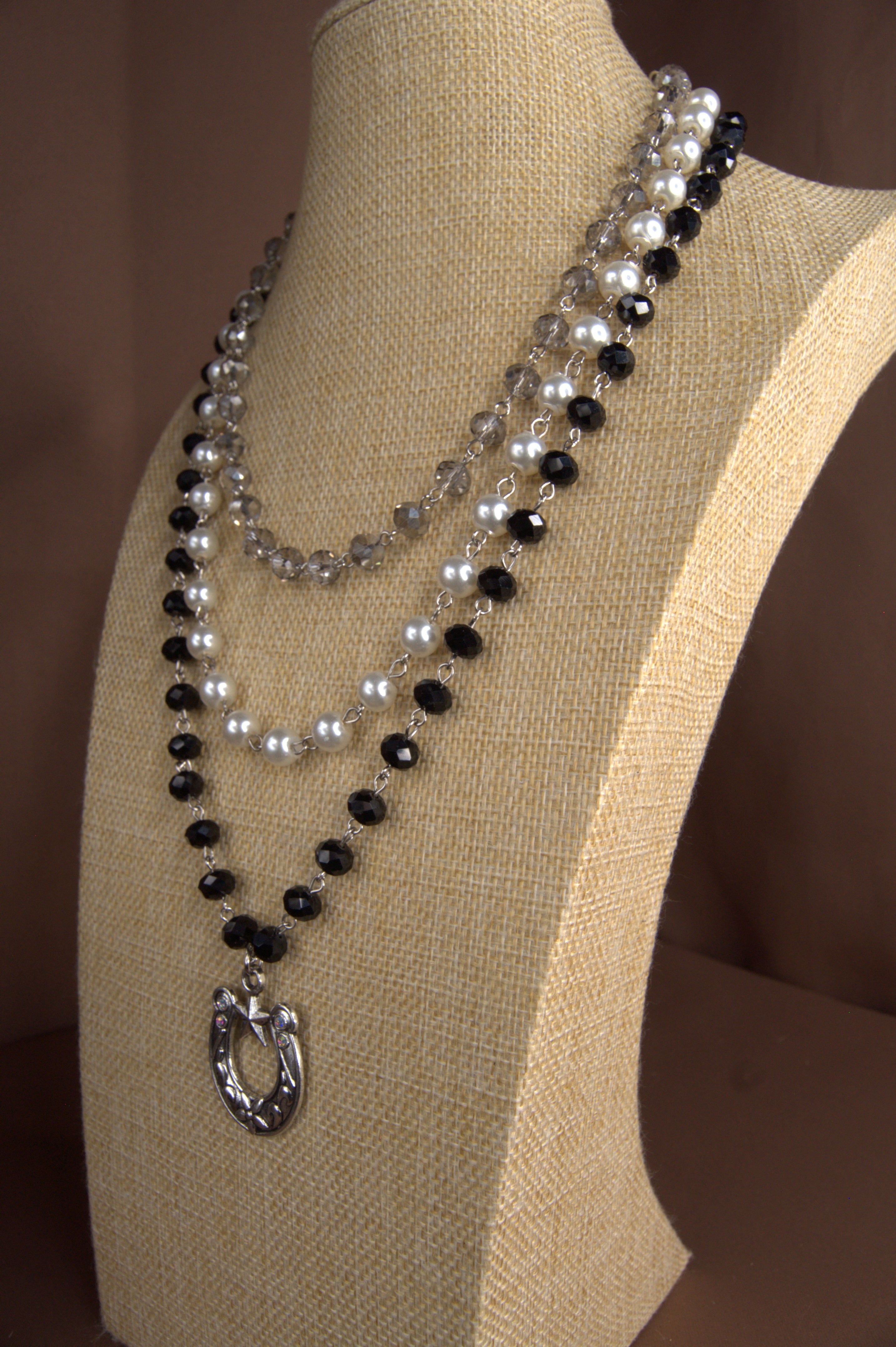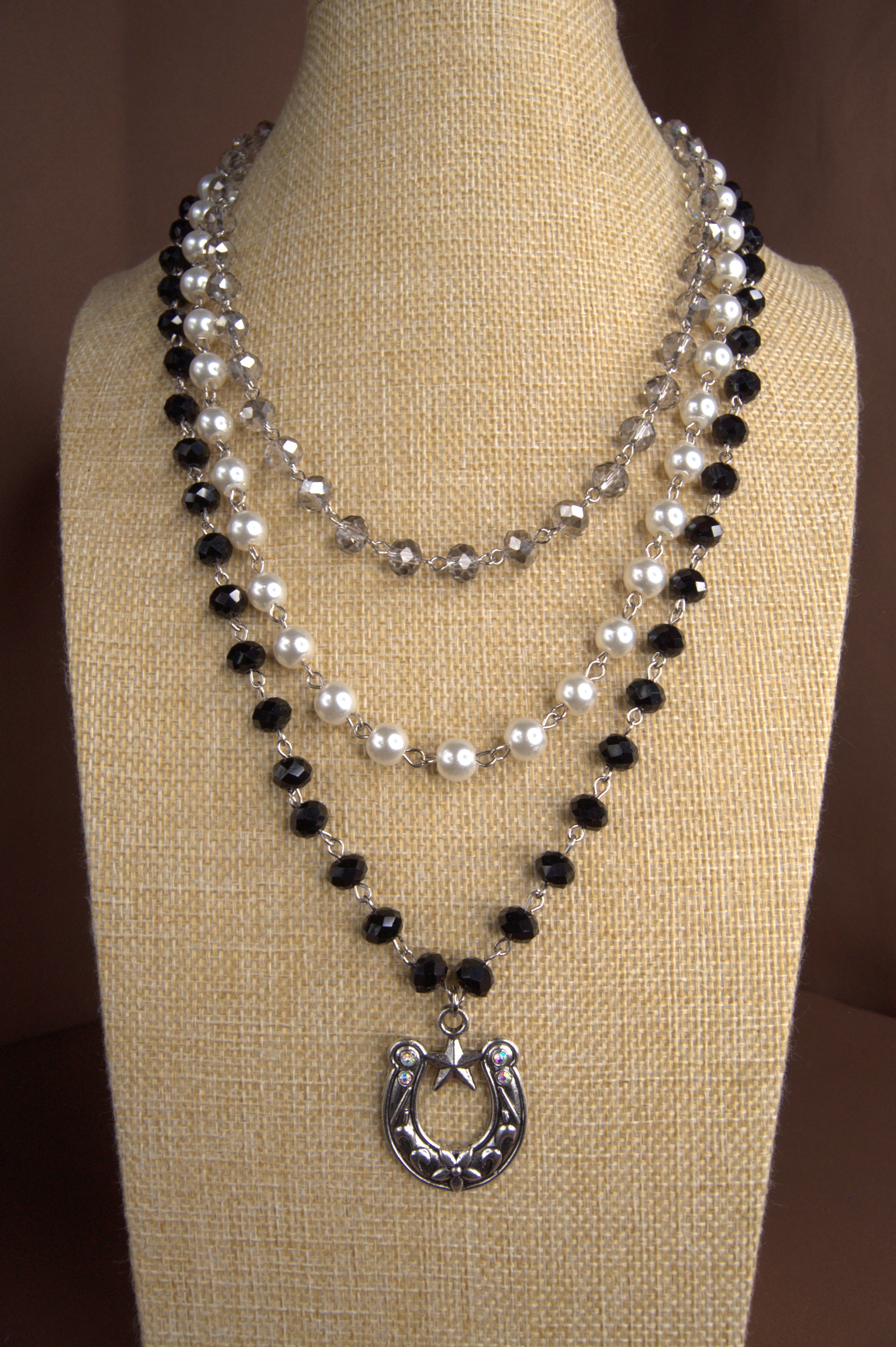 Josie Lucky Horseshoe 3-Strand Necklace – Grey Crystal, Imitation White Pearl & Black Crystal | Copper & Lace Handcrafted