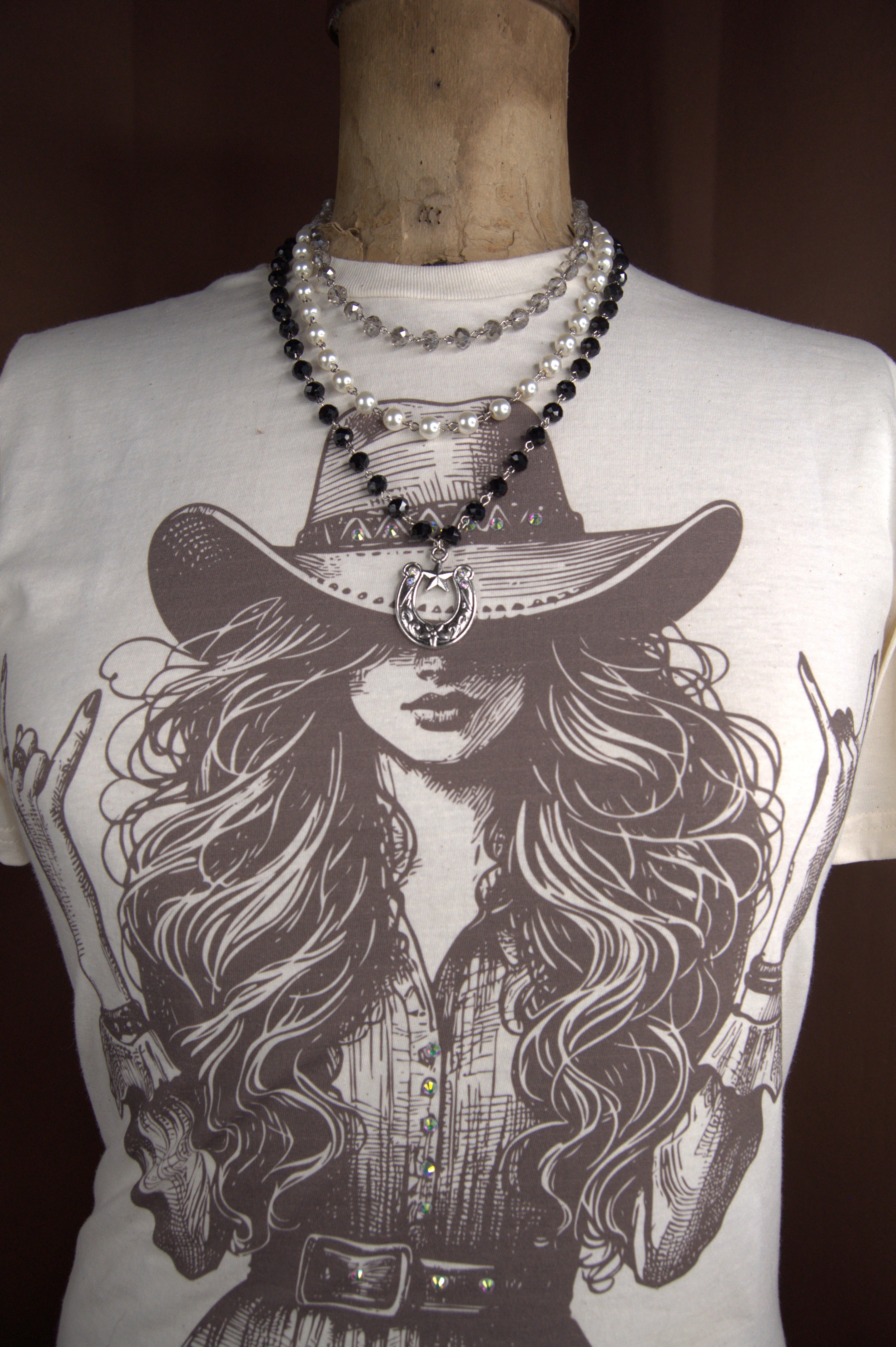 Meet Josie—western-chic sparkle with a touch of luck. Handcrafted by Copper & Lace, this layered three-strand design blends 8 mm grey glass crystals, 8 mm imitation white pearls, and 8 mm black glass crystals strung on sleek silver wire. A polished silver horseshoe pendant anchors the look—perfect solo or stacked with your everyday chains for rodeo nights, concerts, and dress-up days.