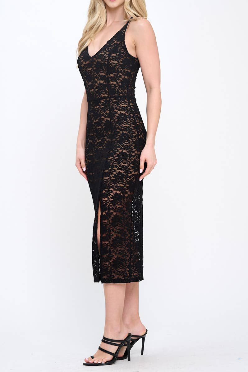 Flirty, polished, and ready to dance. The Escape Lace Midi Dress pairs a delicate lace overlay with a smooth nude full lining for coverage that still feels light. A V neckline, sleeveless tank silhouette, and a movement-friendly slit add just the right amount of flirt. Crafted from a flexible blend of 90% nylon / 10% spandex, it hugs without constricting—ideal for garden parties, date nights, and country concerts. Just add boots and a hat for effortless Western-boho charm.
