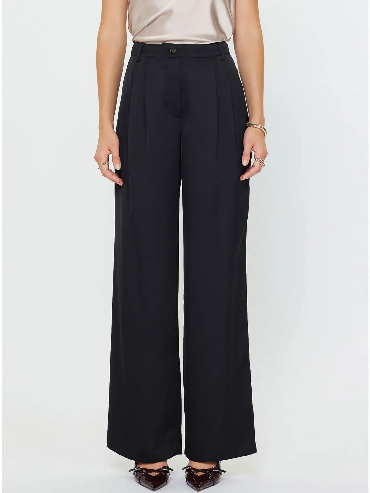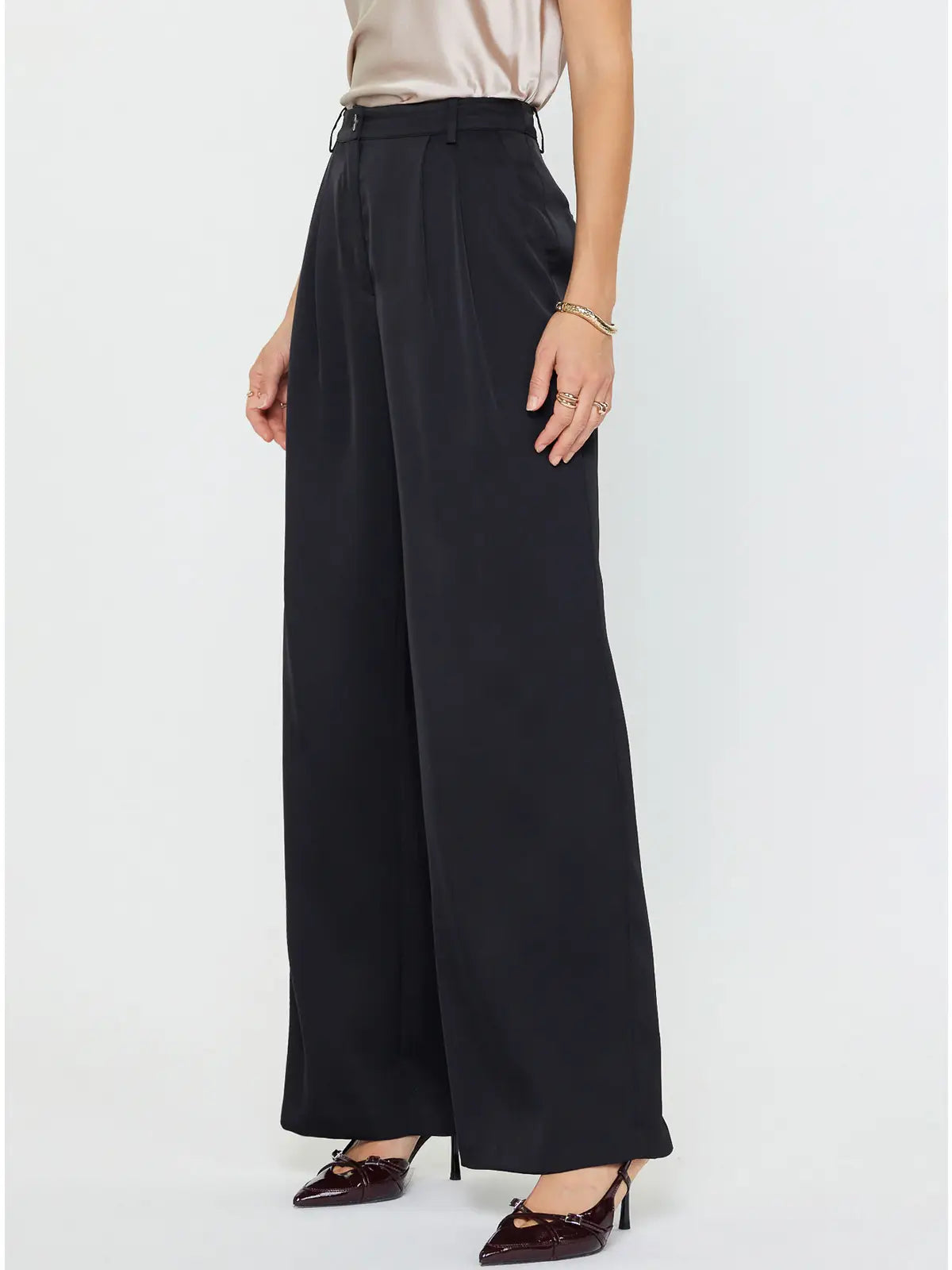 Fluid, satin-sheen trousers tailored with a high rise and elongating pintuck seams. The wide-leg silhouette drapes beautifully, pairing perfectly with the Midnight Rodeo Silky Tailored Jacket for a sleek set or styling solo for effortless polish.