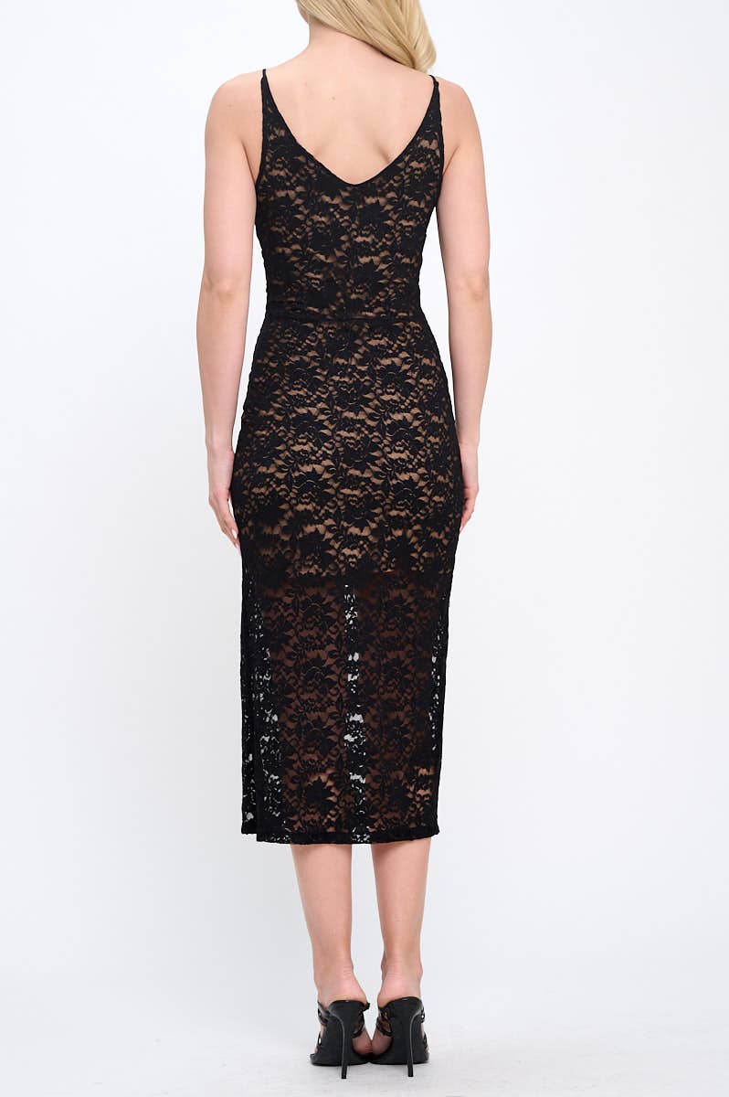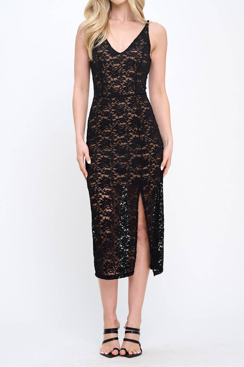 Escape Lace Fully Lined V-Neck Midi Dress – Nude | Made in USA