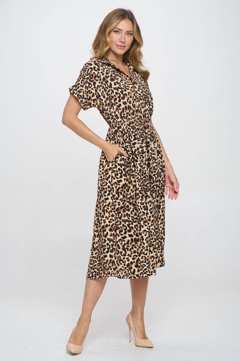Animal Print Collared V neck Dress with Pockets Short Sleeve elastic waist great with a belt from Copper & Lace Western Boutique to finish this amazing look off.