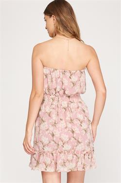 STRAPLESS WOVEN PRINT DRESS WITH SMOCKED WAIST