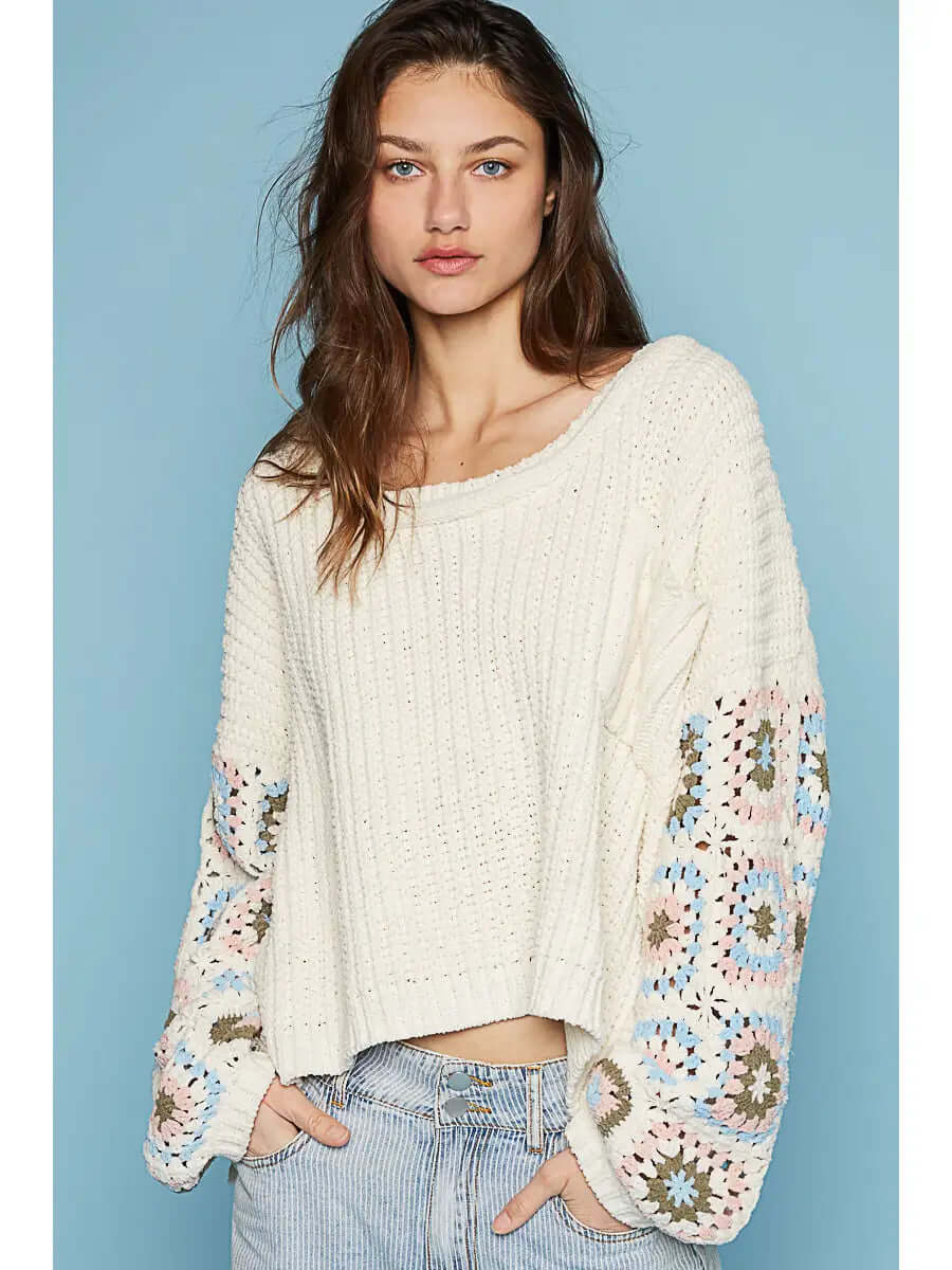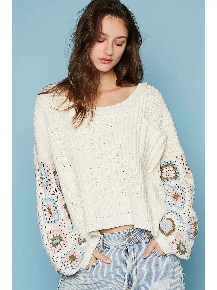 Oversize Hand Knit Square Patch Sleeve Chenille Sweater